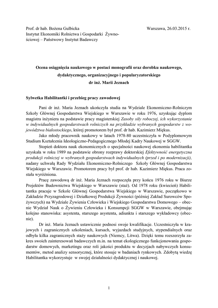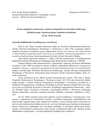 Prof. dr hab. Bożena Gulbicka Instytut Ekonomiki Rolnictwa i Gospodarki Żywnościowej – Państwowy Instytut Badawczy Warszawa, 26.03.2015 r. Ocena osiągnięcia naukowego w postaci monografii oraz dorobku naukowego, dydaktycznego, organizacyjnego i popularyzatorskiego dr inż. Marii Jeznach Sylwetka Habilitantki i przebieg pracy zawodowej Pani dr inż. Maria Jeznach ukończyła studia na Wydziale Ekonomiczno-Rolniczym Szkoły Głównej Gospodarstwa Wiejskiego w Warszawie w roku 1976, uzyskując dyplom magistra inżyniera na podstawie pracy magisterskiej Zasoby siły roboczej, ich wykorzystanie w indywidualnych gospodarstwach rolniczych na przykładzie wybranych gospodarstw z województwa białostockiego, której promotorem był prof. dr hab. Kazimierz Miękus. Jako młody pracownik naukowy w latach 1978-80 uczestniczyła w Podyplomowym Studium Kształcenia Ideologiczno-Pedagogicznego Młodej Kadry Naukowej w SGGW. Stopień doktora nauk ekonomicznych o specjalności naukowej ekonomia habilitantka uzyskała w roku 1989 na podstawie obrony rozprawy doktorskiej Efektywność energetyczna produkcji rolniczej w wybranych gospodarstwach indywidualnych (przed i po modernizacji), nadany uchwałą Rady Wydziału Ekonomiczno-Rolniczego Szkoły Głównej Gospodarstwa Wiejskiego w Warszawie. Promotorem pracy był prof. dr hab. Kazimierz Miękus. Praca została wyróżniona. Pracę zawodową dr inż. Maria Jeznach rozpoczęła przy końcu 1976 roku w Biurze Projektów Budownictwa Wiejskiego w Warszawie (staż). Od 1978 roku (kwiecień) Habilitantka pracuje w Szkole Głównej Gospodarstwa Wiejskiego w Warszawie, początkowo w Zakładzie Przyzagrodowej i Działkowej Produkcji Żywności (później Zakład Surowców Spożywczych) na Wydziale Żywienia Człowieka i Wiejskiego Gospodarstwa Domowego – obecnie Wydział Nauk o Żywieniu Człowieka i Konsumpcji SGGW w Warszawie, obejmując kolejno stanowiska: asystenta, starszego asystenta, adiunkta i starszego wykładowcy (obecnie). Dr inż. Maria Jeznach ustawicznie podnosi swoje kwalifikacje. Uczestniczyła w krajowych i zagranicznych szkoleniach, kursach, wyjazdach studyjnych, stypendialnych oraz odbyła kilka zagranicznych staży naukowych (Niemcy, Litwa). Dzięki temu rozszerzyła zakres swoich zainteresowań badawczych m.in. na temat ekologicznego funkcjonowania gospodarstw domowych, marketingu oraz roli jakości produktu w decyzjach nabywczych konsumentów, metod analizy sensorycznej, które stosuje w badaniach rynkowych. Zdobytą wiedzę Habilitantka wykorzystuje w swojej działalności dydaktycznej i naukowej. 1 Osiągnięcie naukowe Osiągnięciem naukowym wynikającym z art. 16, ust. 2, ustawy z dnia 14 marca 2003 r. o stopniach i tytułach naukowych oraz o stopniach i tytułach w zakresie sztuki (Dz. U. nr 65, poz. 505 ze zm.) wyznaczonym przez dr inż. Marię Jeznach jest monografia: Jakość żywności i jej wyróżniki w ocenie konsumentów, wydawnictwo SGGW, Warszawa 2014. Praca obejmuje 124 strony, 52 tabele, 34 rysunki i bibliografię liczącą 205 pozycji literatury przedmiotu. Na wstępie należy podkreślić dużą wagę tematyki rozprawy habilitacyjnej dotyczącej jakości żywności. Badania dotyczące zachowań konsumentów na rynku żywności rozwijają się w ostatnich latach intensywnie, szczególnie w krajach zachodnich, a w mniejszym stopniu w Polsce. Biorą w nich udział technolodzy żywności (walory sensoryczne), specjaliści w zakresie żywienia człowieka (walory zdrowotne), a z drugiej strony marketingowcy. Połączenie tych dwóch obszarów jest szczególnie korzystne zarówno dla konsumentów i producentów. Celem naukowym pracy była identyfikacja wyróżników jakości produktów żywnościowych i ich roli w procesie decyzyjnym konsumenta. Analizie poddano produkty żywnościowe pod względem cech jakości postrzeganych przez nabywców, na podstawie materiału empirycznego (pierwotny i wtórny) oraz literatury przedmiotu. Na podstawie badań własnych dotyczących znaczenia czynników kształtujących zachowania nabywcze konsumentów Habilitantka sformułowała tezę, że jakość żywności produktu spożywczego jest wieloelementowym zbiorem oczekiwań konsumentów wobec żywności, które są wynikiem dotychczasowych doświadczeń oraz wyobrażeń odnośnie jakości. W zasadzie wszystko to, czego oczekuje konsument od określonego produktu stanowi o jego jakości oczekiwanej. Przy wyborze produktów żywnościowych ujawniają się indywidualne upodobania i preferencje konsumentów i różne czynniki wpływające na nie. Autorka przyjęła następującą hipotezę główną: Jakość żywności postrzegana jest przez konsumentów jako zespół cech, którymi powinien charakteryzować się określony produkt, przy czym ważność tych cech nie jest dla wszystkich taka sama, lecz zależy od profilu socjo-demograficznego poszczególnych konsumentów, jak również od rodzaju produktu, którego dotyczy. Podjęto również próbę weryfikacji następujących hipotez szczegółowych: Dominującym wyróżnikiem jakości większości produktów żywnościowych jest świeżość, zwłaszcza w odniesieniu do tych rodzajów żywności, które konsumenci często kupują w formie niezapakowanej, Cena jest ważnym wyróżnikiem jakości, a główną determinantą takiego jej postrzegania jest sytuacja finansowa konsumentów. Na konsumenckie postrzeganie jakości w jej kompleksowym ujęciu wpływają poza cechami socjo-demograficznymi charakteryzującymi konsumenta takie zmienne, jak ocena stanu zdrowia oraz sposobu odżywiania. Założono, że jakość żywności jest ważnym kryterium jej wyboru, a więc konieczne było poszukiwanie takich jej cech, które są istotne przy wyborze produktów żywnościowych przez konsumenta, gdyż w rezultacie mają one wpływ na jego żywienie i zdrowie. Dokonywane wybory są uwarunkowane wpływem wielu czynników dlatego konieczna jest znajomość zachowań konsumentów i czynników je waru