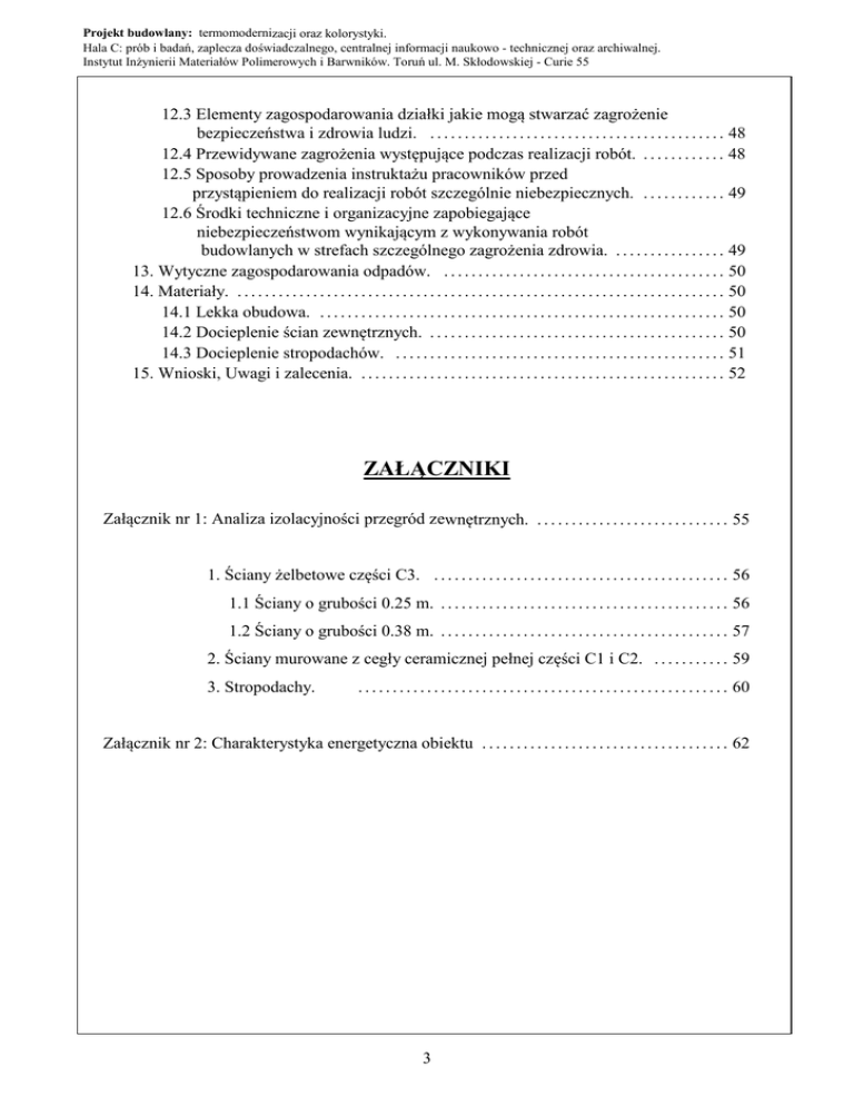 Projekt budowlany: termomodernizacji oraz kolorystyki. Hala C: prób i badań, zaplecza doświadczalnego, centralnej informacji naukowo - technicznej oraz archiwalnej. Instytut Inżynierii Materiałów Polimerowych i Barwników. Toruń ul. M. Skłodowskiej - Curie 55 12.3 Elementy zagospodarowania działki jakie mogą stwarzać zagrożenie bezpieczeństwa i zdrowia ludzi. . . . . . . . . . . . . . . . . . . . . . . . . . . . . . . . . . . . . . . . . . . . 48 12.4 Przewidywane zagrożenia występujące podczas realizacji robót. . . . . . . . . . . . . 48 12.5 Sposoby prowadzenia instruktażu pracowników przed przystąpieniem do realizacji robót szczególnie niebezpiecznych. . . . . . . . . . . . . 49 12.6 Środki techniczne i organizacyjne zapobiegające niebezpieczeństwom wynikającym z wykonywania robót budowlanych w strefach szczególnego zagrożenia zdrowia. . . . . . . . . . . . . . . . . 49 13. Wytyczne zagospodarowania odpadów. . . . . . . . . . . . . . . . . . . . . . . . . . . . . . . . . . . . . . . . . . 50 14. Materiały. . . . . . . . . . . . . . . . . . . . . . . . . . . . . . . . . . . . . . . . . . . . . . . . . . . . . . . . . . . . . . . . . . . . . . . . 50 14.1 Lekka obudowa. . . . . . . . . . . . . . . . . . . . . . . . . . . . . . . . . . . . . . . . . . . . . . . . . . . . . . . . . . . . 50 14.2 Docieplenie ścian zewnętrznych. . . . . . . . . . . . . . . . . . . . . . . . . . . . . . . . . . . . . . . . . . . . 50 14.3 Docieplenie stropodachów. . . . . . . . . . . . . . . . . . . . . . . . . . . . . . . . . . . . . . . . . . . . . . . . . 51 15. Wnioski, Uwagi i zalecenia. . . . . . . . . . . . . . . . . . . . . . . . . . . . . . . . . . . . . . . . . . . . . . . . . . . . . . 52 ZAŁĄCZNIKI Załącznik nr 1: Analiza izolacyjności przegród zewnętrznych. . . . . . . . . . . . . . . . . . . . . . . . . . . . . 55 1. Ściany żelbetowe części C3. . . . . . . . . . . . . . . . . . . . . . . . . . . . . . . . . . . . . . . . . . . . 56 1.1 Ściany o grubości 0.25 m. . . . . . . . . . . . . . . . . . . . . . . . . . . . . . . . . . . . . . . . . . . 56 1.2 Ściany o grubości 0.38 m. . . . . . . . . . . . . . . . . . . . . . . . . . . . . . . . . . . . . . . . . . . 57 2. Ściany murowane z cegły ceramicznej pełnej części C1 i C2. . . . . . . . . . . . 59 3. Stropodachy. . . . . . . . . . . . . . . . . . . . . . . . . . . . . . . . . . . . . . . . . . . . . . . . . . . . . . . 60 Załącznik nr 2: Charakterystyka energetyczna obiektu . . . . . . . . . . . . . . . . . . . . . . . . . . . . . . . . . . . . 62 3 Projekt budowlany: termomodernizacji oraz kolorystyki. Hala C: prób i badań, zaplecza doświadczalnego, centralnej informacji naukowo - technicznej oraz archiwalnej. Instytut Inżynierii Materiałów Polimerowych i Barwników. Toruń ul. M. Skłodowskiej - Curie 55 SPIS RYSUNKÓW Rys. nr 1/12 Plan sytuacyjny. skala 1 : 500 Rys. nr 2/12 Schemat lekkiej obudowy, zestawienie okien, drzwi i wrót. skala 1 : 200 Rys. nr 3/12 Schemat lekkiej obudowy: elewacje południowo - zachodnie. skala 1 : 100 Rys. nr 4/12 Schemat lekkiej obudowy: elewacje północno - wschodnie. skala 1 : 100 Rys. nr 5/12 Schemat lekkiej obudowy: elewacje północno - zachodnie. skala 1 : 100 Rys. nr 6/12 Schemat lekkiej obudowy: elewacje południowo - wschodnie. skala 1 : 100 Rys. nr 7/12 Lekka obudowa - hala C część C1: przekroje przez ściany zewnętrzne 7-7, 8-8, 9-9 w osiach nr 7/O-P, P/3-7, 3/N-O-P. skala 1 : 25 Rys. nr 8/12 Lekka obudowa - hala C część C3: przekroje przez ściany zewnętrzne 10-10, 11-11, 12-12, 13-13 w osiach nr 7/O-P, P/3-7, 3/N-O-P. skala 1 : 25 Rys. nr 8/12 Lekka obudowa - hala C część C3: przekroje przez ściany zewnętrzne 10-10, 11-11, 12-12, 13-13 w osiach nr 7/M-N, 5/M-N, 5/N"-O, O/5-7, M/5-7. skala 1 : 25 Rys. nr 9/12 Lekka obudowa - hala C część C2: przekroje przez ściany zewnętrzne 1-1, 2-2, 3-3, 4-4, 5-5, 6-6 w osiach nr 1/L'-Ł, 1/Ł"-N, L'/2-6, L'/6-7 7/Ł-M, 7/L'-L, N/1-3/7. skala 1 : 25 Rys. nr 10/12 Schemat lekkiej obudowy: szczegóły. skala 1 : 5 Rys. nr 11/12 Schemat lekkiej obudowy: zestawienia płyt GLs, GLws i GLj oraz obróbek blacharskich. Rys. nr 12/12 Kolorystyka. skala 1 : 200 4 Przedsiębiorstwo Usługowo Budowlane "KONSBUD - TORUŃ" 87 - 100 Toruń ul. Rubinowa 3 telefon: (056) 62 - 35 - 507 kom. 605 - 120 - 942 Symbol opracowania nr 6/11 PROJEKT BUDOWLANY termomodernizacji oraz kolorystyki. - Obiekt: Hala C: prób i badań, zaplecza doświadczalnego, centralnej informacji naukowo - technicznej oraz archiwalnej. - Adres obiektu: Toruń ul. M. Skłodowskiej - Curie 55 - Inwestor: Instytut Inżynierii Materiałów Polimerowych i Barwników w Toruniu Funkcja: Imię i nazwisko: Projektant termomodernizacji: mgr inż. KRZYSZTOF UŹDZIŃSKI Projektant kolorystyki: mgr inż. arch. JOLANTA CZYŻOWICZ Sprawdzający: mgr inż. MAREK JAWORSKI upr nr. UAN - IV - 8346 / 46 / TO / 88 upr nr. GPZ-KZ-7342/195/94 upr nr. UAN - KZ - 7210 /315// 88 Data: Toruń : 30.06. 2011 r. Podpis: PROJEKT BUDOWLANY termomodernizacji oraz kolorystyki. Hala C: prób i badań, zaplecza doświadczalnego, centralnej informacji naukowo - technicznej oraz archiwalnej. Toruń, ul. M. Skłodowskiej - Curie 55 1. INFORMACJE WSTĘPNE. - Obiekt: Hala C: prób i badań, zaplecza doświadczalnego, centralnej informacji naukowo - technicznej oraz archiwalnej. - Adres obiektu: Toruń ul. M. Skłodowskiej - Curie 55 - Inwestor: Instytut Inżynierii Materiałów Polimerowych i Barwników w Toruniu. 2. PODSTAWA OPRACOWANIA. - Umowa o dzieło nr 1/UZF/2/4/2011 z dnia 08.04.2011 r. - Oględziny i ocena stanu technicznego ścian zewnętrznych Hali C przy ul. M. Skłodowskiej - Curie 55 w Toruniu wykonane przez autora niniejszego opracowania w maju 2011 r. - Audyt energetyczny Hali C przy ul. M. Skłodowskiej - Curie 55 w Toruniu opracowany przez P.U.B. "Konsbud - Toruń" w czerwcu 2011 r, audytor: mgr inż. G. Lubieniecki. - Projekt architektoniczno budowlany Bu