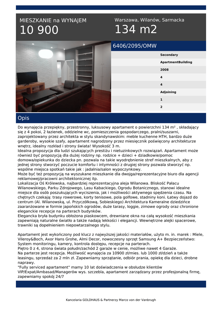 MIESZKANIE na WYNAJEM 10 900 Warszawa, Wilanów, Sarmacka 134 m2 6406/2095/OMW Secondary ApartmentBuilding 2008 4 4 Adjoining 1 2 Opis Do wynajęcia przepiękny, przestronny, luksusowy apartament o powierzchni 134 m² , składający się z 4 pokoi, 2 łazienek, oddzielne wc, pomieszczenia gospodarczego, pralni/suszarni, zaprojektowany przez architekta w stylu skandynawskim: meble kuchenne HTH, bardzo duże garderoby, wysokie szafy, apartament nagrodzony przez miesięcznik poświęcony architekturze wnętrz, idealny rozkład i strony świata! Wysokość 3 m. Idealna propozycja dla ludzi szukających prestiżu i nietuzinkowych rozwiązań. Apartament może również być propozycją dla dużej rodziny np. rodzice + dzieci + dziadkowie/pomoc domowa/opiekunka do dziecka pn. pozwala na takie wyodrębnienie stref mieszkalnych, aby z jednej strony stworzyć poczucie komfortu i intymności z drugiej strony pozwala stworzyć np. wspólne miejsca spotkań takie jak : jadalnia/salon wypoczynkowy. Może być też propozycją na wyszukane mieszkanie dla dwojga/reprezentacyjne biuro dla agencji reklamowej/pracowni architektonicznej itp. Lokalizacja Oś Królewska, najbardziej reprezentacyjna aleja Wilanowa. Bliskość Pałacu Wilanowskiego, Parku Zdrojowego, Lasu Kabackiego, Ogrodu Botanicznego, stanowi idealne miejsce dla osób poszukujących wyciszenia, jak i możliwości aktywnego spędzenia czasu. Na chętnych czekają: trasy rowerowe, korty tenisowe, pola golfowe, stadniny koni. Łatwy dojazd do centrum (Al. Wilanowską, ul. Przyczółkową, Sobieskiego) Architektura Kameralne dziedzińce zaaranżowane w formie japońskich ogrodów, duże tarasy, loggie, zimowe ogrody oraz chronione eleganckie recepcje na parterach budynków. Elegancka bryła budynku obłożona piaskowcem, drewniane okna na całą wysokość mieszkania zapewniają naturalne światło a także nadają lekkości i elegancji. Wewnętrzne alejki spacerowe, trawniki są dopełnieniem niepowtarzalnego stylu. Apartament jest wykończony pod klucz z najwyższej jakości materiałów, użyto m. in. marek : Miele, Vileroy&Boch, Axor Hans Grohe, Almi Decor, nowoczesny sprzęt Samsung A+ Bezpieczeństwo: System monitoringu, kamery, kontrola dostępu, recepcje na parterach. Piętro 0 z 4, strona świata połudn/zachód 2 garaże w cenie, możliwe nawet 4 Garaże. Na parterze jest recepcja. Możliwość wynajęcia za 10900 zł/mies. lub 1000 zł/dzień a także leasingu, sprzedaż za 2 mln zł. Zapewniamy sprzątanie, odbiór prania, opiekę dla dzieci, drobne naprawy. "Fully serviced apartament" mamy 10 lat doświadczenia w obsłudze klientów VIP/Expat/Ambasad/Managerów wys. szczebla, apartament zarządzany przez profesjonalną firmę, zapewniamy spokój 24/7 Kancelaria GOLDHAUS & Partnerzy Marco von der Vanbrugh 109/ Beata Drab tel. +48/602-442-408 email: [email protected] Kancelaria GOLDHAUS & Partnerzy Marco von der Vanbrugh Powered by TCPDF (www.tcpdf.org)