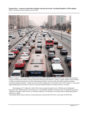 Ekoportal.eu - ochrona środowiska ekologia ochrona przyrody recykling biopaliwa GMO odpady Chiny: szeroki pas zieleni miejskiej otoczy Pekin Pekin na codzień - ścisk na drogach i zanieczyszczone powietrzePekin na granicy betonowego miasta chce utworzyć szeroki na kilometr pas zieleni, tworząc przestrzeń rekreacyjną dla ludności - podały w piątek chińskie media. Władze, w obliczu zawrotnie rosnących cen ziemi i budowlanego boomu, zarezerwowały pod zieleń i parki pas gruntów, szerokości jednego kilometra, między dwiema arteriami okalającymi na obrzeżach miasto. Ma to pomóc w utrzymaniu odpowiedniej jakości powietrza w mieście oraz przeciwdziałać napływowi zanieczyszczeń z zewnątrz. Rozrastająca się 17-milionowa stolica Chin stara się poprawić jakość życia w Pekinie przed olimpiadą w przyszłym roku. Miliardy juanów przeznaczane są na likwidację zakładów przemysłowych i na modernizację miasta. Publicznie dostępne zielone tereny są w Pekinie rzadkością i od niedawna za wstęp do kilku śródmiejskich parków pobierane są opłaty. Jak podają władze miasta stołeczny zielony pierścień o powierzchni 163 km kw. powstanie do 2010 roku. strona 1 / 2 Ekoportal.eu - ochrona środowiska ekologia ochrona przyrody recykling biopaliwa GMO odpady Chiny: szeroki pas zieleni miejskiej otoczy Pekin Źródło: Reuters strona 2 / 2