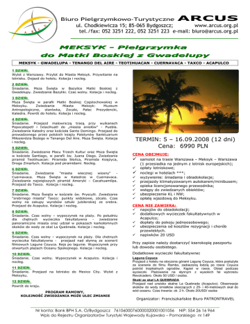 Biuro Pielgrzymkowo-Turystyczne ARCUS ul. Chodkiewicza 15; 85-065 Bydgoszcz; www.arcus.org.pl tel./fax: 052 3251 222, 052 3251 223 e-mail: [email protected] _______________________________ MEKSYK - Pielgrzymka do Matki Boskiej z Gwadelupy MEKSYK - GWADELUPA - TENANGO DEL AIRE - TEOTIHUACAN - CUERNAVACA - TAXCO - ACAPULCO 1 DZIEŃ: Wylot z Warszawy. Przylot do Miasta Meksyk. Przywitanie na lotnisku. Dojazd do hotelu. Kolacja i nocleg. 2 DZIEŃ: Śniadanie. Msza Święta w Bazylice Matki Boskiej z Gwadelupy. Zwiedzanie Bazyliki. Czas wolny. Kolacja i nocleg. 3 DZIEŃ: Msza Święta w parafii Matki Boskiej Częstochowskiej w Meksyku. Zwiedzanie Miasta Meksyk: Muzeum Antropologiczne, starówka, Zocalo, Pałac Prezydencki, Katedra. Powrót do hotelu. Kolacja i nocleg. 4 DZIEŃ: Śniadanie. Przejazd malowniczą trasą przy wulkanach Popocatepetl i Ixtacihuatl do „miasta aniołów” - Puebla. Zwiedzanie Katedry oraz kościoła Santo Domingo. Przejazd do prowadzonego przez polskich księży Palotynów Sanktuarium Miłosierdzia Bożego w Tenango Del Aire. Msza Święta. Kolacja i nocleg. 5 DZIEŃ: Śniadanie. Zwiedzanie Placu Trzech Kultur oraz Msza Święta w kościele Santiago, w parafii św. Juana Diego. Zwiedzanie piramid Teotihuacan: Piramida Słońca, Piramida Księżyca, Droga Zmarłych. Kolacja pod piramidami. Nocleg. 6 DZIEŃ: Śniadanie. Zwiedzanie "miasta wiecznej wiosny" Cuernavaca. Msza Święta w Katedrze w Cuernavaca. Zwiedzanie największych piramid Ameryki – Cacahuamilpa. Przejazd do Taxco. Kolacja i nocleg. 7 DZIEŃ: Śniadanie. Msza Święta w kościele św. Pryscylli. Zwiedzanie "srebrnego miasta" Taxco: punkty widokowe, zócalo. Czas wolny na zakupy wyrobów sztuki jubilerskiej ze srebra. Przejazd do Acapulco. Kolacja i nocleg. 8 DZIEŃ: Śniadanie. Czas wolny – wypoczynek na plaży. Po południu dla chętnych wycieczka fakultatywna zwiedzanie panoramiczne miasta oraz udział w pokazach karkołomnych skoków do wody ze skal La Quebrada. Kolacja i nocleg. 9 DZIEŃ: Śniadanie. Czas wolny – wypoczynek na plaży. Dla chetnych wycieczka fakultatywna - przejazd nad słynną ze scenerii filmowych Lagune Coyuca. Rejs po lagunie. Wypoczynek przy otwartych plażach Oceanu Spokojnego. Kolacja i nocleg. 10 DZIEŃ: Śniadanie. Czas wolny. Wypoczynek w Acapulco. Kolacja i nocleg. 11 DZIEŃ: Śniadanie. Przejazd na lotnisko do Mexico City. Wylot z Meksyku. 12 DZIEŃ: Powrót do kraju. PROGRAM RAMOWY, KOLEJNOŚĆ ZWIEDZANIA MOŻE ULEC ZMIANIE TERMIN: 5 – 16.09.2008 (12 dni) Cena: 6990 PLN CENA OBEJMUJE: samolot na trasie Warszawa – Meksyk – Warszawa (1 przesiadka na jednym z lotnisk europejskich); opłaty lotniskowe; noclegi w hotelach ***; wyżywienie: śniadania i obiadokolacje; przejazdy klimatyzowanym autokarem/minibusem; opieka licencjonowanego przewodnika; wstępy do zwiedzanych obiektów; ubezpieczenie KL i NW; opłatę wjazdową do Meksyku. CENA NIE ZAWIERA: napojów do obiadokolacji; dodatkowych wycieczek fakultatywnych w Acapulco; dopłaty do pokoju jednoosobowego; ubezpieczenia od kosztów rezygnacji i chorób przewlekłych. napiwków 20 USD Przy zapisie należy dostarczyć kserokopię paszportu lub dowodu osobistego. Dodatkowe wycieczki fakultatywne: Laguna Coyuca Przyjazd z hotelu na otoczona górami Lagunę Coyuca, która posłużyła za scenerie do filmu Rambo, zadaszoną łodzią po rzece Coyuca pośród tropikalnych ogrodów. Kąpiel w rzece. Obiad podczas wycieczki. Plażowanie na słynnym z wysokich fal wybrzeżu Revolcadero. Około 50 USD / osoba. Skoki ze skał LA QUEBRADA Przejazd nad urwisko skalne La Quebrada (Acapulco). Obserwacje skoków do wody śmiałków skaczących z 25- i 40-metrowych skał do wód oceanu. Czas trwania: ok. 2 h. Około 20USD/ osoba Organizator: Franciszkańskie Biuro PATRONTRAVEL ___________________________________________________________________________ Nr konta: Bank BPH S.A. O/Bydgoszcz 76106000760000320001001056 NIP: 554 26 16 964 Wpis do Rejestru Organizatorów Turystyki Wojewody Kujawsko – Pomorskiego nr 149