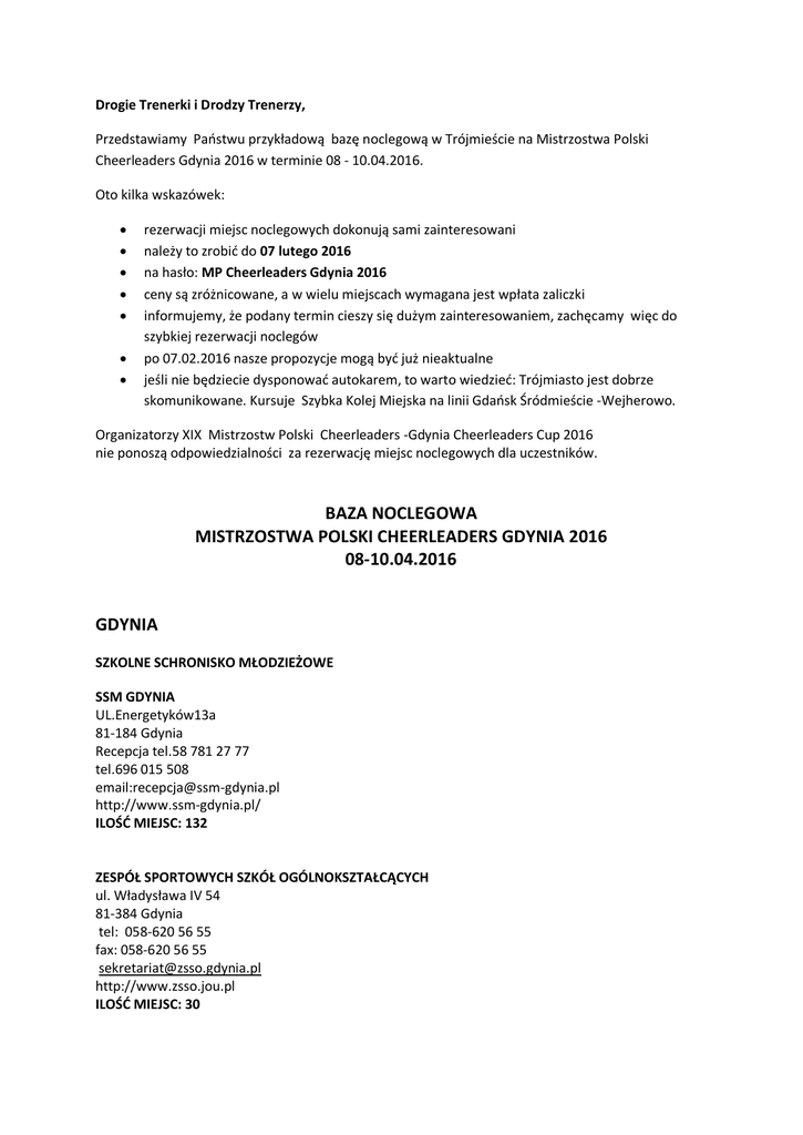 Drogie Trenerki i Drodzy Trenerzy, Przedstawiamy Państwu przykładową bazę noclegową w Trójmieście na Mistrzostwa Polski Cheerleaders Gdynia 2016 w terminie 08 - 10.04.2016. Oto kilka wskazówek: rezerwacji miejsc noclegowych dokonują sami zainteresowani należy to zrobić do 07 lutego 2016 na hasło: MP Cheerleaders Gdynia 2016 ceny są zróżnicowane, a w wielu miejscach wymagana jest wpłata zaliczki informujemy, że podany termin cieszy się dużym zainteresowaniem, zachęcamy więc do szybkiej rezerwacji noclegów po 07.02.2016 nasze propozycje mogą być już nieaktualne jeśli nie będziecie dysponować autokarem, to warto wiedzieć: Trójmiasto jest dobrze skomunikowane. Kursuje Szybka Kolej Miejska na linii Gdańsk Śródmieście -Wejherowo. Organizatorzy XIX Mistrzostw Polski Cheerleaders -Gdynia Cheerleaders Cup 2016 nie ponoszą odpowiedzialności za rezerwację miejsc noclegowych dla uczestników. BAZA NOCLEGOWA MISTRZOSTWA POLSKI CHEERLEADERS GDYNIA 2016 08-10.04.2016 GDYNIA SZKOLNE SCHRONISKO MŁODZIEŻOWE SSM GDYNIA UL.Energetyków13a 81-184 Gdynia Recepcja tel.58 781 27 77 tel.696 015 508 email:[email protected] http://www.ssm-gdynia.pl/ ILOŚĆ MIEJSC: 132 ZESPÓŁ SPORTOWYCH SZKÓŁ OGÓLNOKSZTAŁCĄCYCH ul. Władysława IV 54 81-384 Gdynia tel: 058-620 56 55 fax: 058-620 56 55 [email protected] http://www.zsso.jou.pl ILOŚĆ MIEJSC: 30 ZESPÓŁ SZKÓŁ NR 7 W GDYNI ul. Stawna 4/6 Gdynia 81-629 [email protected] www.zs7.gdynia.pl ILOŚĆ MIEJSC: 20 ZESPÓŁ SZKÓŁ NR 9 ul. Chylońska 227 81 - 007 Gdynia tel. 587821151 fax. 587821150 e-mail:[email protected] ILOŚĆ MIEJSC: 110 AKADEMIA MORSKA W GDYNI kierownik SDM-4 i DDS e-mail: [email protected] tel. 58 6901 486 kom. 600 053 708 fax. 58 6901 610 www.akademiki.am.gdynia.pl ILOŚĆ MIEJSC:70 GREEN HOSTEL Stanica Hufca ZHP Gdynia ul. B. Prusa 9-11 Beata Wójcik tel. 58 622 04 24 E-mail: [email protected] http://greenhostel.org/ ILOŚC MIEJSC: 50 HOSTEL LUX ul. Świętojańska 67 81-391 Gdynia tel. 501 742 455 Email: [email protected] www.luxhostel.pl ILOŚĆ MIEJSC:21 HOSTEL BLUESROOMS GDYNIA UL.PORTOWA 9 www.bluesrooms.pl email:[email protected] tel.600 928 546 ILOŚĆ MIEJSC: 11 MOTEL MERKURY Gdynia-Pogórze, ul. Zamoyskiego 2 tel. 514 283 299 - pokoje gościnne e-mail: [email protected] http://www.noclegowo.pl/ramka/9688/ ILOŚĆ MIEJSC: 50 POKOJE GOŚCINNE CHECZ ul. Zamenhofa 17 81-218 GDYNIA +48 (58) 623 60 99 +48 (58) 623 60 99 tel.608 019 548 http://pokojegoscinnechecz.pl ILOŚĆ MIEJSC: 32 POKOJE GOŚCINNE ANKER al. Marsz. Piłsudskiego 50 81-382 Gdynia tel.608 105 170 email:[email protected] http://pokojegoscinne.ankergdynia.pl/ ILOŚĆ MIEJSC: HOTEL DOM MARYNARZA Al. Marszałka Piłsudskiego 1 81-406 Gdynia http://www.dommarynarza.pl/ e-mail: [email protected] TELEFONY: 058 622 00 25 058 622 00 26 ILOŚC MIEJSC:80 HOTEL BALTIC ul. Starodworcowa 1c 81-575 Gdynia www.baltichotel.p tel. +48 508 898 309 e-mail [email protected] ILOŚĆ MIEJSC: 66 HOTEL ANTARES ul. Komandorska 59, 81-232 Gdynia tel. +48 58 623 36 39; fax +48 58 661 72 14 e-mail: [email protected]; www.hotelantares.pl ILOŚĆ MIEJSC:55 RUMIA MIEJSKI OŚRODEK SPORTU I REKREACJI W RUMI Ul. Mickiewicza 49 84-230 Rumia http://www.mosir.rumia.pl/ email: [email protected] Recepcja: +48 58 771-17-36 +48 58 771-17-37 ILOŚC MIEJSC: 19 BIAŁY DWOREK ul. Sobieskiego 16 84-230 Rumia (koło Gdyni) tel.: +48 (058) 671 08 95 fax: +48 (058) 663 55 11 http://www.bialy-dworek.pl e-mail: [email protected] ILOŚĆ MIEJSC: 46 SOPOT HOTEL MIRAMAR ul. Zamkowa Góra 25 81-713 Sopot tel. +48 58 550 00 11 e-mail: [email protected] www.hotelmiramar.pl ILOŚC MIEJSC: 80 HOSTEL CENTRAL SOPOT Ul. Boh. Monte Cassino 15, 81-704 Sopot Tel. +48 530-858-717 email: [email protected] www.centralsopot.com ILOŚC MIEJSC: 74 HOSTEL BEDEKER Armii Krajowej 92a 81-827 Sopot +48 515 317 570 [email protected] [email protected] facebook.com/bedekerhostel ILOŚC MIEJSC: 21 NOCLEGI AKADEMIA 81-713 Sopot, ul. Zamkowa Góra 25, tel. /058/ 555 95 92, faks /058/ 555 95 93 tel.609-00-95-95 e-mail: [email protected], www.euro.edu.pl ILOŚC MIEJSC: 22 GDAŃSK SZKOLNE SCHRONISKA MŁODZIEŻOWE SSM Grunwaldzka Al. Grunwaldzka 244, 80-314 Gdańsk tel./fax. (+48) 58-341-41-08 recepcja (+48) 58 520-68-51 email: [email protected] http://www.ssm.gda.pl/index.php/pl/nasze-schroniska/ssm-grunwaldzka.html ILOŚC MIEJSC:131 Filia SSM Wałowa Ul. Wałowa 21, 80-858 Gdańsk tel./fax: (+48) 58-301-23-13 email: [email protected] http://www.ssm.gda.pl/index.php/pl/nasze-schroniska/ssm-nr-waowa.html ILOŚC MIEJSC: 36 Filia SSM Kartuska Ul. Kartuska 245 B, 80-125 Gdańsk tel. (+48) 58-302-60-44, fax. (+48) 58 302-05-81 email: [email protected] http://www.ssm.gda.pl/index.php/pl/nasze-schroniska/ssm-nr-2-kartuska.html ILOŚC MIEJSC: 65 OŚRODEK PRZYGOTOWAŃ OLIMPIJSKICH ul. Kazimierza Górskiego 1 80-336 Gdańsk http://opo.gda.pl/ Telefon: +48 58 552 46 36 E-mail: [email protected] ILOŚC MIEJSC: 48 HOSTEL BURSZTYNEK ul. Toruńska 16 80-847 Gdańsk tel.58 682 23 27 tel. 668 369 600 / 668 821 721 email:[email protected] www.hostelbursztynek.pl ILOŚĆ MIEJSC: 164 DOM GOŚCI U SIÓSTR BRYGIDEK 80-308 Gdańsk, ul. Polanki 124, tel.: +48 58 552 12 98 tel./fax: +48 58 552 13 10 e-mail: [email protected] http://brygidki.pl/pokoje.html ILOŚĆ MIEJSC: 40 CENTRUM EDUKACJI NAUCZYCIELI al. gen. J. Hallera 14, 80-401 Gdańsk http://www.cen.gda.pl/noclegi/ telefon: 58 340 41 00 E-mail:[email protected] ILOŚC MIEJSC: 46 MUFFIN HOSTEL ul. Krzywoustego 8 Gdańsk tel. +48 508 683 346 http://muffinhostel.com.pl/