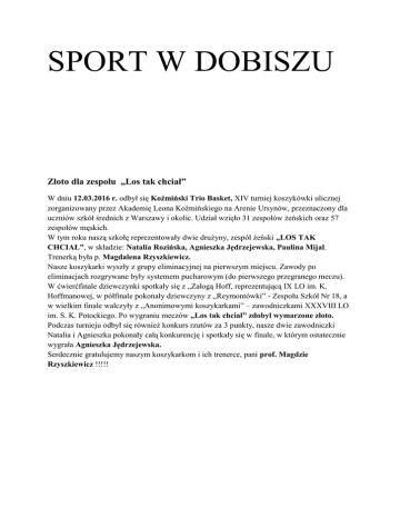 SPORT W DOBISZU Złoto dla zespołu „Los tak chciał” W dniu 12.03.2016 r. odbył się Koźmiński Trio Basket, XIV turniej koszykówki ulicznej zorganizowany przez Akademię Leona Koźmińskiego na Arenie Ursynów, przeznaczony dla uczniów szkół średnich z Warszawy i okolic. Udział wzięło 31 zespołów żeńskich oraz 57 zespołów męskich. W tym roku naszą szkołę reprezentowały dwie drużyny, zespół żeński „LOS TAK CHCIAŁ”, w składzie: Natalia Rozińska, Agnieszka Jędrzejewska, Paulina Mijal. Trenerką była p. Magdalena Rzyszkiewicz. Nasze koszykarki wyszły z grupy eliminacyjnej na pierwszym miejscu. Zawody po eliminacjach rozgrywane były systemem pucharowym (do pierwszego przegranego meczu). W ćwierćfinale dziewczynki spotkały się z „Załogą Hoff, reprezentującą IX LO im. K. Hoffmanowej, w półfinale pokonały dziewczyny z „Reymontówki” - Zespołu Szkół Nr 18, a w wielkim finale walczyły z „Anonimowymi koszykarkami” – zawodniczkami XXXVIII LO im. S. K. Potockiego. Po wygraniu meczów „Los tak chciał” zdobył wymarzone złoto. Podczas turnieju odbył się również konkurs rzutów za 3 punkty, nasze dwie zawodniczki Natalia i Agnieszka pokonały całą konkurencję i spotkały się w finale, w którym ostatecznie wygrała Agnieszka Jędrzejewska. Serdecznie gratulujemy naszym koszykarkom i ich trenerce, pani prof. Magdzie Rzyszkiewicz !!!!! Dnia 02.06.2015 r. na gościnnych obiektach SP. nr 46 przy ulicy Wałbrzyskiej odbyły się zawody lekkoatletyczne dla młodzieży ze szkół ponadgimnazjalnych o Mistrzostwo Dzielnicy Mokotów. Nasi uczniowie pod opieką prof. Jacka Jankowskiego zaprezentowali się znakomicie. Złote medale zdobyli: sztafeta 4x100 metrów w składzie: Jan Borowicz I B , Jan Bawolik I C , Michał Kaniewski I F , Patryk Kowalski I D. W biegu na 60 metrów złoty medal zdobył Jan Borowicz I B , a w biegu na dystansie 400 metrów również złoto zdobył Konrad Sobiech z klasy I C. Jan Bawolik z klasy I C zdobył srebro na dystansie 200 metrów. W konkurencji sprinterskiej dziewcząt reprezentantka naszej szkoły Adrianna Broda wywalczyła srebrny medal na dystansie 60 metrów. Brązowy medal zdobyła Karolina Jabłońska z klasy I B na dystansie 400 metrów. W konkurencji pchnięcia kulą z znakomite drugie miejsce przypadło dla Kasi Strzeżek z klasy II D. SREBRNE SIATKARKI DOBISZA MARZEC 2015 W tegorocznych Mistrzostwach Mokotowa nasze siatkarki nie obroniły zeszłorocznych wyników (Mistrzostwo Mokotowa i Mistrzostwo Warszawy), ale w bardzo dobrym stylu i według zasady fair play zdobyły srebrne medale. Na podium znalazły się w zacnym, zaprzyjaźnionym gronie zawodniczek Cervantesa (złoto) i Kochanowskiego (brąz). Zespół Dobisza tworzą: Klaudia Gryko 3B Aleksandra Kapera 3B Marta Klukowska 3B Paulina Kotlarska 2A Katarzyna Opałczyńska 3B Paulina Paprocka 3B Angelika Sikorska 2F Katarzyna Strzeżek 2D Anna Szostek 3F Monika Waligóra 1D Wiktoria Welik 2A Z trenerskiej ławki szefowała Im prof. Elżbieta Arkuszyńska, która o siatkówce wie wszystko! Listopad 2015 II miejsce w Mistrzostwach Mokotowa w piłce ręcznej STYCZEŃ 2014 W Mistrzostwach Mokotowa w piłce ręcznej reprezentacja Naszego Liceum w składzie : Ola BAGIŃSKA, Kaja DĄBROWSKA, Ola KAPERA, Magda KRAWIEC, Karolina PARKOT, Berenika RONIKIER, Natalia ROZIŃSKA, Paulina SIKORSKA, Katarzyna STRZEŻEK, Katarzyna SZYMAŃSKA zajęła I miejsce, które dało jej awans do Mistrzostw Warszawy w ramach XLVII Warszawskiej Olimpiady Młodzieży. Oddanym TRENEREM zespołu jest prof. Magdalena Rzyszkiewicz. DOBISZOWE SIATKARKI W ZŁOCIE! ( marzec 2015) Drużyna siatkarek naszego Liceum zdobyła w złoty medal i tytuł Mistrzyń Mokotowa Warszawskiej Olimpiady Młodzieży. Droga do złota w finałowej rozgrywce to trzy wygrane: z Królówką, Cervantesem i Bełską - każde po 2:0! Tytuł MVP (najbardziej wartościowego gracza) zdobyła MAGDA KRAWIEC - nieoceniona jako siatkarka ale również nasze "dobro Dobiszowe" na wielu innych polach nie tylko sportowych! Nasza złota drużyna występuje w składzie: MILENA CIECHANOWICZ 2F KLAUDIA GRYKO 2B ALEKSANDRA KAPERA 2B KATARZYNA KIEŁKOWSKA 1B MAGDALENA KRAWIEC 3C JULIA KWIATKOWSKA 1B KATARZYNA OPAŁCZYŃSKA 2B MAGDALENA PIĘTKA 3C ANNA SZOSTEK 2F ALEKSANDRA ŚWIERCZEWSKA 3E ZESPÓŁ SIATKAREK PRZYGOTOWAŁA I PROWADZI ZNAKOMITA TRENERKA PROF. ELŻBIETA ARKUSZYŃSKA.