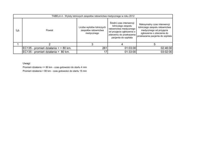 TABELA 4 - Wyloty lotniczych zespołów ratownictwa medycznego w roku 2012 Lp. 1 Powiat Liczba wylotów lotniczych zespołów ratownictwa medycznego 2 EC135 - promień działania < = 80 km. EC135 - promień działania > 80 km. Uwagi: Promień działania <= 80 km - czas gotowości do startu 4 min Promień działania > 80 km - czas gotowości do startu 15 min 3 Średni czas interwencji Maksymalny czas interwencji lotniczego zespołu lotniczego zespołu ratownictwa ratownictwa medycznego medycznego od przyjęcia od przyjęcia zgłoszenia o zgłoszenia o zdarzenia do zdarzeniu do przekazania przekazania pacjenta do szpitala pacjenta do szpitala 4 261 17 5 01:03:00 01:33:00 02:46:00 03:02:00