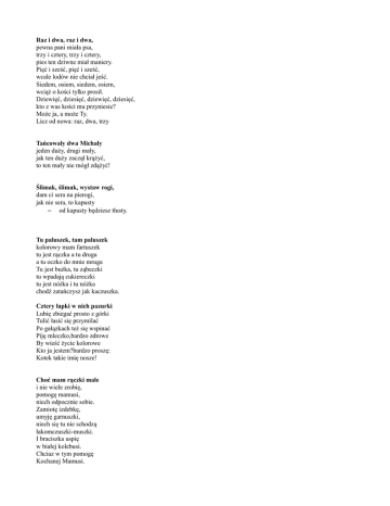 Raz i dwa, raz i dwa, pewna pani miała psa, trzy i cztery, trzy i cztery, pies ten dziwne miał maniery. Pięć i sześć, pięć i sześć, wcale lodów nie chciał jeść. Siedem, osiem, siedem, osiem, wciąż o kości tylko prosił. Dziewięć, dziesięć, dziewięć, dziesięć, kto z was kości mu przyniesie? Może ja, a może Ty. Licz od nowa: raz, dwa, trzy Tańcowały dwa Michały jeden duży, drugi mały, jak ten duży zaczął krążyć, to ten mały nie mógł zdążyć! Ślimak, ślimak, wystaw rogi, dam ci sera na pierogi, jak nie sera, to kapusty – od kapusty będziesz tłusty. Tu paluszek, tam paluszek kolorowy mam fartuszek tu jest rączka a tu druga a tu oczko do mnie mruga Tu jest buźka, tu ząbeczki tu wpadają cukiereczki tu jest nóżka i tu nóżka chodź zatańczysz jak kaczuszka. Cztery łapki w nich pazurki Lubię zbiegać prosto z górki Tulić łasić się przymilać Po gałązkach też się wspinać Piję mleczko,bardzo zdrowe By wieść życie kolorowe Kto ja jestem?bardzo proszę: Kotek takie imię nosze! Choć mam rączki małe i nie wiele zrobię, pomogę mamusi, niech odpocznie sobie. Zamiotę izdebkę, umyję garnuszki, niech się tu nie schodzą łakomczuszki-muszki. I braciszka uspię w białej kolebusi. Chciaz w tym pomogę Kochanej Mamusi. Siała baba mak. Nie wiedziała jak. Dziadek wiedział, nie powiedział, a to było TAK! W pokoiku na stoliku stało mleczko i jajeczko. Przyszedł kotek, wypił mleczko, a ogonkiem stłukł jajeczko. Przyszła pani, kotka zbiła, a skorupki wyrzuciła. Wyszła kura na podwórze, spodobało się tam kurze. Na podwórzu dużo kurzu, piórko,trawka i sadzawka... Kamyk, kwiatek i dżdżownica - jaka piękna okolica... Drapu drap jedną z łap, jest robaczek to go cap! Drapu drapu łapką w kurzu, jak tu pięknie na podwórzu! Tu, tu sroczka kaszkę warzyła, ogonek sobie sparzyła... Temu dała na miseczkę, temu dała na łyżeczkę, temu, bo grzecznie prosił, temu, bo wodę nosił, a temu najmniejszemu nic nie dała, tylko ogonkiem zamieszała, i frrrr... poleciała i TU się schowała! Dwa aniołki w niebie piszą list do siebie. Piszą, piszą i rachują, ile kredek po-trze-bu-ją. Łyżka, nożyk i śliniaczek, je śniadanie niemowlaczek. Na śliniaczku misie siedzą, pewnie też śniadanie jedzą. Jedzie, jedzie pan, pan, na koniku sam, sam. Za nim jedzie chłop, chłop, na koniku hop! hop! Jedzie, jedzie ba-ba i z konika spa-da! Wpadła gruszka do fartuszka a za gruszką dwa jabłuszka, a śliweczka wpaść nie chciała, bo śliweczka niedojrzała! Na wysokiej górze rosło drzewo duże, nazywało się: apli papli biten blau. Kto tego nie powtórzy, ten smacznie będzie spał! A-a-a, kotki dwa, szare, bure obydwa, nic nie będą robiły, tylko dzieci bawiły. Chodź do mamy szybko, szybko, jesteś mamy małą rybką. Umyjemy nosek, nóżki, niech zobaczą to kaczuszki. Umyjemy mały brzuszek, tylko nie bój się kaczuszek. Chodź do mamy szybko, szybko, jesteś mamy małą rybką. Jesteś małą rybką mamy, Bo my bardzo się kochamy! Pieje kogut: KUKURYKU, wstawaj mały mój chłopczyku! Chłopczyk rano się obudził, patrzy, ile wkoło ludzi. Dziękuję ci koguciku za to Twoje KUKURYKU. Dalej dzieci, dalej z drogi, bo tu pędzi pociąg srogi, leci, pędzi, ile tchu, już przyleciał, już jest tu! Przez tropiki, przez pustynię, toczył zając wielką dynię, toczył, toczył dynię w dół, Pękła dynia mu na pół! Pestki z niej się wysypały, więc je zbierał przez dzień cały. Raz, dwa trzy!Raz, dwa, trzy! Ile pestek zbierzesz ty? Mam trzy latka, trzy i pół, sięgam głową ponad stół, mam fartuszek z muchomorkiem, do przedszkola chodzę z workiem. Umiem pantofelki zmieniać, rączki myję do jedzenia, ładnie żegnam się i witam, tańczę kiedy gra muzyka. Umiem wierszyk o koteczku, o tchórzliwym koziołeczku i o piesku, co był w polu nauczyłam się w przedszkolu. Policzymy, co sie ma: mam dwie ręce, łokcie dwa, dwa kolanka, nogi dwie - wszystko pięknie zgadza się. Dwoje uszu, oczka dwa, no i buzię też się ma. A ponieważ buzia je, chciałbym buzie też mieć dwie! Idzie pani tup tup tup dziadek z laską stuk stuk stuk skacze dziecko hop hop hop żaba robi dłuuugi skok! Wieje wietrzyk fiu fiu fiu kropi deszczyk puk puk puk deszcz ze śniegiem chlup chlup chlup a grad w szyby łup łup łup! Świeci słonko, wieje wietrzyk pada deszczyk... czujesz dreszczyk? Idzie rak idzie rak czasem naprzód czasem wspak. Idzie rak nieborak jak uszczypnie, będzie znak! Idzie kominiarz po drabinie fiku miku już w kominie! Tańcowały dwa Michały jeden duży, drugi mały, jak ten duży zaczął krążyć, to ten mały nie mógł zdążyć! Idzie myszka do braciszka. Tu zajrzała, tu wskoczyła, a na koniec TAM się skryła! Na górze róże, na dole fiołki, my się kochamy jak dwa aniołki! Ślimak, ślimak, wystaw rogi, dam ci sera na pierogi, jak nie sera, to kapusty - od kapusty będziesz tłusty.