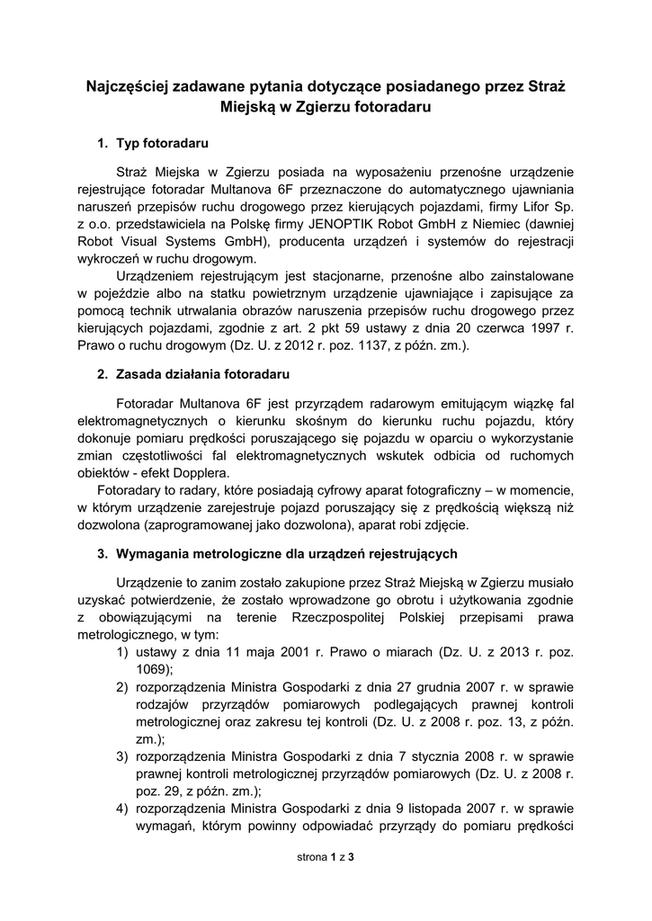 Najczęściej zadawane pytania dotyczące posiadanego przez Straż Miejską w Zgierzu fotoradaru 1. Typ fotoradaru Straż Miejska w Zgierzu posiada na wyposażeniu przenośne urządzenie rejestrujące fotoradar Multanova 6F przeznaczone do automatycznego ujawniania naruszeń przepisów ruchu drogowego przez kierujących pojazdami, firmy Lifor Sp. z o.o. przedstawiciela na Polskę firmy JENOPTIK Robot GmbH z Niemiec (dawniej Robot Visual Systems GmbH), producenta urządzeń i systemów do rejestracji wykroczeń w ruchu drogowym. Urządzeniem rejestrującym jest stacjonarne, przenośne albo zainstalowane w pojeździe albo na statku powietrznym urządzenie ujawniające i zapisujące za pomocą technik utrwalania obrazów naruszenia przepisów ruchu drogowego przez kierujących pojazdami, zgodnie z art. 2 pkt 59 ustawy z dnia 20 czerwca 1997 r. Prawo o ruchu drogowym (Dz. U. z 2012 r. poz. 1137, z późn. zm.). 2. Zasada działania fotoradaru Fotoradar Multanova 6F jest przyrządem radarowym emitującym wiązkę fal elektromagnetycznych o kierunku skośnym do kierunku ruchu pojazdu, który dokonuje pomiaru prędkości poruszającego się pojazdu w oparciu o wykorzystanie zmian częstotliwości fal elektromagnetycznych wskutek odbicia od ruchomych obiektów - efekt Dopplera. Fotoradary to radary, które posiadają cyfrowy aparat fotograficzny – w momencie, w którym urządzenie zarejestruje pojazd poruszający się z prędkością większą niż dozwolona (zaprogramowanej jako dozwolona), aparat robi zdjęcie. 3. Wymagania metrologiczne dla urządzeń rejestrujących Urządzenie to zanim zostało zakupione przez Straż Miejską w Zgierzu musiało uzyskać potwierdzenie, że zostało wprowadzone go obrotu i użytkowania zgodnie z obowiązującymi na terenie Rzeczpospolitej Polskiej przepisami prawa metrologicznego, w tym: 1) ustawy z dnia 11 maja 2001 r. Prawo o miarach (Dz. U. z 2013 r. poz. 1069); 2) rozporządzenia Ministra Gospodarki z dnia 27 grudnia 2007 r. w sprawie rodzajów przyrządów pomiarowych podlegających prawnej kontroli metrologicznej oraz zakresu tej kontroli (Dz. U. z 2008 r. poz. 13, z późn. zm.); 3) rozporządzenia Ministra Gospodarki z dnia 7 stycznia 2008 r. w sprawie prawnej kontroli metrologicznej przyrządów pomiarowych (Dz. U. z 2008 r. poz. 29, z późn. zm.); 4) rozporządzenia Ministra Gospodarki z dnia 9 listopada 2007 r. w sprawie wymagań, którym powinny odpowiadać przyrządy do pomiaru prędkości strona 1 z 3 pojazdów w ruchu drogowym, oraz szczegółowego zakresu badań i sprawdzeń wykonywanych podczas prawnej kontroli metrologicznej tych przyrządów pomiarowych (Dz. U. z 2007 r. poz. 1663). 4. Jakie wymagane dokumenty posiada fotoradar Multanova 6F Posiadany przez Straż Miejską w Zgierzu fotoradar Multanova 6F posiada: 1) decyzję Nr 232/2006 Prezesa Głównego Urzędu Miar z dnia 18.09.2006 r. zatwierdzającą typ PLT 06208 (legalizacja pierwotna); 2) decyzję zmieniającą Nr ZZT 15/2007 Prezesa Głównego Urzędu Miar z dnia 19.06.2007 r.; 3) orzeczenie nr 004/2011 Laboratorium Badań Urządzeń Telekomunikacyjnych Instytutu Łączności – Państwowego Instytutu Badawczego w Warszawie z dnia 20.01.2011 r.; 4) świadectwo legalizacji ponownej W3/16-2/13 Dyrektora Okręgowego Urzędu Miar w Warszawie, ważne do dnia 31.01.2014 r. 5. Dlaczego zdjęcia odblaskowych tablic rejestracyjnych są poza zdjęciami pojazdów Aparat cyfrowy fotoradaru Multanova 6F wyposażony jest w opatentowany przez firmę Robot Visual Systems GmbH filtr Seidel specjalnie stworzony dla cyfrowej fotografii wykroczeń w ruchu drogowym. Filtr Seidel odbija dobrze oświetlone odblaskowe tablice rejestracyjne na zdjęciu, jako tło łatwo czytelnego numeru rejestracyjnego. Jeżeli zdjęcia z fotoradaru są robione przy użyciu lampy błyskowej, to filtr polaryzacyjny powoduje, że wszystkie elementy odblaskowe (światła, migacze, tablice rejestracyjne, znaki drogowe) odbijają się w jednym lub kilku miejscach na zdjęciu. Wyciągnięty poza fotografię numer tablicy rejestracyjnej pojazdu może być poddany efektem wyostrzania, rozjaśniania lub przyciemniania, ale nie przerabiania widocznego na zdjęciu błysku. 6. Miejsce umieszczenie fotoradaru na drodze i jego oznakowanie Funkcjonariusze Straży Miejskiej w Zgierzu zgodnie z art. 129b ust 4 ustawy z dnia 20 czerwca 1997 r. Prawo o ruchu drogowym (Dz. U. 2012 r. poz. 1137, z późn. zm.), wykonują czynności z zakresu kontroli ruchu drogowego z użyciem przenośnego albo zainstalowanego w pojeździe urządzenia rejestrującego w oznakowanym miejscu i określonym czasie, uzgodnionymi z właściwym miejscowo Komendantem Powiatowym Policji w Zgierzu. Zasady umieszczania fotoradarów w pasach drogowych określone zostały w Rozporządzenie Ministra Transportu, Budownictwa i Gospodarki Morskiej z dnia 14 marca 2013 r. w sprawie warunków lokalizacji, sposobu oznakowania i dokonywania pomiarów przez urządzenia rejestrujące (Dz. U. z 2013 r. poz. 366). strona 2 z 3 Zgodnie z rozporządzeniem Ministra Infrastruktury z dnia 3 lipca 2003 r. w sprawie szczegółowych warunków technicznych dla znaków i sygnałów drogowych oraz urządzeń bezpieczeństwa ruchu drogowego i warunków ich umieszczania na drogach (Dz. U. z 2003 r. poz. 2181, z późn. zm.), w przypadku gdy automatyczna kontrola prędkości będzie wykonywana przez strażników gminnych (miejskich) w trybie określonym w art. 129b ust. 4 ustawy, na początku odcinka drogi objętego okresową kontrolą umieszcza się znak D-51„automatyczna kontrola prędkości” z tabliczką z napisem „Na odcinku …..”. W treści napisu na tabliczce długość odcinka drogi poniżej 1000 m podaje się w metrach z dokładnością do 100 m, a od długości 1,0 km z dokładnością do 0,1 km. 7. Dlaczego fotoradar ustawiony jest pod kątem do kierunku ruchu pojazdów Głównym powodem ustawienia fotoradaru pod kątem do kierunku ruchu pojazdów, dla którego tak się dziej