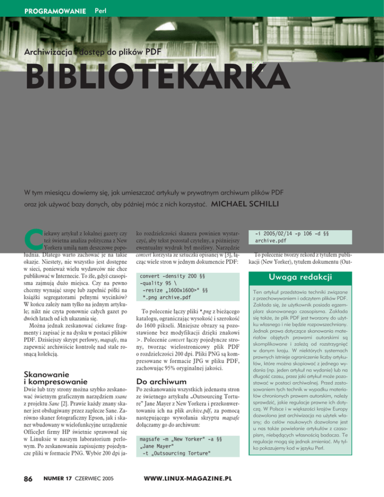 PROGRAMOWANIE Perl Archiwizacja i dostęp do plików PDF BIBLIOTEKARKA W tym miesiącu dowiemy się, jak umieszczać artykuły w prywatnym archiwum plików PDF oraz jak używać bazy danych, aby później móc z nich korzystać. MICHAEL SCHILLI C iekawy artykuł z lokalnej gazety czy też świetna analiza polityczna z New Yorkera umilą nam deszczowe popołudnia. Dlatego warto zachować je na takie okazje. Niestety, nie wszystko jest dostępne w sieci, ponieważ wielu wydawców nie chce publikować w Internecie. To źle, gdyż czasopisma zajmują dużo miejsca. Czy na pewno chcemy wynająć szopę lub zapełnić półki na książki segregatorami pełnymi wycinków? W końcu zależy nam tylko na jednym artykule; nikt nie czyta ponownie całych gazet po dwóch latach od ich ukazania się. Można jednak zeskanować ciekawe fragmenty i zapisać je na dysku w postaci plików PDF. Dzisiejszy skrypt perlowy, magsafe, ma zapewnić archiwiście kontrolę nad stale rosnącą kolekcją. Skanowanie i kompresowanie Dwie lub trzy strony można szybko zeskanować świetnym graficznym narzędziem xsane z projektu Sane [2]. Prawie każdy znany skaner jest obsługiwany przez zaplecze Sane. Zarówno skaner fotograficzny Epson, jak i skaner wbudowany w wielofunkcyjne urządzenie OfficeJet firmy HP świetnie sprawował się w Linuksie w naszym laboratorium perlowym. Po zeskanowaniu zapisujemy pojedyncze pliki w formacie PNG. Wybór 200 dpi ja- 86 NUMER 17 CZERWIEC 2005 ko rozdzielczości skanera powinien wystarczyć, aby tekst pozostał czytelny, a późniejszy ewentualny wydruk był możliwy. Narzędzie convert korzysta ze sztuczki opisanej w [3], łącząc wiele stron w jednym dokumencie PDF: convert -density 200 §§ -quality 95 \ -resize „1600x1600>” §§ *.png archive.pdf To polecenie łączy pliki *.png z bieżącego katalogu, ograniczając wysokość i szerokość do 1600 pikseli. Mniejsze obrazy są pozostawione bez modyfikacji dzięki znakowi >. Polecenie convert łączy pojedyncze strony, tworząc wielostronicowy plik PDF o rozdzielczości 200 dpi. Pliki PNG są kompresowane w formacie JPG w pliku PDF, zachowując 95% oryginalnej jakości. Do archiwum Po zeskanowaniu wszystkich jedenastu stron ze świetnego artykułu „Outsourcing Torture” Jane Mayer z New Yorkera i przekonwertowaniu ich na plik archive.pdf, za pomocą następującego wywołania skryptu magsafe dołączamy go do archiwum: magsafe -m „New Yorker” -a §§ „Jane Mayer” -t „Outsourcing Torture” WWW.LINUX-MAGAZINE.PL -i 2005/02/14 -p 106 -d §§ archive.pdf To polecenie tworzy rekord z tytułem publikacji (New Yorker), tytułem dokumentu (Out- Uwaga redakcji Ten artykuł przedstawia techniki związane z przechowywaniem i odczytem plików PDF. Zakłada się, że użytkownik posiada egzemplarz skanowanego czasopisma. Zakłada się także, że plik PDF jest tworzony do użytku własnego i nie będzie rozpowszechniany. Jednak prawa dotyczące skanowania materiałów objętych prawami autorskimi są skomplikowane i zależą od rozstrzygnięć w danym kraju. W niektórych systemach prawnych istnieje ograniczenie liczby artykułów, które można skopiować z jednego wydania (np. jeden artykuł na wydanie) lub na długość czasu, przez jaki artykuł może pozostawać w postaci archiwalnej. Przed zastosowaniem tych technik w wypadku materiałów chronionych prawem autorskim, należy sprawdzić, jakie regulacje prawne ich dotyczą. W Polsce i w większości krajów Europy dozwolona jest archiwizacja na użytek własny; do celów naukowych dozwolone jest u nas także powielanie artykułów z czasopism, niebędących własnością badacza. Te regulacje mogą się jednak zmieniać. My tylko pokazujemy kod w języku Perl. Perl sourcing Torture), wydaniem (2005/02/14) i stroną początkową (106). Dane są przechowywane w autentycznej bazie danych, obsługującej zapytania w języku SQL. W tej perlowej rubryce korzystali- $ magsafe [1] Nowy [2] New Yorker [3] Southwest London Inquirer Czasopismo [1]> Ponieważ już wcześniej wprowadziliśmy dwie publikacje, skrypt magsafe odnotował tytuły gazet i teraz wyświetla menu w postaci punktów. Aby dodać nowe czasopismo, naciskamy klawisz 1 i wprowadzamy nazwę publikacji. Czasopismo [1]> 1 Wprowadź nazwę czasopismaU []> Chiromancja na co dzień Dokument []> ... Rysunek 1: Skanowanie artykułu w programie xsane. śmy z mechanizmu bazy danych SQLite, gdyż jest ona niezwykle łatwa do zainstalowania. W sekcji „Installation” można się przekonać, że potrzebnych jest zaledwie kilka modułów z sieci CPAN, a skrypt załatwi resztę. Nie trzeba uruchamiać demona, definiować bazy danych czy tabel – znowu skrypt robi to wszystko sam. Skrypt nie kopiuje dokumentu PDF archive.pdf do bazy danych, lecz do katalogu, gdzie dokumenty przechowywane są w plikach o nazwach numerycznych (000001, 000002, ...). Wprowadzenie tekstu z New Yorkera do świeżej bazy spowoduje utworzenie dokumentu o nazwie „000001”, z danymi pliku PDF. Naszym drugim rekordem będzie artykuł z lokalnej gazety, dotyczący burdy w londyńskim pubie. magsafe -m §§ „Southwest London Inquirer” -t „Pint Glasses Flying Low” -i 2005/02 -p 4 -d §§ archive.pdf Jak widać, nie trzeba podawać nazwiska autora; zresztą krótkie teksty w gazetach często nie są podpisane nazwiskiem, tylko inicjałami. Po wywołaniu skryptu magsafe bez parametrów pojawią się interaktywne pytania o szczegóły. Program magsafe kopiuje dokument PDF określony przez opcję -d (lub wprowadzony interaktywnie) do ustalonego z góry katalogu, przypisując numery seryjne poszczególnym dokumentom (000001, 000002 i tak dalej) oraz wprowadzając ścieżki do tych plików z bazy danych. Igła w stogu siana Oczywiście, baza danych daje możliwość przeszukiwania w dowolny sposób. W wypadku naszej gazetowej bazy danych, którą przechowujemy w pliku scanned_docs.dat, jest to bardzo łatwe przy użyciu narzędzia wiersza poleceń s