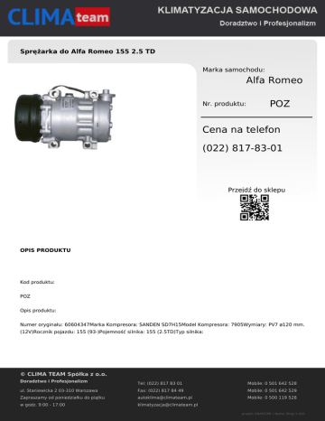 Sprężarka do Alfa Romeo 155 2.5 TD Marka samochodu: Alfa Romeo Nr. produktu: POZ Cena na telefon (022) 817-83-01 Przejdź do sklepu OPIS PRODUKTU Kod produktu: POZ Opis produktu: Numer oryginału: 60604347Marka Kompresora: SANDEN SD7H15Model Kompresora: 7905Wymiary: PV7 ø120 mm. (12V)Rocznik pojazdu: 155 (93-)Pojemność silnika: 155 (2.5TD)Typ silnika: © CLIMA TEAM Spółka z o.o. Doradztwo i Profesjonalizm Tel: (022) 817 83 01 Mobile: 0 501 642 528 ul. Staniewicka 2 03-310 Warszawa Fax: (022) 817 84 49 Mobile: 0 501 642 529 Zapraszamy od poniedziałku do piątku [email protected] Mobile: 0 500 119 528 w godz. 9:00 - 17:00 [email protected] projekt GRAFCOM | Netler Shop 1.020