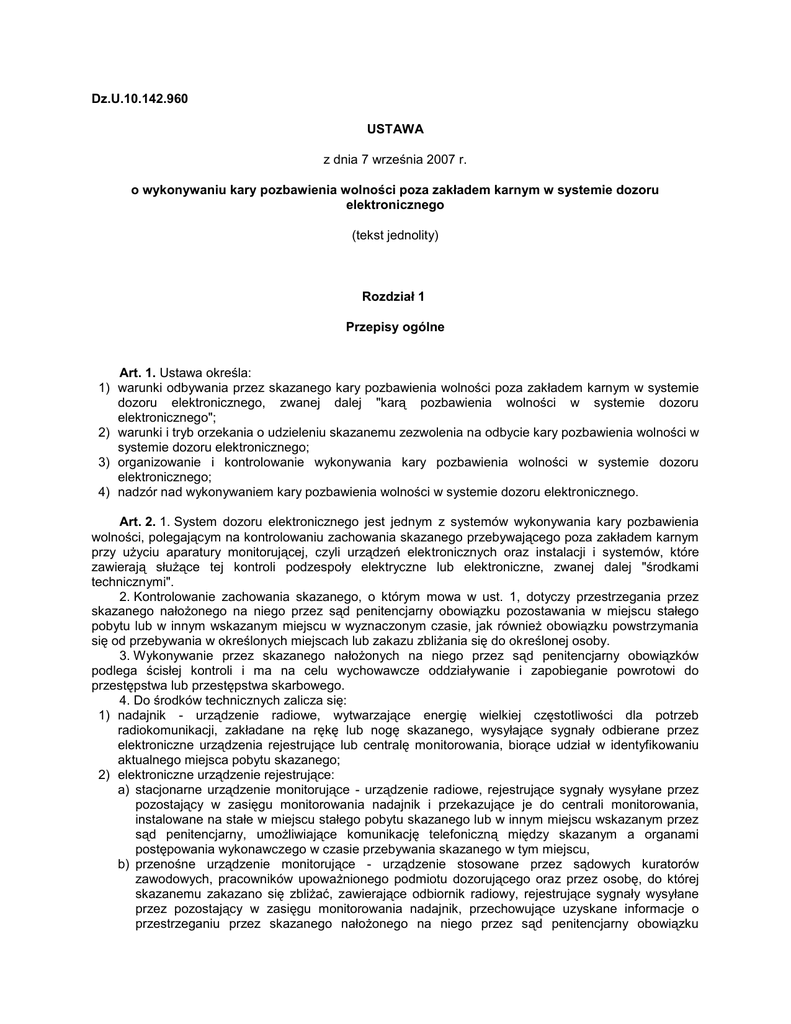 Dz.U.10.142.960 USTAWA z dnia 7 września 2007 r. o wykonywaniu kary pozbawienia wolności poza zakładem karnym w systemie dozoru elektronicznego (tekst jednolity) Rozdział 1 Przepisy ogólne Art. 1. Ustawa określa: 1) warunki odbywania przez skazanego kary pozbawienia wolności poza zakładem karnym w systemie dozoru elektronicznego, zwanej dalej "karą pozbawienia wolności w systemie dozoru elektronicznego"; 2) warunki i tryb orzekania o udzieleniu skazanemu zezwolenia na odbycie kary pozbawienia wolności w systemie dozoru elektronicznego; 3) organizowanie i kontrolowanie wykonywania kary pozbawienia wolności w systemie dozoru elektronicznego; 4) nadzór nad wykonywaniem kary pozbawienia wolności w systemie dozoru elektronicznego. Art. 2. 1. System dozoru elektronicznego jest jednym z systemów wykonywania kary pozbawienia wolności, polegającym na kontrolowaniu zachowania skazanego przebywającego poza zakładem karnym przy użyciu aparatury monitorującej, czyli urządzeń elektronicznych oraz instalacji i systemów, które zawierają służące tej kontroli podzespoły elektryczne lub elektroniczne, zwanej dalej "środkami technicznymi". 2. Kontrolowanie zachowania skazanego, o którym mowa w ust. 1, dotyczy przestrzegania przez skazanego nałożonego na niego przez sąd penitencjarny obowiązku pozostawania w miejscu stałego pobytu lub w innym wskazanym miejscu w wyznaczonym czasie, jak również obowiązku powstrzymania się od przebywania w określonych miejscach lub zakazu zbliżania się do określonej osoby. 3. Wykonywanie przez skazanego nałożonych na niego przez sąd penitencjarny obowiązków podlega ścisłej kontroli i ma na celu wychowawcze oddziaływanie i zapobieganie powrotowi do przestępstwa lub przestępstwa skarbowego. 4. Do środków technicznych zalicza się: 1) nadajnik - urządzenie radiowe, wytwarzające energię wielkiej częstotliwości dla potrzeb radiokomunikacji, zakładane na rękę lub nogę skazanego, wysyłające sygnały odbierane przez elektroniczne urządzenia rejestrujące lub centralę monitorowania, biorące udział w identyfikowaniu aktualnego miejsca pobytu skazanego; 2) elektroniczne urządzenie rejestrujące: a) stacjonarne urządzenie monitorujące - urządzenie radiowe, rejestrujące sygnały wysyłane przez pozostający w zasięgu monitorowania nadajnik i przekazujące je do centrali monitorowania, instalowane na stałe w miejscu stałego pobytu skazanego lub w innym miejscu wskazanym przez sąd penitencjarny, umożliwiające komunikację telefoniczną między skazanym a organami postępowania wykonawczego w czasie przebywania skazanego w tym miejscu, b) przenośne urządzenie monitorujące - urządzenie stosowane przez sądowych kuratorów zawodowych, pracowników upoważnionego podmiotu dozorującego oraz przez osobę, do której skazanemu zakazano się zbliżać, zawierające odbiornik radiowy, rejestrujące sygnały wysyłane przez pozostający w zasięgu monitorowania nadajnik, przechowujące uzyskane informacje o przestrzeganiu przez skazanego nałożonego na niego przez sąd penitencjarny obowiązku pozostawania w miejscu stałego pobytu lub w innym wskazanym miejscu w wyznaczonym czasie, jak również obowiązku powstrzymania się od przebywania w określonych miejscach lub zakazu zbliżania się do określonej osoby, wyposażone w interfejs, w rozumieniu ustawy z dnia 16 lipca 1) 2004 r. - Prawo telekomunikacyjne (Dz. U. Nr 171, poz. 1800, z późn. zm. ), pozwalający na przekazanie tych informacji do centrali monitorowania, biorące udział w identyfikowaniu aktualnego miejsca pobytu skazanego; 3) centralę monitorowania - centrum komputerowe wyposażone w narzędzia do przetwarzania danych osobowych, w rozumieniu ustawy z dnia 29 sierpnia 1997 r. o ochronie danych osobowych (Dz. U. z 2) 2002 r. Nr 101, poz. 926, z późn. zm. ), do rejestrowania, gromadzenia, odtwarzania, przechowywania, zabezpieczenia i przekazywania uprawnionym organom informacji odnoszących się do przestrzegania przez skazanego nałożonego na niego przez sąd penitencjarny obowiązku pozostawania w miejscu stałego pobytu lub w innym wskazanym miejscu w wyznaczonym czasie, jak również obowiązku powstrzymania się od przebywania w określonych miejscach lub zakazu zbliżania się do określonej osoby. 4a. Przenośne urządzenie monitorujące może być stosowane zamiast lub obok stacjonarnego urządzenia monitorującego. 5. Środki techniczne powinny zapewniać odpowiedni zasięg monitorowania, przez który rozumie się największą odległość, z jakiej elektroniczne urządzenie rejestrujące jest w stanie odebrać i zarejestrować sygnał radiowy wysyłany przez nadajnik, umożliwiający właściwe wykonanie kary pozbawienia wolności w systemie dozoru elektronicznego. Art. 3. 1. Czynności materialno-techniczne związane z kontrolą zachowania skazanego w czasie odbywania kary pozbawienia wolności w systemie dozoru elektronicznego przy użyciu środków technicznych powierza się upoważnionemu podmiotowi dozorującemu, w całości lub w części. 2. Wspieranie oraz powierzanie czynności, o których mowa w ust. 1, może nastąpić na zasadach i w trybie ustawy z dnia 19 grudnia 2008 r. o partnerstwie publiczno-prywatnym (Dz. U. z 2009 r. Nr 19, poz. 100 oraz z 2010 r. Nr 106, poz. 675), zwanej dalej "ustawą o partnerstwie publiczno-prywatnym". Umowa o wspieranie lub powierzenie zadania publicznego może być zawarta na czas realizacji zadania lub na czas określony. Art. 4. 1. Upoważnionym podmiotem dozorującym może być instytucja państwowa, przedsiębiorca lub podmiot zagraniczny mający siedzibę w Rzeczypospolitej Polskiej, jeżeli jest przedsiębiorcą w rozumieniu prawa kraju rejestracji i spełnia warunki do wykonywania w Rzeczypospolitej Polskiej działalności gospodarczej, który może wykonywać działalność gospodarczą polegającą na wykonywaniu czynności materialno-technicznych związanych z kontrolą nałożone
