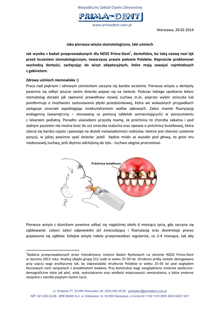 Niepubliczny Zakład Opieki Zdrowotnej www.primadent.com.pl Warszawa, 28.02.2014 Jaka pierwsza wizyta stomatologiczna, taki uśmiech Jak wynika z badań przeprowadzonych dla NZOZ Prima-Dent1, dentofobia, bo taką nazwę nosi lęk przed leczeniem stomatologicznym, towarzyszy prawie połowie Polaków. Naprzeciw problemowi wychodzą dentyści, zachęcając do wizyt adaptacyjnych, które mają oswajać najmłodszych z gabinetem. Zdrowy uśmiech niemowlaka :) Praca nad pięknym i zdrowym uśmiechem zaczyna się bardzo wcześnie. Pierwsza wizyta u dentysty powinna się odbyć jeszcze zanim dziecko pojawi się na świecie. Podczas takiego spotkania lekarz stomatolog doradzi jak zapewnić prawidłowy rozwój żuchwy m.in. poprzez wybór smoczka lub poinformuje o możliwości zastosowania płytki przedsionkowej, która we wskazanych przypadkach zastępuje smoczek zapobiegając zniekształceniom wałów zębowych. Zaleci mamie fluoryzację endogenną (wewnętrzną – stosowaną za pomocą tabletek wzmacniających) w porozumieniu z lekarzem pediatrą. Ponadto uświadomi przyszłą mamę, że próchnica to choroba zakaźna i pod żadnym pozorem nie można brać do ust smoczka malucha oraz opowie o próchnicy butelkowej, która zdarza się bardzo często i powstaje na skutek nieświadomości rodziców. Istotne jest również ustalenie pozycji, w jakiej powinno spać dziecko: jeżeli będzie miało za wysoko pod głową, to grozi mu niedorozwój żuchwy, jeśli zbytnio odchyloną do tyłu - żuchwa ulegnie przerostowi. Pierwsza wizyta z dzieckiem powinna odbyć się najpóźniej około 6 miesiąca życia, gdy zaczyna się ząbkowanie. Lekarz zaleci odpowiedni żel znieczulający i fluoryzację oraz skontroluje proces pojawiania się ząbków. Kolejne wizyty należy przeprowadzać regularnie, co 2-4 miesiące, tak aby 1 Badania przeprowadzonych przez Interaktywny Instytut Badań Rynkowych na zlecenie NZOZ Prima-Dent w styczniu 2013 roku. Analizą objęto grupę 512 osób w wieku 25-50 lat. Struktura próby została skorygowana przy użyciu wagi analitycznej tak, by odpowiadała strukturze Polaków w wieku 25-50 lat pod względem kluczowych cech związanych z przedmiotem badania. Przy konstrukcji wagi uwzględniono zmienne społecznodemograficzne takie jak płeć, wiek, wykształcenie oraz wielkość miejscowości zamieszkania, a także zmienne związane z szeroko pojętym stylem życia. ul. Grójecka 77, 02-094 Warszawa, tel. (022) 822 28 89, [email protected] NIP: 521-000-23-96 ; BRE BANK S.A. ul. Królewska 14, 00-950 Warszawa, nr konta 94 1140 1010 0000 4943 6400 1001 Niepubliczny Zakład Opieki Zdrowotnej www.primadent.com.pl lekarz mógł ocenić stan układu stomatognatycznego i zalecić najlepsze możliwe rozwiązania w danym momencie. Częste wizyty przyzwyczajają, oswajają oraz wywołują pozytywne skojarzenia z dentystą, szczególnie jeśli po kontroli lub zabiegu mały pacjent otrzyma od lekarza prezent, przygotowany i przekazany wcześniej przez rodziców. Dziecko, które ma takie doświadczenia, nie powinno w przyszłości cierpieć na problemy z uzębieniem oraz dentofobię. W tych przypadkach nie będą również potrzebne wizyty adaptacyjne. Przełamać strach przedszkolaka Jeśli mały pacjent nie był wcześniej u dentysty, niezależnie od wieku, pierwsza wizyta powinna mieć miejsce zanim wystąpi potrzeba leczenia. Warto zabrać malucha na własną wizytę, by pokazać na własnym przykładzie, że leczenie może być bezstresowe, a reakcje pacjenta pozytywne. Podczas bezzabiegowej wizyty adaptacyjnej, stomatolog ma szansę porozmawiać z dzieckiem i nawiązać kontakt, zaprezentować fantom do nauki mycia zębów, pokazać uzębienie przy użyciu kamery wewnątrzustnej lub za pomocą zdjęć cyfrowych na tablecie. W czasie takiej wizyty może się okazać, że mały pacjent boi się fartucha lekarskiego, który przywołuje niemiłe wspomnienia, np. związane ze szczepieniem. Wtedy zaleca się, by stomatolog go zdjął i w cywilnym ubraniu kontynuował spotkanie. Zdarza się, że rodzice wybierają się z dzieckiem do dentysty dopiero gdy pojawia się konieczność – takiemu spotkaniu zazwyczaj towarzyszy stres, co bardzo utrudnia leczenie w przyszłości. Gdy wystąpi eskpozycja dziecka na lęk stomatologiczny, należy zrobić wszystko, by go zminimalizować. Co bardzo ważne – nigdy nie wolno „leczyć dziecka na siłę”. Jeżeli dziecko jest przerażone należy zabieg odroczyć, a jeżeli konieczna jest pilna interwencja należy wykonać go w sedacji lub w znieczuleniu. Kolejnym krokiem jest jak najszybsza kolejna wizyta, tym razem adaptacyjna, w czasie której maluch nie będzie poddawane zabiegowi, a oswoi się z gabinetem. Jeśli mimo wszystko dziecko wciąż bardzo boi się leczenia stomatologicznego, istnieją wspomniane sposoby radzenia sobie z tym problemem. „Polecamy rodzicom sedację wziewną przy użyciu podtlenku azotu (tzw. gazu rozweselającego). Jest o rozwiązanie stosowane na Zachodzie od co najmniej 100 lat, u nas wciąż dostępne tylko w niektórych gabinetach stomatologicznych. Sedacja wziewna to obecnie najbezpieczniejsza metoda, która nie obciąża organizmu – w przeciwieństwie do sedacji farmakologicznej (leków uspakajających) oraz narkozy, która powinna być stosowana tylko w skrajnych przypadkach. Skutki sedacji wziewnej znikają już w kilkanaście sekund po odstawieniu gazu, dlatego nie ma ryzyka narażenia dziecko na działania niepożądane. W czasie takiego zabiegu dziecko, dzięki sugestiom, przenosi się w krainę marzeń i baśni, co sprzyja redukcji stresu stomatologicznego” – powiedział lek. dent. Przemysław Uliasz, kierownik Prima-Dent. Rola rodziców w zwalczaniu lęku przed dentystą Rodzice powinni przede wszystkim zachęcać do dokładnego szczotkowania po każdym posiłku poprzez wspólne mycie zębów zamieniając je w zabawę. Ponadto, jeśli w domu szczotkowanie i nitkowanie zębów jest sumiennie praktykowane 