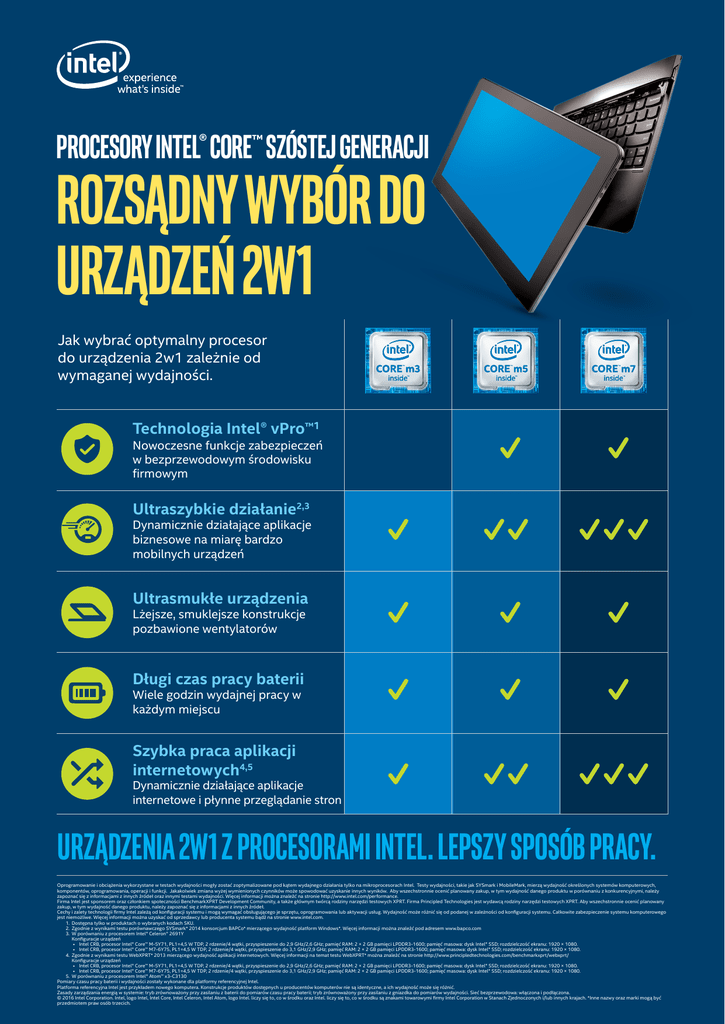 Procesory Intel® Core™ szóstej generacji Rozsądny wybóR do uRządzeń 2w1 Jak wybrać optymalny procesor do urządzenia 2w1 zależnie od wymaganej wydajności. Technologia Intel® vPro™1 Nowoczesne funkcje zabezpieczeń w bezprzewodowym środowisku firmowym Ultraszybkie działanie2,3 Dynamicznie działające aplikacje biznesowe na miarę bardzo mobilnych urządzeń Ultrasmukłe urządzenia Lżejsze, smuklejsze konstrukcje pozbawione wentylatorów Długi czas pracy baterii Wiele godzin wydajnej pracy w każdym miejscu Szybka praca aplikacji internetowych4,5 Dynamicznie działające aplikacje internetowe i płynne przeglądanie stron URZĄDZENIA 2W1 Z PROCESORAMI INTEL. LEPSZY SPOSÓB PRACY. Oprogramowanie i obciążenia wykorzystane w testach wydajności mogły zostać zoptymalizowane pod kątem wydajnego działania tylko na mikroprocesorach Intel. Testy wydajności, takie jak SYSmark i MobileMark, mierzą wydajność określonych systemów komputerowych, komponentów, oprogramowania, operacji i funkcji. Jakakolwiek zmiana wyżej wymienionych czynników może spowodować uzyskanie innych wyników. Aby wszechstronnie ocenić planowany zakup, w tym wydajność danego produktu w porównaniu z konkurencyjnymi, należy zapoznać się z informacjami z innych źródeł oraz innymi testami wydajności. Więcej informacji można znaleźć na stronie http://www.intel.com/performance. Firma Intel jest sponsorem oraz członkiem społeczności BenchmarkXPRT Development Community, a także głównym twórcą rodziny narzędzi testowych XPRT. Firma Principled Technologies jest wydawcą rodziny narzędzi testowych XPRT. Aby wszechstronnie ocenić planowany zakup, w tym wydajność danego produktu, należy zapoznać się z informacjami z innych źródeł. Cechy i zalety technologii firmy Intel zależą od konfiguracji systemu i mogą wymagać obsługującego je sprzętu, oprogramowania lub aktywacji usług. Wydajność może różnić się od podanej w zależności od konfiguracji systemu. Całkowite zabezpieczenie systemu komputerowego jest niemożliwe. Więcej informacji można uzyskać od sprzedawcy lub producenta systemu bądź na stronie www.intel.com. 1. Dostępna tylko w produktach o wybranych kodach SKU. 2. Zgodnie z wynikami testu porównawczego SYSmark* 2014 konsorcjum BAPCo* mierzącego wydajność platform Windows*. Więcej informacji można znaleźć pod adresem www.bapco.com 3. W porównaniu z procesorem Intel® Celeron® 2691Y Konfiguracje urządzeń • Intel CRB, procesor Intel® Core™ M-5Y71, PL1=4,5 W TDP, 2 rdzenie/4 wątki, przyspieszenie do 2,9 GHz/2,6 GHz; pamięć RAM: 2 × 2 GB pamięci LPDDR3-1600; pamięć masowa: dysk Intel® SSD; rozdzielczość ekranu: 1920 × 1080. • Intel CRB, procesor Intel® Core™ M7-6Y75, PL1=4,5 W TDP, 2 rdzenie/4 wątki, przyspieszenie do 3,1 GHz/2,9 GHz; pamięć RAM: 2 × 2 GB pamięci LPDDR3-1600; pamięć masowa: dysk Intel® SSD; rozdzielczość ekranu: 1920 × 1080. 4. Zgodnie z wynikami testu WebXPRT* 2013 mierzącego wydajność aplikacji internetowych. Więcej informacji na temat testu WebXPRT* można znaleźć na stronie http://www.principledtechnologies.com/benchmarkxprt/webxprt/ Konfiguracje urządzeń • Intel CRB, procesor Intel® Core™ M-5Y71, PL1=4,5 W TDP, 2 rdzenie/4 wątki, przyspieszenie do 2,9 GHz/2,6 GHz; pamięć RAM: 2 × 2 GB pamięci LPDDR3-1600; pamięć masowa: dysk Intel® SSD; rozdzielczość ekranu: 1920 × 1080. • Intel CRB, procesor Intel® Core™ M7-6Y75, PL1=4,5 W TDP, 2 rdzenie/4 wątki, przyspieszenie do 3,1 GHz/2,9 GHz; pamięć RAM: 2 × 2 GB pamięci LPDDR3-1600; pamięć masowa: dysk Intel® SSD; rozdzielczość ekranu: 1920 × 1080. 5. W porównaniu z procesorem Intel® Atom™ x3-C3130 Pomiary czasu pracy baterii i wydajności zostały wykonane dla platformy referencyjnej Intel. Platforma referencyjna Intel jest przykładem nowego komputera. Konstrukcje produktów dostępnych u producentów komputerów nie są identyczne, a ich wydajność może się różnić. Zasady zarządzania energią w systemie: tryb zrównoważony przy zasilaniu z baterii do pomiarów czasu pracy baterii; tryb zrównoważony przy zasilaniu z gniazdka do pomiarów wydajności. Sieć bezprzewodowa: włączona i podłączona. © 2016 Intel Corporation. Intel, logo Intel, Intel Core, Intel Celeron, Intel Atom, logo Intel. liczy się to, co w środku oraz Intel. liczy się to, co w środku są znakami towarowymi firmy Intel Corporation w Stanach Zjednoczonych i/lub innych krajach. *Inne nazwy oraz marki mogą być przedmiotem praw osób trzecich.