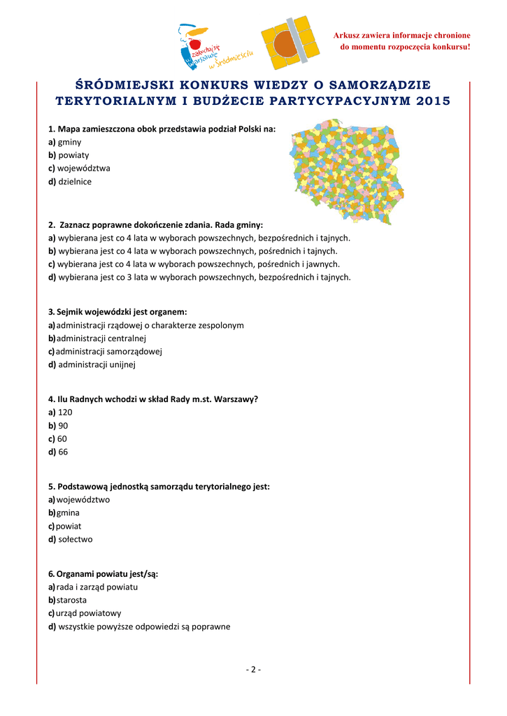 Arkusz zawiera informacje chronione do momentu rozpoczęcia konkursu! . ŚRÓDMIEJSKI KONKURS WIEDZY O SAMORZĄDZIE TERYTORIALNYM I BUDŻECIE PARTYCYPACYJNYM 2015 1. Mapa zamieszczona obok przedstawia podział Polski na: a) gminy b) powiaty c) województwa d) dzielnice 2. Zaznacz poprawne dokończenie zdania. Rada gminy: a) wybierana jest co 4 lata w wyborach powszechnych, bezpośrednich i tajnych. b) wybierana jest co 4 lata w wyborach powszechnych, pośrednich i tajnych. c) wybierana jest co 4 lata w wyborach powszechnych, pośrednich i jawnych. d) wybierana jest co 3 lata w wyborach powszechnych, bezpośrednich i tajnych. 3. Sejmik wojewódzki jest organem: a) administracji rządowej o charakterze zespolonym b) administracji centralnej c) administracji samorządowej d) administracji unijnej 4. Ilu Radnych wchodzi w skład Rady m.st. Warszawy? a) 120 b) 90 c) 60 d) 66 5. Podstawową jednostką samorządu terytorialnego jest: a) województwo b) gmina c) powiat d) sołectwo 6. Organami powiatu jest/są: a) rada i zarząd powiatu b) starosta c) urząd powiatowy d) wszystkie powyższe odpowiedzi są poprawne -2- Arkusz zawiera informacje chronione do momentu rozpoczęcia konkursu! . ŚRÓDMIEJSKI KONKURS WIEDZY O SAMORZĄDZIE TERYTORIALNYM I BUDŻECIE PARTYCYPACYJNYM 2015 7. Kadencja organów uchwałodawczych samorządu terytorialnego trwa: a) trzy lata b) cztery lata c) pięć lat d) wszystkie powyższe odpowiedzi są błędne 8. Mieszkańcy gminy zgodnie z Konstytucją RP tworzą: a) wspólnotę mieszkańców b) wspólnotę samorządową c) regionalną wspólnotę samorządową d) wspólnotę mieszkaniową 9. W Polsce obowiązuje podział państwa: a) trójstopniowy b) dwustopniowy c) jednostopniowy d) wszystkie powyższe odpowiedzi są błędne 10. Rada gminy to organ: a) uchwałodawczo-kontrolny b) wykonawczo-kontrolny c) wykonawczo-uchwałodawczy d) wszystkie powyższe odpowiedzi są błędne 11. Nadzór nad działalnością samorządu województwa sprawuje: a) Prezes Rady Ministrów b) Zgromadzenie Narodowe c) Prezydent RP d) Senat 12. W gminie do 20 000 mieszkańców liczba radnych wynosi: a) Trzynastu radnych b) Piętnastu radnych c) Osiemnastu radnych d) Dwudziestu radnych -3- Arkusz zawiera informacje chronione do momentu rozpoczęcia konkursu! . ŚRÓDMIEJSKI KONKURS WIEDZY O SAMORZĄDZIE TERYTORIALNYM I BUDŻECIE PARTYCYPACYJNYM 2015 13. Do organów nadzoru nad działalnością gminną należą: a) Prezydent RP, Prezes Rady Ministrów, wojewoda b) Prezydent RP, Minister Spraw Wewnętrznych i Administracji, wojewoda c) Wojewoda, regionalna izba obrachunkowa, Prezes Rady Ministrów d) Prezydent RP, Prezes Rady Ministrów, marszałek sejmiku wojewódzkiego 14. Zadaniem przewodniczącego sejmiku województwa jest wyłącznie: a) Organizowanie pracy sejmiku i prowadzenie obrad sejmiku b) Wykonywanie uchwał sejmiku c) Sporządzanie projektów uchwał sejmiku d) Żadna z powyższych odpowiedzi nie jest prawidłowa 15. Prezydium Rady Dzielnicy Śródmieście m.st. Warszawy składa się z: a) Przewodniczącego oraz czterech wiceprzewodniczących. b) Dwóch przewodniczących i dwóch wiceprzewodniczących. c) Przewodniczącego i Radnych Dzielnicy Śródmieście. d) Przewodniczącego i dwóch wiceprzewodniczących. 16. Kierownikiem urzędu gminy zgodnie z ustawą o samorządzie gminnym jest: a) Przewodniczący rady gminy b) Sekretarz gminy c) Wójt d) Osoba wyznaczona przez radę gminy 17. Co rozstrzyga o skróceniu kadencji sejmiku województwa? a) uchwała Premiera b) decyzja Sejmu c) referendum d) akt samorozwiązania 18. Kto obecnie pełni funkcję Burmistrza Dzielnicy Śródmieście m.st. Warszawy? a) p. Agnieszka Gierzyńska-Kierwińska b) p. Wojciech Bartelski c) p. Wojciech Turkowski d) p. Jarosław Jóźwiak -4- Arkusz zawiera informacje chronione do momentu rozpoczęcia konkursu! . ŚRÓDMIEJSKI KONKURS WIEDZY O SAMORZĄDZIE TERYTORIALNYM I BUDŻECIE PARTYCYPACYJNYM 2015 . 19. Zarząd Dzielnicy Śródmieście m.st. Warszawy składa się z: a) Burmistrza oraz czterech wiceburmistrzów. b) Dwóch przewodniczących i dwóch wiceprzewodniczących. c) Burmistrza i trzech wiceburmistrzów. d) przewodniczącego i Radnych Dzielnicy Śródmieście 20. Ile osób liczy zarząd dzielnicy m.st. Warszawy powyżej 100 tysięcy mieszkańców? a) od 3 do 5 członków b) od 5 do 7 członków c) od 4 do 6 członków d) wszystkie powyższe odpowiedzi są błędne 21. Która edycja budżetu partycypacyjnego w mieście stołecznym Warszawie została ogłoszona przez Prezydent Warszawy Hannę Gronkiewicz-Waltz w październiku 2014 roku? a) 2 b) 1 c) 3 d) 5 22. Jaką kwotę przeznaczyła Dzielnica Śródmieście m.st. Warszawy na realizację Budżetu Partycypacyjnego 2016? a) 2 643 000 zł b) 6 200 000 zł c) 51 215 551 zł d) 1 545 500 zł 23. Kto może wziąć udział w śródmiejskim budżecie partycypacyjnym? a) każdy deklaratywny mieszkaniec Warszawy b) mieszkaniec posiadający Kartę Warszawiaka c) tylko osoby zameldowane w Warszawie d) tylko mieszkańcy Dzielnicy Śródmieście m.st. Warszawy 24. W drugiej edycji Budżetu Partycypacyjnego w Warszawie do realizacji mogą być wybrane projekty: a) z zakresu obejmującego zadania własne m.st. Warszawy b) z zakresu obejmującego zadania własne dzielnic c) wszystkie zgłoszone przez mieszkańców d) tylko projekty inwestycyjne -5- Arkusz zawiera informacje chronione do momentu rozpoczęcia konkursu! . ŚRÓDMIEJSKI KONKURS WIEDZY O SAMORZĄDZIE TERYTORIALNYM I BUDŻECIE PARTYCYPACYJNYM 2015 . 25. Dzielnica Śródmieście m.st. Warszawy w drugiej edycji budżetu partycypacyjnego została podzielona: a) na dwa obszary b) na dwa obszary lokalne i jeden ogólnodzielnicowy c) na osiem obszarów d) nie została podzielona jest tylko jeden obszar 26. W głosowaniu nad projektami do śródmiejskiego budżetu partycypacyjnego nie mogą wziąć udziału: a) osoby zameldowane w Poznaniu b) osoby niepełnoletnie c) osoby nie mieszkające w Warszawie d) osoby