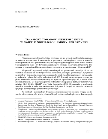 ZESZYTY NAUKOWE WSOWL Nr 3 (145) 2007 Przemysław MAJEWSKI TRANSPORT TOWARÓW NIEBEZPIECZNYCH W ŚWIETLE NOWELIZACJI UMOWY ADR 2007 - 2009 Wprowadzenie Nieustanny rozwój nauki, który przekłada się na wzrost możliwości przemysłu w zakresie wytwarzania i stosowania w procesach produkcyjnych nowych towarów niebezpiecznych oraz permanentne wysiłki legislacyjne mające na celu wzrost stopnia bezpieczeństwa ludzi i środowiska naturalnego w obszarze stosowania i transportu drogowego wymuszają cykliczną nowelizację przepisów w tym obszarze - Umowy ADR1. Aktywność organizacji międzynarodowych na przestrzeni ostatnich 20 lat ma wszelkie znamiona tak modnego obecnie określenia, jakim jest globalizacja2. Spojrzenie na problemy transportu europejskiego przestało mieć charakter regionalny, ograniczający działania i plany do krajów członkowskich UE. Rozwój transportu postrzegany jest przez kreatorów polityki transportowej w aspekcie ogólnoeuropejskim, a nawet transkontynentalnym. Do najważniejszych podmiotów europejskiej polityki transportowej należy: EKG ONZ3, EKMT4 oraz Unia Europejska (UE). Organizacje te podejmują wszelkie starania w celu zharmonizowania inicjatyw i decyzji w zakresie tworzenia spójnego europejskiego systemu transportowego. Po polskich i europejskich drogach codziennie przewozi się setki tysięcy ton towarów niebezpiecznych5 służących do różnych celów: technologicznych, konsumpcyj 1 - - 2 3 - - - 4 5 kpt. mgr Przemysław MAJEWSKI - Wyższa Szkoła Oficerska Wojsk Lądowych, ADR - skrót zaczerpnięty zarówno z języka angielskiego: The European Agreement Concerning the International Carriage of Dangerous Goods by Road, jak i języka francuskiego: l'Accord Europeen Relatif Au transport International des Merchandises Dangereuses par Reute. Globalizacja - bardzo szeroki i złożony proces, mający wpływ na wszystkie sfery naszego życia: ekonomiczną, społeczną, polityczną, kulturową itd., w skali ogólnoświatowej, którego zasadniczą cechą jest integrowanie działań, procesów i podmiotów w ogólnoświatowy (globalny) system. Por.: T. Jemioło, Globalizacja szanse i zagrożenia, Warszawa 2000, s. 5 EKG ONZ - Europejska Komisja Gospodarcza ONZ. EKMT - Europejska Konferencja Ministrów Transportu. Towar niebezpieczny – to materiał (substancja, preparat, mieszanina, odpad) oraz przedmiot (wyrób TRANSPORT TOWARÓW NIEBEZPIECZNYCH W ŚWIETLE NOWELIZACJI UMOWY… nych (paliwa) oraz wykorzystywanych przez siły zbrojne w operacjach wojskowych, w procesach szkoleniowych i mobilizacyjnych. Ze statystyk wynika, że najczęstszymi przyczynami zdarzeń w transporcie drogowym towarów niebezpiecznych jest nieprzestrzeganie przepisów dotyczących ich przewozu, a wyspecjalizowane jednostki Państwowej Straży Pożarnej wyjeżdżają na akcje ratownicze średnio co 15 minut6. Ponadto rozrastający się w szybkim tempie rynek przewozów drogowych jest jednym z czynników pobudzających naszą gospodarkę, a nieustanny rozwój nauki jest czynnikiem wzrostu możliwości przemysłu w zakresie wytwarzania i stosowania w procesach produkcyjnych nowych towarów niebezpiecznych. Zasady bezpiecznego przewozu drogowego tego typu towarów w ruchu krajowym i międzynarodowym są uregulowane umową europejską, dotyczącą przewozu drogowego towarów niebezpiecznych, określoną skrótem ADR, która jest podstawowym aktem prawnym w omawianej gałęzi transportu. Stosowanie zasad ADR oznacza, że ładunki, w tym szczególnie niebezpieczne, które są przemieszczane po drogach mają nie tylko takie same nazwy i numery rozpoznawcze (identyfikacyjne), ale także są w ten sam sposób badane, klasyfikowane, pakowane i znakowane. Znajomość tych przepisów jest obowiązkiem wszystkich uczestników drogowego przewozu towarów niebezpiecznych, a zwłaszcza kierowców, którzy muszą zdobyć odpowiednią wiedzę i uprawnienia w zakresie przewozu tych towarów. Umowa ADR ADR to europejska umowa dotycząca międzynarodowego przewozu drogowego towarów niebezpiecznych, sporządzona w Genewie 30 września 1957 roku pod auspicjami Komisji Gospodarczej Narodów Zjednoczonych, opracowana i wydana przez Europejski Komitet Transportu Wewnętrznego i od tego czasu podlega stałej modernizacji, ratyfikowana przez Polskę w 1975 r., a tekst przepisów został ogłoszony w załączniku do Dz. U. Nr 35,poz. 189, wprowadzony w życie Rozporządzeniem Ministra Komunikacji i Spraw Wewnętrznych z dnia 02 grudnia 1983 roku w sprawie warunków i kontroli przewozu drogowego towarów niebezpiecznych. Umowa ta stanowi wieloletni dorobek międzynarodowej grupy ekspertów z rożnych dziedzin nauki i techniki z uwzględnieniem specyfiki danego rodzaju transportu w oparciu o zalecenia ONZ. Powyższe uregulowania prawne wpływają przede wszystkim na unifikację w skali europejskiej wymagań technicznych i prawno-organizacyjnych, co w efekcie podnosi poziom sprawności funkcjonowania transportu, bezpieczeństwa oraz umożliwia prowadzenie szeroko rozumianych kontroli drogowych i granicznych. - - Umowa ADR składa się z umowy głównej oraz z załączników A i B, będących jej integralną częścią. Umowa główna określa stosunki prawne między uczestniczącymi państwami, natomiast przepisy regulujące w szerokim zakresie warunki przewozu poszczególnych towarów niebezpiecznych w międzynarodowym transporcie samochodowym są zawarte w jej załącznikach. Załączniki A i B podzielone są na dziewięć części, - - - 6 zawierający materiał niebezpieczny), których przewóz regulowany jest umową ADR, Por.: K. Grzegorczyk, B. Hancyk, R. Buchnar, Towary niebezpieczne w transporcie drogowym - ADR 2007-2009, Błonie 2007, s.7 Oznaczenie w przewozie drogowych materiałów niebezpiecznych. [online]. [dostęp: 07 września 2007]. Dostępny w Internecie: http:// www.straz.gov.pl/?/pl/prewencja. 21 Przemysław MAJEWSKI przy czym załącznik A zawiera części od 1 do 7, a załącznik B czę