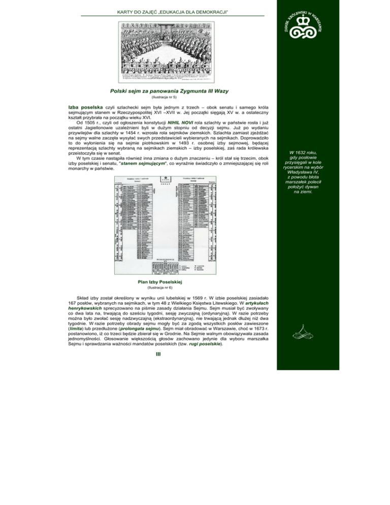 KARTY DO ZAJĘĆ „EDUKACJA DLA DEMOKRACJI” Polski sejm za panowania Zygmunta III Wazy (Ilustracja nr 5) Izba poselska czyli szlachecki sejm była jednym z trzech – obok senatu i samego króla sejmującym stanem w Rzeczypospolitej XVI –XVII w. Jej początki sięgają XV w. a ostateczny kształt przybrała na początku wieku XVI. Od 1505 r., czyli od ogłoszenia konstytucji NIHIL NOVI rola szlachty w państwie rosła i już ostatni Jagiellonowie uzależnieni byli w dużym stopniu od decyzji sejmu. Już po wydaniu przywilejów dla szlachty w 1454 r. wzrosła rola sejmików ziemskich. Szlachta zamiast zjeżdżać na sejmy walne zaczęła wysyłać swych przedstawicieli wybieranych na sejmikach. Doprowadziło to do wyłonienia się na sejmie piotrkowskim w 1493 r. osobnej izby sejmowej, będącej reprezentacją szlachty wybraną na sejmikach ziemskich – izby poselskiej, zaś rada królewska przeistoczyła się w senat. W tym czasie nastąpiła również inna zmiana o dużym znaczeniu – król stał się trzecim, obok izby poselskiej i senatu, "stanem sejmującym", co wyraźnie świadczyło o zmniejszającej się roli monarchy w państwie. Plan Izby Poselskiej (Ilustracja nr 6) Skład izby został określony w wyniku unii lubelskiej w 1569 r. W izbie poselskiej zasiadało 167 posłów, wybranych na sejmikach, w tym 48 z Wielkiego Księstwa Litewskiego. W artykułach henrykowskich sprecyzowano na piśmie zasady działania Sejmu. Sejm musiał być zwoływany co dwa lata na, trwającą do sześciu tygodni, sesję zwyczajną (ordynaryjną). W razie potrzeby można było zwołać sesję nadzwyczajną (ekstraordynaryjną), nie trwającą jednak dłużej niż dwa tygodnie. W razie potrzeby obrady sejmu mogły być za zgodą wszystkich posłów zawieszone (limita) lub przedłużone (prolongata sejmu). Sejm miał obradować w Warszawie, choć w 1673 r. postanowiono, iż co trzeci będzie zbierał się w Grodnie. Na Sejmie walnym obowiązywała zasada jednomyślności. Głosowanie większością głosów zachowano jedynie dla wyboru marszałka Sejmu i sprawdzania ważności mandatów poselskich (tzw. rugi poselskie). III W 1632 roku, gdy posłowie przysięgali w kole rycerskim na wybór Władysława IV, z powodu błota marszałek polecił położyć dywan na ziemi. KARTY DO ZAJĘĆ „EDUKACJA DLA DEMOKRACJI” Fragment pacta conventa Henryka Walezego – pierwszego elekta: Pacta conventa Henryka Walezego z 1573 r. (Ilustracja nr 7) 1. Aby były pewne pakta między Koroną Polską a Królestwem Francuskim. 2. Aby król francuski na wojnę moskiewską 4 tysiące Gwaskonów posłał i na sześć miesięcy żołd im zapłacił, a król potem, żeby im z skrzynki swej zapłacił. 3. Aby król kosztem swym na morzu armatę chował i narwickiej nawigacyjej zabronił. 4. Aby naszym kupcom wolno było jeździć do Francji na jaki nowy zawołany jarmark, a stamtąd do Aleksandri równo z kupcami francuskimi. 5. Aby król do Korony z państw swych powinien był wnaszać na każdy rok czterykroć sto tysiący i pięćdziesiąt tysięcy złotych. 6. Aby wszystkie długi królewskie i Rzplitej popłacił, połowicę przyjechawszy do Korony, a drugą połowicę we dwie lecie. 7. Aby Akademię Krakowską restaurował i ludzie uczone w niej kosztem swym chował. 8. Aby przynajmniej sto szlachciców polskich kosztem swym w akademiej paryskiej wychowywał, aby też połowicę drugą na dworze królów i książąt postronnych. 9. Aby tu cudzoziemców żadnych król nie chował, a te co by z nim przyjechali, żeby precz odesłał, zapłaciwszy im z skrzynki swej, którym żadnych dzierżaw i urzędów żeby nie dawał, tylko wedle praw koronnych. A na ostatek, aby im prawa wszystkie poprzysiągł tak, jako mu na piśmie przysięga od wszystkich stanów zgodnie będzie podana a osobno od stanów świeckich ze strony konfederacyjej. Co wszystko posłowie imieniem króla francuskiego i Henryka brata jego poprzysięgli. A dopiero Firlej wojewoda krakowski, kazał obwołać, jako marszałek koronny, króla. III