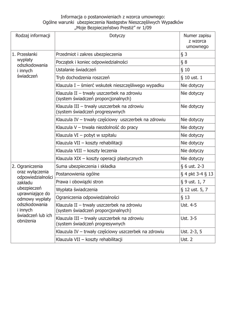 Informacja o postanowieniach z wzorca umownego: Ogólne warunki ubezpieczenia Następstw Nieszczęśliwych Wypadków „Moje Bezpieczeństwo Prestiż” nr 1/09 Rodzaj informacji 1. P rzesłanki wypłaty odszkodowania i innych świadczeń 2. O graniczenia oraz wyłączenia odpowiedzialności zakładu ubezpieczeń uprawniające do odmowy wypłaty odszkodowania i innych świadczeń lub ich obniżenia Dotyczy Numer zapisu z wzorca umownego Przedmiot i zakres ubezpieczenia §3 Początek i koniec odpowiedzialności §8 Ustalanie świadczeń § 10 Tryb dochodzenia roszczeń § 10 ust. 1 Klauzula I – śmierć wskutek nieszczęśliwego wypadku Nie dotyczy Klauzula II – trwały uszczerbek na zdrowiu (system świadczeń proporcjonalnych) Nie dotyczy Klauzula III – trwały uszczerbek na zdrowiu (system świadczeń progresywnych Nie dotyczy Klauzula IV – trwały częściowy uszczerbek na zdrowiu Nie dotyczy Klauzula V – trwała niezdolność do pracy Nie dotyczy Klauzula VI – pobyt w szpitalu Nie dotyczy Klauzula VII – koszty rehabilitacji Nie dotyczy Klauzula VIII – koszty leczenia Nie dotyczy Klauzula XIX – koszty operacji plastycznych Nie dotyczy Suma ubezpieczenia i składka § 6 ust. 2-3 Postanowienia ogólne § 4 pkt 3-4 § 13 Prawa i obowiązki stron § 9 ust. 1, 7 Wypłata świadczenia § 12 ust. 5, 7 Ograniczenia odpowiedzialności § 13 Klauzula II – trwały uszczerbek na zdrowiu (system świadczeń proporcjonalnych) Ust. 4-5 Klauzula III – trwały uszczerbek na zdrowiu (system świadczeń progresywnych Ust. 3-5 Klauzula IV – trwały częściowy uszczerbek na zdrowiu Ust. 2-3, 5 Klauzula VII – koszty rehabilitacji Ust. 2 OGÓLNE WARUNKI UBEZPIECZENIA NASTĘPSTW NIESZCZĘŚLIWYCH WYPADKÓW MOJE BEZPIECZEŃSTWO PRESTIŻ NR 1/09 POSTANOWIENIA OGÓLNE §1 Niniejsze ogólne warunki ubezpieczenia następstw nieszczęśliwych wypadków „Moje Bezpieczeństwo Prestiż” mają zastosowanie do umów ubezpieczenia zawieranych przez Aviva Towarzystwo Ubezpieczeń Ogólnych S.A, zwane dalej „Aviva”, z osobami fizycznymi, prawnymi lub jednostkami organizacyjnymi niebędącymi osobami prawnymi, lecz posiadającymi zdolność prawną oraz z przedsiębiorcami. DEFINICJE §2 Ilekroć w niniejszych ogólnych warunkach, wniosku o zawarcie umowy ubezpieczenia na ich podstawie, dokumencie potwierdzającym zawarcie umowy ubezpieczenia oraz w innych pismach i oświadczeniach składanych w związku z zawarciem tej umowy lub w jej wykonaniu używa się wymienionych poniżej terminów, należy przez nie rozumieć w odpowiednim przypadku i liczbie: 1. koszty rehabilitacji – niezbędne z medycznego punktu widzenia koszty prowadzonego pod kontrolą lekarza procesu leczniczego mającego na celu uzyskanie przez ubezpieczonego optymalnego poziomu funkcjonowania utraconych w wyniku nieszczęśliwego wypadku czynności uszkodzonego narządu lub narządów, realizowanego metodami kinezyterapii, fizykoterapii, farmakoterapii oraz koszty zaopatrzenia ortopedycznego z wyłączeniem kosztów protez ortopedycznych, o ile koszty te zostały poniesione przez ubezpieczonego w ciągu 24 miesięcy od dnia zajścia nieszczęśliwego wypadku; za koszty rehabilitacji nie rozumie się kosztów badań wykonywanych w czasie leczenia, 2. nieszczęśliwy wypadek – nagłe zdarzenie powstałe w okresie odpowiedzialności Avivy, wywołane przyczyną zewnętrzną, w następstwie którego ubezpieczony niezależnie od swej woli doznał trwałego uszczerbku na zdrowiu, lub zmarł, przy czym za nieszczęśliwy wypadek nie uważa się chorób, nawet takich, które występują nagle, w szczególności wskutek zawału serca lub udaru mózgu; nieszczęśliwy wypadek może mieć miejsce na całym świecie, 3. opinia lekarska – rozpoznanie sporządzone na piśmie przez lekarza wskazanego przez Avivę, wydawane bez przeprowadzenia badania ubezpieczonego, na podstawie udostępnionej dokumentacji medycznej i dokumentacji ubezpieczeniowej dotyczącej zdarzenia ubezpieczeniowego, 4. osoba bliska – małżonek ubezpieczonego lub osoba pozostająca faktycznie we wspólnym pożyciu z ubezpieczonym, jego dzieci, pasierbowie, dzieci przysposobione albo przyjęte na wychowanie, rodzice, przysposabiający, rodzeństwo, ojczym, macocha, teściowie, dziadkowie, wnukowie, zięciowie i synowe, 5. orzeczenie lekarskie – rozpoznanie sporządzone na piśmie przez lekarza wskazanego przez Avivę, wydawane po przeprowadzeniu badania ubezpieczonego oraz przeanalizowaniu dokumentacji medycznej i dokumentacji ubezpieczeniowej dotyczącej zdarzenia ubezpieczeniowego, 6. pobyt w szpitalu – trwający nieprzerwanie, dłużej niż trzy dni, będący następstwem nieszczęśliwego wypadku pobyt ubezpieczonego w szpitalu, w trakcie którego ubezpieczony poddał się leczeniu skutków nieszczęśliwego wypadku; w rozumieniu niniejszych ogólnych warunków dzień pobytu w szpitalu oznacza dzień kalendarzowy, w którym ubezpieczony przebywał w szpitalu, niezależnie od tego, ile czasu w danym dniu trwał jego pobyt, przy czym za pierwszy przyjmuje się dzień rejestracji, a za ostatni – dzień wypisu ze szpitala, 7. przedsiębiorca – osoba fizyczna, osoba prawna lub jednostka organizacyjna niebędąca osobą prawną lecz posiadająca zdolność prawną, która we własnym imieniu prowadzi działalność gospodarczą lub zawodową, 8. reklamacja – wystąpienie (w tym skarga i zażalenie) skierowane do Avivy przez ubezpieczającego, ubezpieczonego, uposażonego lub innego uprawnionego z umowy ubezpieczenia, w którym ubezpieczający, ubezpieczony, uposażony lub inny uprawniony z umowy ubezpieczenia zgłasza zastrzeżenia dotyczące usług świadczonych przez Avivę, 9. szpital – zakład opieki zdrowotnej świadczący przy wykorzystaniu wykwalifikowanego zespołu lekarskiego i pielęgniarskiego całodobową opiekę nad chorymi w zakresie diagnostyki i leczenia, w tym leczenia chirurgicznego; 1 określenie to nie obejmuje domu opieki dla pr