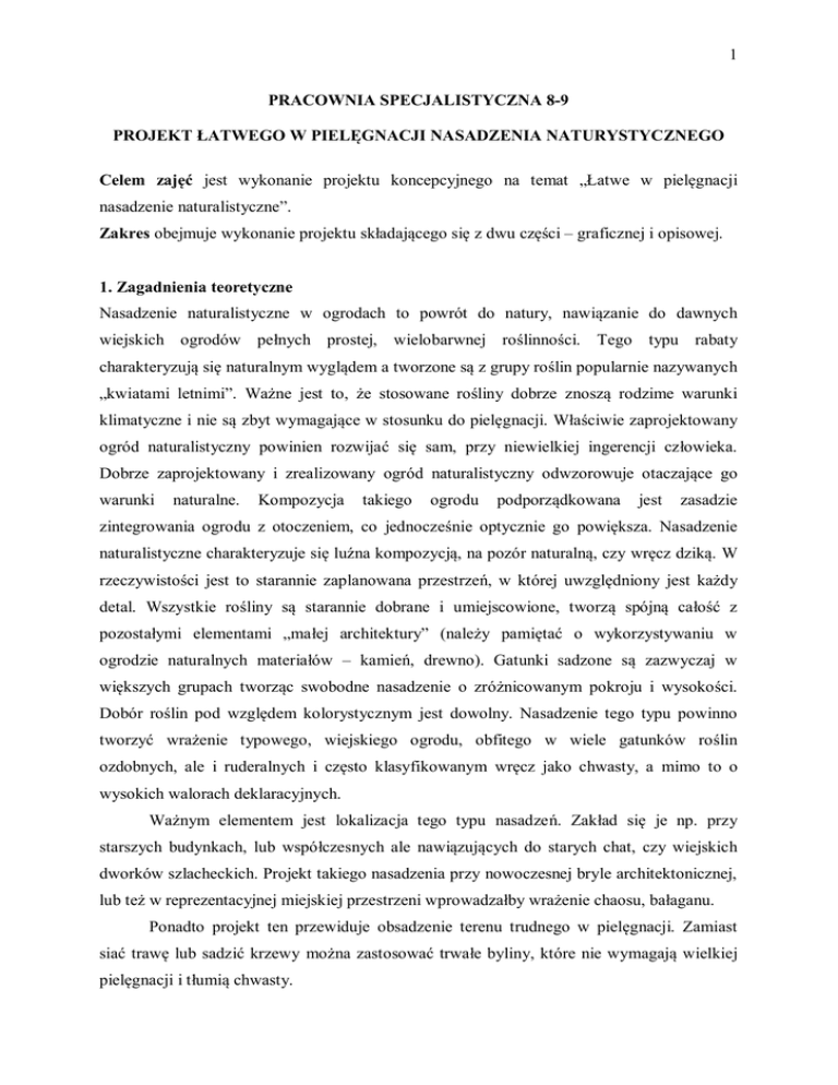 1 PRACOWNIA SPECJALISTYCZNA 8-9 PROJEKT ŁATWEGO W PIELĘGNACJI NASADZENIA NATURYSTYCZNEGO Celem zajęć jest wykonanie projektu koncepcyjnego na temat „Łatwe w pielęgnacji nasadzenie naturalistyczne”. Zakres obejmuje wykonanie projektu składającego się z dwu części – graficznej i opisowej. 1. Zagadnienia teoretyczne Nasadzenie naturalistyczne w ogrodach to powrót do natury, nawiązanie do dawnych wiejskich ogrodów pełnych prostej, wielobarwnej roślinności. Tego typu rabaty charakteryzują się naturalnym wyglądem a tworzone są z grupy roślin popularnie nazywanych „kwiatami letnimi”. Ważne jest to, że stosowane rośliny dobrze znoszą rodzime warunki klimatyczne i nie są zbyt wymagające w stosunku do pielęgnacji. Właściwie zaprojektowany ogród naturalistyczny powinien rozwijać się sam, przy niewielkiej ingerencji człowieka. Dobrze zaprojektowany i zrealizowany ogród naturalistyczny odwzorowuje otaczające go warunki naturalne. Kompozycja takiego ogrodu podporządkowana jest zasadzie zintegrowania ogrodu z otoczeniem, co jednocześnie optycznie go powiększa. Nasadzenie naturalistyczne charakteryzuje się luźna kompozycją, na pozór naturalną, czy wręcz dziką. W rzeczywistości jest to starannie zaplanowana przestrzeń, w której uwzględniony jest każdy detal. Wszystkie rośliny są starannie dobrane i umiejscowione, tworzą spójną całość z pozostałymi elementami „małej architektury” (należy pamiętać o wykorzystywaniu w ogrodzie naturalnych materiałów – kamień, drewno). Gatunki sadzone są zazwyczaj w większych grupach tworząc swobodne nasadzenie o zróżnicowanym pokroju i wysokości. Dobór roślin pod względem kolorystycznym jest dowolny. Nasadzenie tego typu powinno tworzyć wrażenie typowego, wiejskiego ogrodu, obfitego w wiele gatunków roślin ozdobnych, ale i ruderalnych i często klasyfikowanym wręcz jako chwasty, a mimo to o wysokich walorach deklaracyjnych. Ważnym elementem jest lokalizacja tego typu nasadzeń. Zakład się je np. przy starszych budynkach, lub współczesnych ale nawiązujących do starych chat, czy wiejskich dworków szlacheckich. Projekt takiego nasadzenia przy nowoczesnej bryle architektonicznej, lub też w reprezentacyjnej miejskiej przestrzeni wprowadzałby wrażenie chaosu, bałaganu. Ponadto projekt ten przewiduje obsadzenie terenu trudnego w pielęgnacji. Zamiast siać trawę lub sadzić krzewy można zastosować trwałe byliny, które nie wymagają wielkiej pielęgnacji i tłumią chwasty. 2 2. Wykonanie projektu Część graficzną stanowi rysunek (projekt koncepcyjny) będący graficznym przedstawieniem projektowanej rabaty. Powierzchnie zajmowane przez poszczególne gatunki roślin muszą się różnić miedzy sobą, w tym celu należy (poza zastosowaniem odmiennej kolorystyki i/lub szrafury) opatrzyć je numerami. Rysunek musi być zaopatrzony w skalę i prezentację kierunku geograficznego jego usytuowania w terenie. Należy też zamieścić informację co do powierzchni zajmowanej przez poszczególne gatunki i wymaganej liczby sadzonek roślin. Liczba określająca gatunek Nazwa gatunku Powierzchnia m2 Liczba sztuk Opis do projektu powinien zawierać omówienie: - zasad doboru roślin ze względu na charakter rabaty, czyli temat zadania - zasad doboru roślin ze względów technicznych - autorską koncepcję projektu - planowaną lokalizację - charakterystykę zastosowanych roślin Do opisu należy dołączyć tabelę zawierającą najważniejsze dane na temat zastosowanych gatunków roślin (patrz tabela 1). W poszczególnych kolumnach muszą kolejno być umieszczone informacje dotyczące wybranego gatunku rośliny ozdobnej, typu rośliny (jednoroczna, dwuletnia, bylin, bylina cebulowa, pnącze, krzew), wysokość wybranego gatunku (lub odmiany), okres kwitnienia, barwa kwiatów (w przypadku ozdobnych z liści – barwa liści), liczba roślin na m2, wymagania do stanowiska: światła (pełne, półcień, cień) i podłoża (wilgotne, normalne, suche). 3. Uwagi: Przy doborze roślin należy pamiętać: - żeby wykorzystywać gatunki rodzime, dobrze znoszące nasze warunki klimatyczne - stosować rośliny dobrze znane, od dawna stosowane, choć czasami zapomniane - rośliny o niewielkich wymaganiach w stosunku do otoczenia i pielęgnacji - należy dokładnie przemyśleć lokalizację rabaty 4. Propozycja gatunków roślin 1. Przywrotnik ostroklapowy – Alchemilla mollis 3 2. Zawilec mieszańcowy – Anemone x hybrida 3. Aster rozkrzewiony – Aster divaricatus 4. Aster gładki – Aster laevis ‘Climax’ 5. Aster – Aster lateriflorus ‘Lady in Black’ 6. Brunera wielkolistna – Brunnera macrophylla 7. Trzcinnik ostrokwiatowy – Calamagrostis x acutiflora 8. Turzyca włosista – Carex comans 9. Sadziec pomarszczony – Eupatorium rugosum 10. Wilczomlecz błotny – Euphorbia palustris 11. Bodziszek oksfordzki – Geranium x oxonianum 12. Bodziszek Endressa – Geranium endresii 13. Bodziszek – Geranium ‘Spinners’ 14. Bodziszek – Geranium ‘Johnson’s Blue’ 15. Bodziszek różnobarwny – Geranium versicolor 16. Kosmatka olbrzymia – Luzula sylvatica 17. Rdest plamisty – Persicaria bistorta 18. Rdest wężownik – Persicaria amplexicaulis 19. Rudbekia błyskotliwa – Rudbeckia fulgida 20. Barwinek większy – Vinca major 21. Śnieżyczka przebiśnieg – Galanthus nivalis 22. Narcyz – Narcissus sp. 23. Malwa ogrodowa – Althea rosea 24. Lwia paszcza większa – Antirrhinum majus 25. Dzwonek ogrodowy – Campanula medium 26. Ostróżka ogrodowa – Delphinium sp. 27. Kosmos podwójnie pierzasty – Cosmos bipinnatus