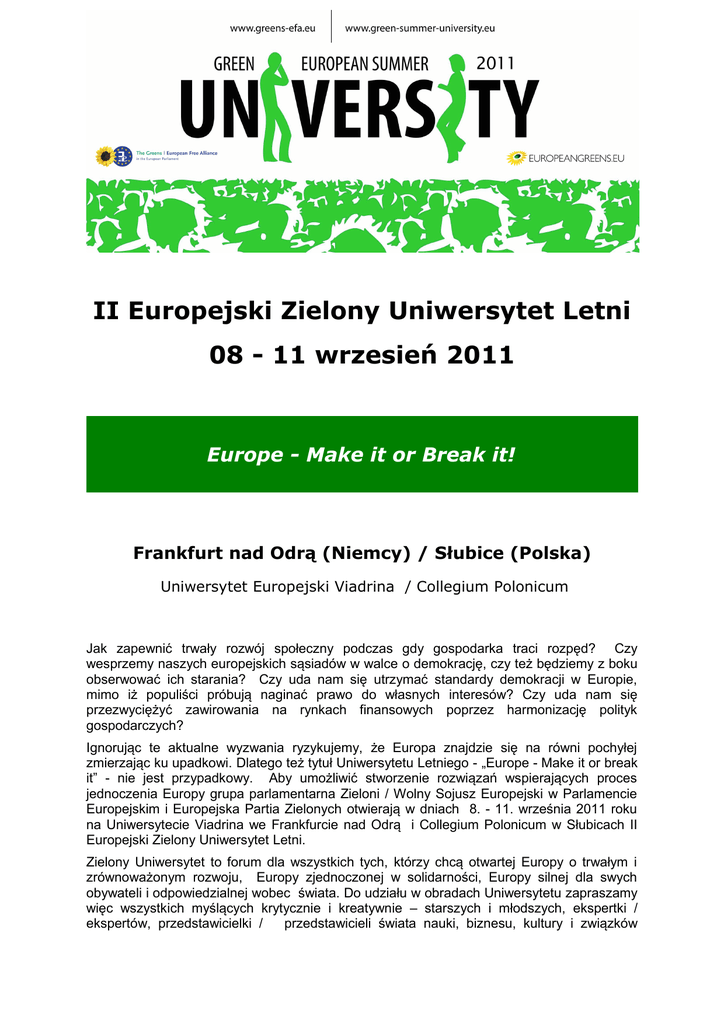 II Europejski Zielony Uniwersytet Letni 08 - 11 wrzesień 2011 Europe - Make it or Break it! Frankfurt nad Odrą (Niemcy) / Słubice (Polska) Uniwersytet Europejski Viadrina / Collegium Polonicum Jak zapewnić trwały rozwój społeczny podczas gdy gospodarka traci rozpęd? Czy wesprzemy naszych europejskich sąsiadów w walce o demokrację, czy też będziemy z boku obserwować ich starania? Czy uda nam się utrzymać standardy demokracji w Europie, mimo iż populiści próbują naginać prawo do własnych interesów? Czy uda nam się przezwyciężyć zawirowania na rynkach finansowych poprzez harmonizację polityk gospodarczych? Ignorując te aktualne wyzwania ryzykujemy, że Europa znajdzie się na równi pochyłej zmierzając ku upadkowi. Dlatego też tytuł Uniwersytetu Letniego - „Europe - Make it or break it” - nie jest przypadkowy. Aby umożliwić stworzenie rozwiązań wspierających proces jednoczenia Europy grupa parlamentarna Zieloni / Wolny Sojusz Europejski w Parlamencie Europejskim i Europejska Partia Zielonych otwierają w dniach 8. - 11. września 2011 roku na Uniwersytecie Viadrina we Frankfurcie nad Odrą i Collegium Polonicum w Słubicach II Europejski Zielony Uniwersytet Letni. Zielony Uniwersytet to forum dla wszystkich tych, którzy chcą otwartej Europy o trwałym i zrównoważonym rozwoju, Europy zjednoczonej w solidarności, Europy silnej dla swych obywateli i odpowiedzialnej wobec świata. Do udziału w obradach Uniwersytetu zapraszamy więc wszystkich myślących krytycznie i kreatywnie – starszych i młodszych, ekspertki / ekspertów, przedstawicielki / przedstawicieli świata nauki, biznesu, kultury i związków zawodowych, intelektualistki i intelektualistów oraz studentki i studentów a także reprezentantki/reprezentantów społeczeństwa obywatelskiego. Zapraszamy „Zielonych” i „Niebieskich”, „Czerwonych”, „Czarnych” i „Różowych”, przyjaciół i znajomych. Uniwersytet Letni to więcej niż tylko konferencja: podczas czterech sesji plenarnych będzie można poznać i przedyskutować opinie czołowych europejskich intelektualistek i intelektualistów oraz polityczek i polityków na temat europejskiej przyszłości, podczas interaktywnych warsztatów, organizowanych we współpracy z naszymi partnerami będzie okazja, by zaprezentować własne umiejętności, opinie i przekonania. Zielony Uniwersytet Letni postrzegamy jako „Laboratorium Myśli”: chcemy znaleźć innowacyjne odpowiedzi na aktualne europejskie wyzwania, wypracować konstruktywne rozwiązania i koncepty. Chcemy inicjować zmiany i tworzyć postęp – słowem - kreować przyszłość Europy. Będziemy słuchać i obserwować, czytać i dyskutować o tym, jak „udźwignąć Europę” … a nie skazać ją upadek. Biorąc udział w Uniwersytecie Letnim możesz także liczyć na swobodną atmosferę, dobrą zabawę z muzyką „na żywo” i wydarzeniami kulturalnymi w miłym towarzystwie. Viadrinę we Frankfurcie nad Odrą i Collegium Polonicum w Słubicach nie bez powodu wybraliśmy jako miejsce dyskusji i debat. Ten międzynarodowy Uniwersytet z siedzibą w dwóch miastach połączonych mostem nad Odrą jest miejscem symbolicznym łączącym na granicy dwóch krajów - Polski i Niemiec - także Europę. Zarys programu (organizatorzy zastrzegają sobie możliwość wprowadzenia zmian) Szczegółowa oraz regularnie aktualizowana wersja programu znajduje się na naszej stronie internetowej www.green-summer-university.eu. Wszystkie debaty plenarne i warsztaty będą tłumaczone na język polski, francuski, angielski oraz niemiecki (włoskie i hiszpańskie tłumaczenia zostaną potwierdzone) Czwartek 08 / 09 / 2011 od 14.00 15.00 – 17.00 Rejestracja na Uniwersytecie Viadrina Treningi (ok. 5 treningów jednocześnie): • • „Jak organizować kampanie społeczne w sieci?” • więcej: www.green-summer-university.eu Parlament: “Jak prowadzić negocjacje dotyczące zmian klimatu?” gry sytuacyjne alternatywnie: 15.00 – 17.00 17.00 – 19.00 Wycieczki po mieście i okolicy Sesje warsztatowe 1 (ok. 10 warsztatów odbywających się jednocześnie): • • “Zielona gospodarka w krajach post- komunistycznych.” • • „Młodzi dla Demokracji” “Wyzwania dla Europejskiej Polityki Bezpieczeństwa i Obrony: Piractwo w Somalii.” więcej: www.green-summer-university.eu. 19.00-20.00 Kolacja „Slow Food” i „Kiermasz lokalnych produktów ekologicznych” (tbc) 20.00 Wydarzenia kulturalne 1: Kino „Open Air” : "Salami Aleikum" Greens/EFA Summer University 2011 - www.green-summer-university .eu Piątek 09 / 09 / 2011 10.00-11.30 Sesje warsztatowe 2: (ok. 10 warsztatów odbywających się jednocześnie): • • • • 11.30 – 13.00 „Jak wykorzystać możliwości reformy Wspólnej Polityki Rolnej?” „Cyfrowe Wykluczenie - dostęp do internetu prawem człowieka?” „Czy w równym społeczeństwie wszystkim żyje się lepiej?” więcej: www.green-summer-university.eu. Wydarzenia kulturalne 2: Seans filmowy: „Videocracy” alternatywnie: 9.30 – 14.30 Wizyty w lokalnych projektach / inicjatywach: • Wizyta w kopalni węgla brunatnego • Energie odnawialne - „zielone“ miejsca pracy • więcej: www.green-summer-university.eu. 15.00– 16.00 Wydarzenia kulturalne 3: Spektakl teatru „Theater Freiburg” (tbc) 16.30 – 17. 00 Otwarcie obrad Zielonego Uniwersytetu Powitanie: 17.00 – 17.30 • Rebecca Harms i Daniel Cohn-Bendit - współprzewodniczący grupy parlamentarnej Zieloni/ WSE w Parlamencie Europejskim • Monica Frassoni - współprzewodnicząca Europejskiej Partii Zielonych • Günter Pleugner - prezydent Europejskiego Uniwersytetu Viadrina Wykład wprowadzający: • Stéphane Hessel – były dyplomata francuski, działacz na rzecz praw człowieka, autor książki "Time for Outrage!" 17.30 – 19.30 Sesja plenarna 1: „Europa widziana z zewnątrz” Dyskusja z udziałem zaproszonych gości z Europy i spoza Europy Prowadz