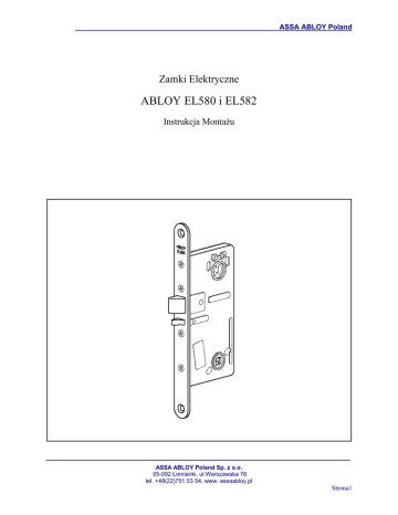 ASSA ABLOY Poland Zamki Elektryczne ABLOY EL580 i EL582 Instrukcja Montażu ASSA ABLOY Poland Sp. z o.o. 05-092 Łomianki, ul.Warszawska 76 tel. +48(22)751 53 54, www. assaabloy.pl Strona1 ASSA ABLOY Poland Wymiary EL580, EL582 ASSA ABLOY Poland Sp. z o.o. 05-092 Łomianki, ul.Warszawska 76 tel. +48(22)751 53 54, www. assaabloy.pl Strona2 ASSA ABLOY Poland Parametry Techniczne EL580, EL582 Napięcie zasilania: 12(-10%) – 24(+15%) V DC Stabilizowane Pobór prądu: 0,12 A max.0,35 A Mikroprzełącznik: max. 0,4 A 30V AC/DC, 10W Zakres temperatur otoczenia: -20oC do +60 oC Wsunięcie zatrzasku: 14mm lub 20mm Backset: 50mm lub 70mm Szerokość blachy czołowej: 22mm Monitoring: pozycja rygla, użycie klamki Funkcje przestawiane: Kierunek otwierania: lewy lub prawy Wsunięcie zatrzasku: 14mm lub 20mm Strona kontrolowana: tylko w EL580 Tryb pracy: otwarty (NO) lub zamknięty (NC) bez prądu ASSA ABLOY Poland Sp. z o.o. 05-092 Łomianki, ul.Warszawska 76 tel. +48(22)751 53 54, www. assaabloy.pl Strona3 ASSA ABLOY Poland Schemat połączeń ABLOY EL580, EL582 Zamek posiada zainstalowaną diodę zabezpieczającą Do zamka przeznaczony jest kabel połączeniowy EA210 Użycie klamki = NO brązowy = pomarańczowy C = NC szary czerwony + 12(-10%) – 24(+15%) VDC STAB = Pozycja zatrzasku C = NC = NO czarny żółty niebieski zielony Otwórz/Zamknij - Obciążalność styków mikroprzełącznika: 0,4A 30V; max 10W. ASSA ABLOY Poland Sp. z o.o. 05-092 Łomianki, ul.Warszawska 76 tel. +48(22)751 53 54, www. assaabloy.pl Strona4 ASSA ABLOY Poland Zmiana trybu NC(zamknięty bez prądu)/NO(otwarty bez prądu) ASSA ABLOY Poland Sp. z o.o. 05-092 Łomianki, ul.Warszawska 76 tel. +48(22)751 53 54, www. assaabloy.pl Strona5 ASSA ABLOY Poland Zamiana trybu NC/NO – rysunek A 1. Odkręć śrubę mocują i wyciągnij „język” ustalający – rysunek A 2. Obróć „język” o 180o –rysunek A 3. Włóż „język” do kasety zamka i dokręć wkręt mocujący – rysunek A Jeżeli strzałka na języku pokrywa się ze strzałką na kasecie zamka ustawiony jest tryb NC (zamknięty bez prądu) – rysunek B Jeżeli strzałka na nie pokrywa się ze strzałką na kasecie zamka ustawiony jest tryb NO (otwarty bez prądu) – rysunek C Zmiana kierunku otwierania (lewy/prawy) – rysunek D 1. 2. 3. 4. 5. 6. 7. Odkręć śrubę mocującą zatrzask spustowy – rysunek D Wyciągnij zatrzask spustowy i obróć o 180o –rysunek D Umieść zatrzask spustowy w kasecie zamka – rysunek D Dokręć śrubę mocującą – rysunek D Wciśnij zatrzask do środka kasety zamka – rysunek D Odkręć śrubę mocującą – rysunek D Wyciągnij i obróć zatrzask o 180o następnie włóż do kasety zamka – rysunek D. W zależności czy zatrzask ma wysuwać się z kasety na odległość 14 lub 20 mm wykonaj jedną z dwóch poniższych procedur. ASSA ABLOY Poland Sp. z o.o. 05-092 Łomianki, ul.Warszawska 76 tel. +48(22)751 53 54, www. assaabloy.pl Strona6 ASSA ABLOY Poland Ustawienie wysunięcia zatrzasku na odległość 14mm – rysunek E. UWAGA! Poniższe czynności wykonujemy po czynnościach pokazanych na rysunku D. 1. Wciśnij zatrzask do środka kasety zamka – rysunek E. 2. Dokręć śrubę mocującą – rysunek E Ustawienie wysunięcia zatrzasku na odległość20mm – rysunek F. UWAGA! Poniższe czynności wykonujemy po czynnościach pokazanych na rysunku D. 1. Wciśnij zatrzask do środka kasety zamka – rysunek F. 2. Naciśnij i przytrzymaj klamkę rysunek F 3. Dokręć śrubę mocującą trzymając klamkę naciśniętą – rysunek F. ASSA ABLOY Poland Sp. z o.o. 05-092 Łomianki, ul.Warszawska 76 tel. +48(22)751 53 54, www. assaabloy.pl Strona7 ASSA ABLOY Poland Zamiana długości wysunięcia zatrzasku – rysunki G i H Zamiana z 20mm na 14mm –rysunek G 1. Wciśnij zatrzask do kasety zamka – rysunek G 2. Poluzuj śrubę mocującą zatrzask... 3. ...do momentu usłyszenia „kliknięcia” w kasecie zamka – rysunek G 4. Dokręć śrubę mocującą – rysunek G Zamiana z 14mm na 20mm – rysunek H 1. Wciśnij zatrzask do kasety zamka – rysunek H 2. Poluzuj śrubę mocującą zatrzask – rysunek H 3. Naciśnij i przytrzymaj klamkę – rysunek H 4. Dokręć śrubę mocującą trzymając klamkę naciśniętą – rysunek H ASSA ABLOY Poland Sp. z o.o. 05-092 Łomianki, ul.Warszawska 76 tel. +48(22)751 53 54, www. assaabloy.pl Strona8 ASSA ABLOY Poland Zamiana strony klamki sterowanej elektrycznie (tylko EL580) – rysunek I,J 1. Umieść specjalną nakrętkę po stronie klamki kontrolowanej elektrycznie– rysunek I 2. Zamontuj mosiężną zaślepkę po stronie zewnętrznej – rysunek I Zainstaluj dzielony trzpień klamki tak jak na rysunku J ! Producent zaleca stosowanie klamek ze sprężyną zwrotną. ASSA ABLOY Poland Sp. z o.o. 05-092 Łomianki, ul.Warszawska 76 tel. +48(22)751 53 54, www. assaabloy.pl Strona9 ASSA ABLOY Poland Otworowanie EL580 i EL582 Miejsce na kabel Blacha 4630 Blacha 4630 ASSA ABLOY Poland Sp. z o.o. 05-092 Łomianki, ul.Warszawska 76 tel. +48(22)751 53 54, www. assaabloy.pl Strona10 ASSA ABLOY Poland Kompletacja EL580 Kompletacja EL582 ASSA ABLOY Poland Sp. z o.o. 05-092 Łomianki, ul.Warszawska 76 tel. +48(22)751 53 54, www. assaabloy.pl Strona11 ASSA ABLOY Poland Kompletacja EL580 Kompletacja EL582 ASSA ABLOY Poland Sp. z o.o. 05-092 Łomianki, ul.Warszawska 76 tel. +48(22)751 53 54, www. assaabloy.pl Strona12 ASSA ABLOY Poland Kompletacja EL580 Kompletacja EL582 ASSA ABLOY Poland Sp. z o.o. 05-092 Łomianki, ul.Warszawska 76 tel. +48(22)751 53 54, www. assaabloy.pl Strona13