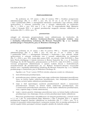 Namysłów, dnia 24 maja 2016 r. GK.6220.20.2016.AP POSTANOWIENIE Na podstawie art. 123 ustawy z dnia 14 czerwca 1960 r. Kodeksu postępowania administracyjnego (Dz. U. z 2016 r., poz. 23), art. 63 ust. 2, art. 65 ust. 3 ustawy z dnia 3 października 2008 r. o udostępnianiu informacji o środowisku i jego ochronie, udziale społeczeństwa w ochronie środowiska oraz o ocenach oddziaływania na środowisko (Dz. U. z 2016 r., poz. 353) oraz § 3 ust 1 pkt 78 rozporządzenia Rady Ministrów z dnia 9 listopada 2010 r. w sprawie przedsięwzięć mogących znacząco oddziaływać na środowisko (Dz. U. z 2016 r. poz. 71) postanawiam odstąpić od obowiązku przeprowadzenia oceny oddziaływania na środowisko dla przedsięwzięcia pn. cyt. Budowa beztlenowo-tlenowej oczyszczalni ścieków wraz z niezbędną infrastrukturą techniczną dla Browaru Namysłów Sp. z o.o. Zakładu produkcyjnego w Namysłowie, przy ul. Bolesława Chrobrego 26. UZASADNIENIE Na podstawie art. 61 ustawy z dnia 14 czerwca 1960 r. – Kodeks postępowania administracyjnego (Dz. U. z 2016 r. poz. 23) oraz art. 73 ust. 1 ustawy z dnia 3 października 2008 r. o udostępnianiu informacji o środowisku i jego ochronie, udziale społeczeństwa w ochronie środowiska oraz o ocenach oddziaływania na środowisko (Dz. U. z 2016 r., poz. 353), zwaną dalej ustawą OOŚ, na wniosek z dnia 24.03.2016 r., Pana Jacka Piecha działającego w imieniu inwestora tj. Browar Namysłów Sp. z o.o. ul. Bolesława Chrobrego 26, 46-100 Namysłów, pełnomocnictwo nr P/33/15 z dnia 23.11.2015 r., zostało wszczęte postępowanie administracyjne w sprawie wydania decyzji o środowiskowych uwarunkowaniach dla przedsięwzięcia pn. cyt. Budowa beztlenowo-tlenowej oczyszczalni ścieków wraz z niezbędną infrastrukturą techniczną dla Browaru Namysłów Sp. z o.o. Zakładu produkcyjnego w Namysłowie, przy ul. Bolesława Chrobrego 26. Zgodnie z art. 74 ust 1 ustawy OOŚ do wniosku załączone zostały nw. dokumenty: 1) karta informacyjna przedsięwzięcia, 2) poświadczona przez właściwy organ kopia mapy ewidencyjnej obejmującej przewidywany teren, na którym będzie realizowane przedsięwzięcie, oraz obejmująca przewidywany obszar, na który będzie oddziaływać przedsięwzięcie, 3) mapa w skali zapewniającej czytelność przedstawionych danych z zaznaczonym przewidywanym terenem, na którym będzie realizowane przedsięwzięcie, oraz z zaznaczonym przewidywanym obszarem, na który będzie oddziaływać przedsięwzięcie, wraz z zapisem mapy w formie elektronicznej, 4) wypis z rejestru gruntów obejmujący przewidywany teren, na którym będzie realizowane przedsięwzięcie oraz obejmujący obszar, na który przedsięwzięcie będzie oddziaływać. Planowane przedsięwzięcie zakwalifikowano do kategorii przedsięwzięć, o których mowa w § 3 ust 1 pkt 78, rozporządzenia Rady Ministrów z dnia 9 listopada 2010 r. w sprawie przedsięwzięć mogących znacząco oddziaływać na środowisko (Dz. U. z 2016 r. poz. 71) tj. instalacje do oczyszczania ścieków przemysłowych z wyłączeniem instalacji, które nie powodują wprowadzania do wód lub urządzeń ścieków zawierających substancje szczególnie szkodliwe dla środowiska wodnego. 1 Zawiadomienie – obwieszczenie o wszczęciu postępowania zostało opublikowane w Biuletynie Informacji Publicznej Urzędu Miejskiego w Namysłowie, tablicy ogłoszeń tut. Urzędu oraz w miejscu prowadzenia inwestycji. Poinformowano również strony o możliwości i miejscu składania uwag i wniosków dotyczących przedmiotowego postępowania, w terminie 21 dni od dnia ogłoszenia ww. zawiadomienia. Zgodnie z art. 64 ustawy OOŚ tut. Organ wystąpił do Państwowego Powiatowego Inspektora Sanitarnego w Namysłowie oraz Regionalnego Dyrektora Ochrony Środowiska w Opolu o opinię w sprawie konieczności przeprowadzenia oceny oddziaływania na środowisko. Państwowy Powiatowy Inspektor Sanitarny w Namysłowie opinią sanitarną nr NZ.4315.9.2016.AN z dnia 25 kwietnia 2016 r. zaproponował nie nakładać na inwestora obowiązku przeprowadzenia oceny oddziaływania na środowisko dla przedmiotowego przedsięwzięcia. Organ opiniujący po zapoznaniu się z przedłożoną dokumentacją sprawy oraz biorąc pod uwagę w swojej ocenie szczegółowe uwarunkowania związane z kwalifikowaniem przedsięwzięcia do sporządzenia raportu o oddziaływaniu na środowisko stwierdził, iż planowane przedsięwzięcie będzie źródłem emisji oczyszczonych ścieków przemysłowych i wód opadowych i roztopowych, odpadów, gazów i pyłów oraz hałasu. Po analizie danych zawartych w karcie informacyjnej przedsięwzięcia, Organ stwierdził, że przy zastosowaniu rozwiązań technicznych, technologicznych i lokalizacyjnych ww. uciążliwości nie będą powodowały przekroczenia ustalonych standardów środowiska. Regionalny Dyrektor Ochrony Środowiska, pismem nr WOOŚ.4241.92.2016.MD z dnia 28 kwietnia 2016 r., wyraził opinię, iż dla przedmiotowego przedsięwzięcia nie istnieje potrzeba przeprowadzania oceny oddziaływania na środowisko. W trakcie prowadzonego postępowania wpłynęła jedna uwaga dotyczące podanych do publicznej wiadomości informacji w sprawie przedmiotowej inwestycji. Wojewódzki Zarząd Melioracji i Urządzeń Wodnych w Opolu Oddział w Kluczborku, pismem nr KKL-4100/117/16 z dnia 4 maja 2016 r., wyraził opinię cyt. (…) że lokalizacja obiektu w bliskim sąsiedztwie rzek: Widawy i Młynówki Namysłowskiej jest obciążona wysokim ryzykiem zalania podczas gwałtownych wezbrań. W związku z powyższym, tut. Organ, na podstawie art. 7 oraz art. 77 § 1 ustawy z dnia 14 czerwca 1960 r. Kodeks postępowania administracyjnego, wezwał inwestora do złożenia wyjaśnień w kwestiach dotyczących przeprowadzenia analiz dot. możliwego zagrożenia powodziowego oraz zalania terenu planowanej inwestycji w wyniku gwałtownego wezbrania rzeki Widawy i Młynówki oraz przedstawienia wyników tych a