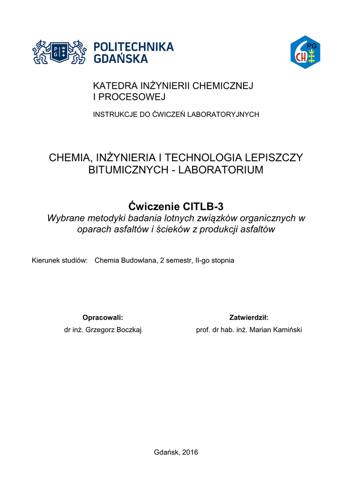 KATEDRA INŻYNIERII CHEMICZNEJ I PROCESOWEJ INSTRUKCJE DO ĆWICZEŃ LABORATORYJNYCH CHEMIA, INŻYNIERIA I TECHNOLOGIA LEPISZCZY BITUMICZNYCH - LABORATORIUM Ćwiczenie CITLB-3 Wybrane metodyki badania lotnych związków organicznych w oparach asfaltów i ścieków z produkcji asfaltów Kierunek studiów: Chemia Budowlana, 2 semestr, II-go stopnia Opracowali: Zatwierdził: dr inż. Grzegorz Boczkaj prof. dr hab. inż. Marian Kamiński Gdańsk, 2016 Spis treści 1. Wprowadzenie..................................................................................................................................................3 2. Problem powstawania LZO podczas destylacji próżniowej ropy naftowej i utleniania asfaltów .....................3 3. Wybrane metodyki badania LZO w próbkach asfaltów i ścieków z produkcji asfaltów oraz w ich oparach....5 3.1 Oznaczanie sumarycznej zawartości LZO w oparach asfaltów ...................................................................5 3.2 Identyfikacja i oznaczanie lotnych związków siarki w oparach asfaltów ...................................................8 3.3 Identyfikacja i oznaczanie lotnych związków organicznych w ściekach z produkcji asfaltów ................. 10 3. Sprawozdanie ................................................................................................................................................ 13 4. Literatura ....................................................................................................................................................... 13 5. Literatura uzupełniająca ................................................................................................................................ 15 2 1. Wprowadzenie Laboratorium z przedmiotu Chemia Inżynieria i Technologia lepiszczy bitumicznych (CITLB) zawiera 12 modułów pogrupowanych w cztery bloki tematyczne stanowiące odrębne ćwiczenia. Trzy pierwsze bloki stanowią trzy stacjonarne ćwiczenia laboratoryjne, natomiast blok czwarty stanowi laboratorium wyjazdowe do nowoczesnej wytwórni lepiszczy bitumicznych oraz laboratorium kontroli jakości. Celem CITLB-3 jest zapoznanie studentów z zaawansowanymi technikami instrumentalnymi i metodykami badawczymi stosowanymi do identyfikacji i oznaczania lotnych związków organicznych obecnych w asfaltach [1] oraz ściekach z produkcji asfaltów [2-5]. Informacje przedstawione w niniejszej instrukcji są skoncentrowaną próbką informacji zawartych w rozprawie doktorskiej autora niniejszej instrukcji [6]. 2. Problem powstawania LZO podczas destylacji próżniowej ropy naftowej i utleniania asfaltów Najpowszechniej stosowanymi asfaltami są, jednak, asfalty "pochodzenia naftowego". Ze względu na niezadowalające parametry użytkowe pozostałości z destylacji próżniowej, otrzymywanej z większości rodzajów ropy naftowej, konieczne jest utlenianie pozostałości próżniowej, często z dodatkowymi produktami. Istnieje również, kilka rodzajów ropy naftowej, nieprzydatnych do wytwarzania asfaltów z pozostałości próżniowej. Do reaktorów wprowadza się gorącą masę bitumiczną oraz wdmuchuje się gorące powietrze. Temperatura w reaktorach jest utrzymywana w zakresie 200-260°C. Produkt uzyskiwany w tym procesie, niekiedy określa się nazwą asfalty dmuchane (air-blown/air-refined bitumen/asphalt) (CAS no. 64742-93-4) [1]. W starszych rozwiązaniach, konstrukcja reaktorów nie była skomplikowana – był to zbiornik z przestrzenią reakcyjną typu cylindrycznego lub tubularnego, do którego wprowadzano podgrzany i często wstępnie wymieszany z powietrzem surowiec (pozostałość próżniową), który kontaktowano w przeciwprądzie z nadmiarem powietrza. Wsad podaje się w górnej części reaktora na wysokości "lustra" utlenianego asfaltu, a od dołu wdmuchuje powietrze, które jest czynnikiem reakcyjnym, ale także odpowiada za intensyfikację wymiany masy poprzez mieszanie wsadu. Nowoczesne rozwiązania wykorzystują reaktory zaopatrzone w wysokosprawne turbiny (np. reaktory BITUROX®) mające na celu efektywne zdyspergowanie powietrza w utlenianej masie bitumicznej. Oksydacja asfaltów jest procesem silnie egzotermicznym, stąd istnieje konieczność kontroli temperatury procesu – odbiór ciepła z przestrzeni reakcyjnej odbywa się poprzez płaszcz chłodzony powietrzem lub/i poprzez „dostrzyk” wody, która odbiera ciepło bezpośrednio z asfaltu. Na chemizm procesu oksydacji asfaltów składają się głównie reakcje utleniania, odwodornienia, kondensacji oraz polimeryzacji. Wprowadzany tlen łączy się z atomami wodoru tworząc parę wodną, zmniejszając jednocześnie tzw. stopień nienasycenia związków obecnych we wsadzie. Powoduje to wewnętrzne i międzycząsteczkowe „usieciowanie” składników asfaltu. Sumarycznie, efekt procesu 3 sprowadza się do podwyższenia średniej masy cząsteczkowej asfaltenów już obecnych w asfalcie, a także konwersji składników polarnych – głównie żywic, ale także związków aromatycznych do asfaltenów. Zawartość związków nasyconych w utlenionym asfalcie jest porównywalna z wyjściową we wsadzie do oksydacji. Zwiększa się natomiast zawartość tlenu (w postaci związanej). Ubocznym (niepożądanym) efektem jest częściowy kraking termiczny na elementach grzejnych. W wyniku krakingu termicznego powstają lotne i nielotne związki chemiczne o charakterze nienasyconym - głównie alkeny (olefiny) i związki aromatyczne, w tym benzen, a także policykliczne związki aromatyczne (PCA; ang. polycyclic aromatic compounds, PAC), podstawione alkilowo lub naftylowo związki z grupy wielopierścieniowych węglowodorów aromatycznych (WWA; ang. Polycyclic Aromatic Hydrocarbons, PAHs), a także - uznawane za kancerogenne – niepodstawione WWA [7-12]. Związki chemiczne o charakterze nienasyconym, powstałe podczas utleniania ulegają dalszym przemianom, w tym głównie utlenianiu, a także reakcjom kondens