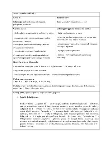 Autor: Anna Dziadkiewicz Klasa II Temat lekcji: Edukacja: polonistyczna, artystyczna, plastyczna, społeczna Teatr „Malutki” przedstawia … cz. I Cel/cele zajęć: Cele zajęć w języku ucznia/ dla ucznia: - doskonalenie umiejętności współpracy w parze - będę współpracować w parze - przypomnienie i rozszerzenie nazewnictwa - poszerzę swoją wiedzę o teatrze o nazwy jego pracowników oraz miejsc w teatrze związanego z teatrem - rozwijanie zasobu słownikowego poprzez ćwiczenia słowotwórcze - utworzę nazwy zawodów związanych z teatrem od innych wyrazów - rozwijanie wyobraźni i kreatywności - wymyślę ciekawą historię - kształtowanie umiejętności opowiadania i opisywania przygód wymyślonego bohatera - napiszę i narysuję fragment scenariusza teatralnego Kryteria sukcesu dla ucznia: - wymieniam osoby pracujące w teatrze oraz wyjaśniam na czym polega ich praca - wyjaśniam pojęcia związane z teatrem - wraz z innymi dziećmi opowiadam historię i tworzę scenariusz przedstawienia Podstawa programowa: 1.1)a, b, c, 1.3)a, c, d, 1.4)a, 4.2)a, b, 5.4), Metody pracy: metoda aktywizująca, metoda ćwiczeń i praktycznego działania, gra dydaktyczna, drama, pokaz filmu, zabawa ruchowa, Formy pracy: praca w parach, indywidualna i grupowa 1. Środki dydaktyczne: bilety do teatru – Załącznik nr 1 – Bilet wstępu, karteczki z cyframi rzymskimi i arabskimi, zakryte materiałem sztalugi i inne elementy tworzące scenę teatralną, nagranie audio – Załącznik nr 2 – Witamy w teatrze, brystol do tworzenia plakatu obrazującego realizację celów lekcji, kapelusz, Załącznik nr 3 – teatralne hasła, małe karteczki, Załącznik nr 4 – definicje, Załącznik nr 5 – sylaby i piktogramy, mała piłeczka (piankowa lub tenisowa), Załącznik nr 6 - opis gry Ortograficzny łamaniec językowy oraz Załącznik nr 7 Ortograficzny łamaniec językowy – plansza, pisaki do białych tablic, niezwykły afisz teatralny z pytaniami pomocniczymi do tworzenia scenariusza przedstawienia, duże arkusze papieru formatu - minimum A3, kredki, flamastry, sznurek, klamerki, film Załącznik nr 9 Lalka z koperty, Przebieg zajęć „Drogowskazy” -wskazówki Centra Aktywnej Edukacji i uwagi o realizacji 2. Dzień wcześniej nauczyciel rozdaje uczniom bilety do teatru – Załącznik nr 1 – Bilet wstępu. Na biletach poza standardowymi informacjami znajdują się również pytania, na które uczniowie mają odpowiedzieć w domu. Odpowiedź na wszystkie pytania jest równoznaczna z możliwością wejścia na widownię. polonistycznokomunikacyjne 3. W klasie nauczyciel aranżuje przestrzeń tak by przypominała teatr, a więc krzesła ustawia w rzędy (przy każdym z nich umieszcza karteczkę z cyfrą rzymską) i numeruje miejsca (cyfry arabskie). W miarę możliwości tworzy kulisy (mogą to być zakryte materiałem sztalugi) oraz oznacza miejsce, które będzie sceną (nakleja papierową taśmę na podłogę, by oddzielić widownię od sceny). 4. Uczniowie wchodząc do klasy okazują bilety odszukują swoje miejsca na widowni. Gdy już wszyscy siedzą nauczyciel odtwarza nagranie audio – Załącznik nr 2 – Witamy w teatrze. Nagranie zawiera powitanie, wiersz oraz krótkie wskazówki związane z tym jak należy zachować się w teatrze. polonistycznokomunikacyjne i artystyczno ruchowe 5. Nauczyciel jako bileter prosi o przygotowanie biletów, a właściwie odcinków dla biletera – odrobionego zadania domowego. Chętni uczniowie odczytują swoje odpowiedzi, pozostałe odczytuje nauczyciel. W ten sposób poznaje jaką dotychczasową wiedzę na temat teatru posiadają uczniowie oraz ich oczekiwania i potrzeby. Jest to również okazja do utrwalenia słownictwa i pojęć związanych z teatrem. polonistycznokomunikacyjne 6. W nawiązaniu do poprzedniej lekcji oraz odpowiedzi zapisanych na biletach nauczyciel formułuje cele lekcji i zapoznaje z nimi uczniów. Informuje ich również, że zrealizowanie kolejnych celów będą przedstawiać w formie uzupełnianego na bieżąco plakatu. polonistycznokomunikacyjne 7. Hasła z kapelusza. Nauczyciel prosi uczniów, by dobrali się w pary, następnie uczniowie losują z kapelusza hasła związane z teatrem – Załącznik nr 3 – teatralne hasła. Uczniowie mają w parach wyjaśnić ich znaczenie. Są to pojęcia, które mogą być uczniom znane lub też słyszane przez nich po raz pierwszy. Jeżeli uczniowie nie są pewni swoich odpowiedzi piszą to, co podpowiada im wyobraźnia. polonistycznokomunikacyjne 8. Po wykonaniu zadań dla par dzieci zamieniają się swoimi hasłami i sprawdzają poprawność wyjaśnień porównując je z zapisanymi na kartkach definicjami – Załącznik nr 4 - definicje. Dopasowują definicje do haseł i porównują z pomysłami kolegów/koleżanek. Na zakończenie tej części uczniowie przyklejają na plakacie hasła obok ich definicji. polonistycznokomunikacyjne 9. Kolejnym zadaniem dla wszystkich uczniów jest ułożenie i wklejenie wyrazów do zeszytu w kolejności alfabetycznej. W tym celu nauczyciel przygotowuje wyrazy, które były wcześniej w kapeluszu w mniejszej wersji – tak, by dzieci mogły je przykleić jeden pod drugim w zeszycie. Załącznik nr 3 – teatralne hasła. polonistycznokomunikacyjne 10. Nauczyciel zwraca uwagę uczniom, że niektóre z haseł dotyczyły zawodów lub funkcji osób pracujących w teatrze. Prosi uczniów o odszukanie ich nazw (inspicjent, dubler, reżyser, sufler, statysta). Następnie prosi uczniów, by zerknęli do zeszytów i zastanowili się nad tym, czy można wyróżnić jeszcze inne osoby pracujące w teatrze na podstawie haseł wklejonych do zeszytu (garderobiana, rekwizytor, charakteryzatorka, kostiumograf, scenograf). Nauczyciel zapisuje na plakacie pytanie: „Kto pracuje w teatrze?” uczniowie zapisują na karteczkach poznane dotychczas wyrazy oraz zastanawiają się nad kolejnymi i dopisują je do listy. polonistycznokomunikacyjne 11. W celu 