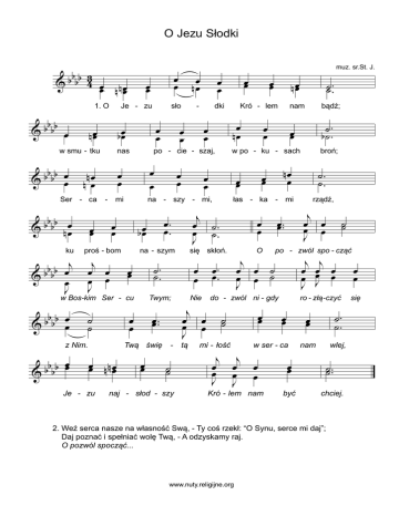 O Jezu Słodki bb 3 & b b 4 œœ n œ nœ 1. O bb &bb œ Je - zu n œœ w smu - tku bbb œ b & œ bb & b b n œœ ku bb b œj & b œ J - dki œ œ œ œ œ œ œ œ po - cie - szaj, mi na - szy - mi, na - szym j œ œ œ œ J œœ ˙ ˙ œ œ Twym; œœ .. Twą świę œœ n n œœ œœ - ˙˙ naj - słod - szy Nie j œ œ œ œ J tą ˙˙ .. nam bądź; œœ ˙. b˙. broń; nœ œ œœ œœ ˙. ˙. łas - ka - mi œ. œ. œ œ œ œ n œœ w po - ku - sach się skłoń. ˙. ˙. œœ Kró - lem j œ ˙. œ ˙. J œ. œ. b œœ œœ œ nœ nas proś - bom Je - zu - œ œ z Nim. b b œœ &bb sło œ œ w Bos-kim Ser - cu bb œ b & b œ œ œ b œœ œœ œœ œ nœ œ œ nœ nœ Ser - ca œ œ œœ muz. sr.St. J. j œ œ œ œ J œ œ œœ .. O po - zwól spo - cząć j œ œ ˙ œ œ ˙ J j œ œ J do - zwól ni - gdy œœ ˙˙ mi - łość rządź, Kró - lem nam j œœ œ J œ ro - złą -czyć œœ w ser - ca j j œ œ œ œ œ œ J J ˙˙ œœ być œœ ˙. ˙. nam wlej, ˙˙ .. chciej. 2. Weź serca nasze na własność Swą, - Ty coś rzekł: “O Synu, serce mi daj”; Daj poznać i spełniać wolę Twą, - A odzyskamy raj. O pozwól spocząć... www.nuty.religijne.org œ œ się