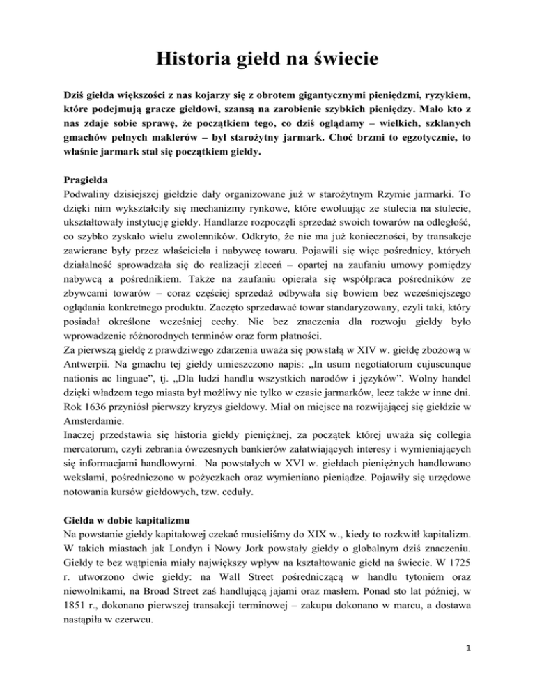 Historia giełd na świecie Dziś giełda większości z nas kojarzy się z obrotem gigantycznymi pieniędzmi, ryzykiem, które podejmują gracze giełdowi, szansą na zarobienie szybkich pieniędzy. Mało kto z nas zdaje sobie sprawę, że początkiem tego, co dziś oglądamy – wielkich, szklanych gmachów pełnych maklerów – był starożytny jarmark. Choć brzmi to egzotycznie, to właśnie jarmark stał się początkiem giełdy. Pragiełda Podwaliny dzisiejszej giełdzie dały organizowane już w starożytnym Rzymie jarmarki. To dzięki nim wykształciły się mechanizmy rynkowe, które ewoluując ze stulecia na stulecie, ukształtowały instytucję giełdy. Handlarze rozpoczęli sprzedaż swoich towarów na odległość, co szybko zyskało wielu zwolenników. Odkryto, że nie ma już konieczności, by transakcje zawierane były przez właściciela i nabywcę towaru. Pojawili się więc pośrednicy, których działalność sprowadzała się do realizacji zleceń – opartej na zaufaniu umowy pomiędzy nabywcą a pośrednikiem. Także na zaufaniu opierała się współpraca pośredników ze zbywcami towarów – coraz częściej sprzedaż odbywała się bowiem bez wcześniejszego oglądania konkretnego produktu. Zaczęto sprzedawać towar standaryzowany, czyli taki, który posiadał określone wcześniej cechy. Nie bez znaczenia dla rozwoju giełdy było wprowadzenie różnorodnych terminów oraz form płatności. Za pierwszą giełdę z prawdziwego zdarzenia uważa się powstałą w XIV w. giełdę zbożową w Antwerpii. Na gmachu tej giełdy umieszczono napis: „In usum negotiatorum cujuscunque nationis ac linguae”, tj. „Dla ludzi handlu wszystkich narodów i języków”. Wolny handel dzięki władzom tego miasta był możliwy nie tylko w czasie jarmarków, lecz także w inne dni. Rok 1636 przyniósł pierwszy kryzys giełdowy. Miał on miejsce na rozwijającej się giełdzie w Amsterdamie. Inaczej przedstawia się historia giełdy pieniężnej, za początek której uważa się collegia mercatorum, czyli zebrania ówczesnych bankierów załatwiających interesy i wymieniających się informacjami handlowymi. Na powstałych w XVI w. giełdach pieniężnych handlowano wekslami, pośredniczono w pożyczkach oraz wymieniano pieniądze. Pojawiły się urzędowe notowania kursów giełdowych, tzw. ceduły. Giełda w dobie kapitalizmu Na powstanie giełdy kapitałowej czekać musieliśmy do XIX w., kiedy to rozkwitł kapitalizm. W takich miastach jak Londyn i Nowy Jork powstały giełdy o globalnym dziś znaczeniu. Giełdy te bez wątpienia miały największy wpływ na kształtowanie giełd na świecie. W 1725 r. utworzono dwie giełdy: na Wall Street pośredniczącą w handlu tytoniem oraz niewolnikami, na Broad Street zaś handlującą jajami oraz masłem. Ponad sto lat później, w 1851 r., dokonano pierwszej transakcji terminowej – zakupu dokonano w marcu, a dostawa nastąpiła w czerwcu. 1 Szybko zorientowano się, że istnieje duże ryzyko gwałtownych zmian cen towarów. Wtedy do akcji wkroczyli spekulanci. Byli oni zainteresowani przejmowaniem wspomnianego ryzyka, by finalnie osiągnąć większy zysk. Wobec braku państwowych regulacji samorządy gospodarcze dążyły do uporządkowania zasad, którymi rządziły się transakcje giełdowe. W tym celu tworzono izby handlowe – jedna z pierwszych powstała w Chicago. Utworzono system, który gwarantował pewność obrotu. Bezpieczeństwo uczestnikom tego obrotu zapewniały izby rozliczeniowe. Obok ogromnej nowojorskiej giełdy istnieje do dziś mniejsza – American Stock Exchange, która swoją działalność rozpoczynała na ulicy. Maklerzy sygnalizowali urzędnikom, którzy wychylali się z okien, zawarte transakcje, by ci mogli je odnotować. Rozkwit giełd na świecie Lata 20. to wielki boom na rynku akcji. Ludzie bez opamiętania kupowali i sprzedawali papiery wartościowe. Większość kupowana była na kredyt zabezpieczony akcjami. Chodziło o to, by nabyć akcję o wartości 1000 dolarów za 250 dolarów. Pozostałą kwotę pożyczano pod zastaw nabytych akcji. Kupowano więcej i więcej, kursy wzrastały, mimo że dywidendy oraz zyski wypłacane przez spółki nie rosły. Spekulacyjna machina rozpędzona do granic możliwości zatrzymała się nagle w „czarnym październiku” 1929 r. Nawet kursy akcji uważanych za bezpieczne (blue chip) spadały dramatycznie. Światowy rynek giełdowy podniósł się wyraźnie po drugiej wojnie światowej, by w 1965 r. osiągnąć szczyt. Giełda w Polsce Historia giełdy w Polsce sięga XVIII w., kiedy organizowano zgromadzenia kupców zwane gildiami. To słowo właśnie dało początek polskiej nazwie „giełda”. Pod rosyjskim panowaniem, na mocy postanowienia księcia namiestnika królewskiego generała Zajączka, utworzono pierwszą w Polsce giełdę towarową. W warszawskim Pałacu Saskim 12 maja 1817 r. nastąpiło jej uroczyste otwarcie. Działająca bez osobowości prawnej giełda utrzymywana była z miejskiej kasy i podlegała nadzorowi najpierw prezydenta miasta, a później prezesa Banku Polskiego. Działalność ta, niemająca większego znaczenia finansowego i gospodarczego, przerwana została przez powstanie listopadowe. Inne polskie giełdy to krakowska z 1819 r., lwowska z 1866 r. oraz wrocławska z 1822 r. Mimo burzliwego okresu wojennego i międzywojennego w historii światowej giełda w Polsce przetrwała. Zmiany ustrojowe z 1989 r., które przeszła Polska, pozwoliły na utworzenie Warszawskiej Giełdy Papierów Wartościowych. Wszystko to dzięki nowym możliwościom, jakie niósł za sobą wolny rynek. Cztery dni po podpisaniu przez ministra przekształceń własnościowych oraz ministra finansów aktu założycielskiego – 16 kwietnia 1991 r. – odbyła się pierwsza sesja giełdowa, w której udział wzięło siedem domów maklerskich i notowano akcje pięciu spółek. W grudniu tego samego roku Giełdę Papierów Wartościowych przyjęto w poc