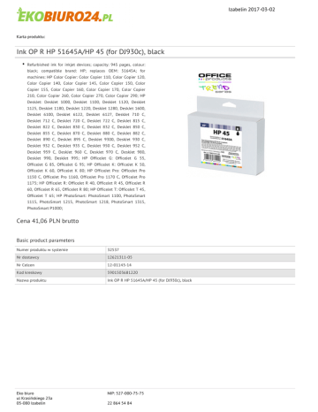 Izabelin 2017-03-02 Karta produktu: Ink OP R HP 51645A/HP 45 (for DJ930c), black Refurbished ink for inkjet devices; capacity: 945 pages, colour: black; compatible brand: HP; replaces OEM: 51645A; for machines: HP Color Copier: Color Copier 110, Color Copier 120, Color Copier 140, Color Copier 145, Color Copier 150, Color Copier 155, Color Copier 160, Color Copier 170, Color Copier 210, Color Copier 260, Color Copier 270, Color Copier 290; HP DeskJet: DeskJet 1000, DeskJet 1100, DeskJet 1120, DeskJet 1125, DeskJet 1180, DeskJet 1220, DeskJet 1280, DeskJet 1600, DeskJet 6100, DeskJet 6122, DeskJet 6127, DeskJet 710 C, DeskJet 712 C, DeskJet 720 C, DeskJet 722 C, DeskJet 815 C, DeskJet 822 C, DeskJet 830 C, DeskJet 832 C, DeskJet 850 C, DeskJet 855 C, DeskJet 870 C, DeskJet 880 C, DeskJet 882 C, DeskJet 890 C, DeskJet 895 C, DeskJet 9300, DeskJet 930 C, DeskJet 932 C, DeskJet 935 C, DeskJet 950 C, DeskJet 952 C, DeskJet 959 C, DeskJet 960 C, DeskJet 970 C, DeskJet 980, DeskJet 990, DeskJet 995; HP OfficeJet G: OfficeJet G 55, OfficeJet G 85, OfficeJet G 95; HP OfficeJet K: OfficeJet K 50, OfficeJet K 60, OfficeJet K 80; HP OfficeJet Pro: OfficeJet Pro 1150 C, OfficeJet Pro 1160, OfficeJet Pro 1170 C, OfficeJet Pro 1175; HP OfficeJet R: OfficeJet R 40, OfficeJet R 45, OfficeJet R 60, OfficeJet R 65, OfficeJet R 80; HP OfficeJet T: OfficeJet T 45, OfficeJet T 65; HP PhotoSmart: PhotoSmart 1100, PhotoSmart 1115, PhotoSmart 1215, PhotoSmart 1218, PhotoSmart 1315, PhotoSmart P1000; Cena 41,06 PLN brutto Basic product parameters Numer produktu w systemie 32537 Nr dostawcy 12621311-05 Nr Celcen 12-01143-14 Kod kreskowy 5901503681220 Nazwa produktu Ink OP R HP 51645A/HP 45 (for DJ930c), black Eko biuro ul Krasińskiego 23a 05-080 Izabelin NIP: 527-000-75-75 22 864 54 84 Izabelin 2017-03-02 Karta katalogowa produktu cd. Ink OP R HP 51645A/HP 45 (for DJ930c), black Opis Refurbished ink for inkjet devices; capacity: 945 pages, colour: black; compatible brand: HP; replaces OEM: 51645A; for machines: HP Color Copier: Color Copier 110, Color Copier 120, Color Copier 140, Color Copier 145, Color Copier 150, Color Copier 155, Color Copier 160, Color Copier 170, Color Copier 210, Color Copier 260, Color Copier 270, Color Copier 290; HP DeskJet: DeskJet 1000, DeskJet 1100, DeskJet 1120, DeskJet 1125, DeskJet 1180, DeskJet 1220, DeskJet 1280, DeskJet 1600, DeskJet 6100, DeskJet 6122, DeskJet 6127, DeskJet 710 C, DeskJet 712 C, DeskJet 720 C, DeskJet 722 C, DeskJet 815 C, DeskJet 822 C, DeskJet 830 C, DeskJet 832 C, DeskJet 850 C, DeskJet 855 C, DeskJet 870 C, DeskJet 880 C, DeskJet 882 C, DeskJet 890 C, DeskJet 895 C, DeskJet 9300, DeskJet 930 C, DeskJet 932 C, DeskJet 935 C, DeskJet 950 C, DeskJet 952 C, DeskJet 959 C, DeskJet 960 C, DeskJet 970 C, DeskJet 980, DeskJet 990, DeskJet 995; HP OfficeJet G: OfficeJet G 55, OfficeJet G 85, OfficeJet G 95; HP OfficeJet K: OfficeJet K 50, OfficeJet K 60, OfficeJet K 80; HP OfficeJet Pro: OfficeJet Pro 1150 C, OfficeJet Pro 1160, OfficeJet Pro 1170 C, OfficeJet Pro 1175; HP OfficeJet R: OfficeJet R 40, OfficeJet R 45, OfficeJet R 60, OfficeJet R 65, OfficeJet R 80; HP OfficeJet T: OfficeJet T 45, OfficeJet T 65; HP PhotoSmart: PhotoSmart 1100, PhotoSmart 1115, PhotoSmart 1215, PhotoSmart 1218, PhotoSmart 1315, PhotoSmart P1000; Kategoria Inks Brand Feature Offer from Product HP Type Refurbished Procurement vocabulary CPV 30192113-6 Wkłady drukujące Colour Colour Black Certifications New product Standard Hit Standard Application Use For inkjet devices Serdecznie zapraszamy do współpracy Eko biuro ul Krasińskiego 23a 05-080 Izabelin NIP: 527-000-75-75 22 864 54 84 Izabelin 2017-03-02 Eko biuro zespół. Eko biuro ul Krasińskiego 23a 05-080 Izabelin NIP: 527-000-75-75 22 864 54 84