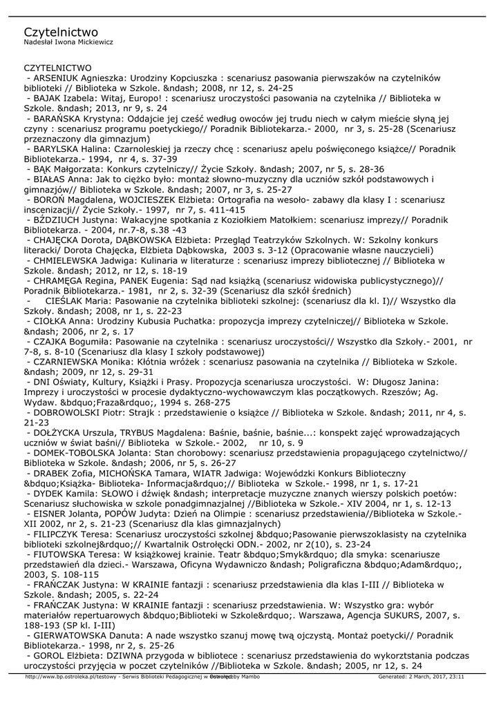 Czytelnictwo Nadesłał Iwona Mickiewicz CZYTELNICTWO - ARSENIUK Agnieszka: Urodziny Kopciuszka : scenariusz pasowania pierwszaków na czytelników biblioteki // Biblioteka w Szkole. – 2008, nr 12, s. 24-25 - BAJAK Izabela: Witaj, Europo! : scenariusz uroczystości pasowania na czytelnika // Biblioteka w Szkole. – 2013, nr 9, s. 24 - BARAŃSKA Krystyna: Oddajcie jej cześć według owoców jej trudu niech w całym mieście słyną jej czyny : scenariusz programu poetyckiego// Poradnik Bibliotekarza.- 2000, nr 3, s. 25-28 (Scenariusz przeznaczony dla gimnazjum) - BARYLSKA Halina: Czarnoleskiej ja rzeczy chcę : scenariusz apelu poświęconego książce// Poradnik Bibliotekarza.- 1994, nr 4, s. 37-39 - BĄK Małgorzata: Konkurs czytelniczy// Życie Szkoły. – 2007, nr 5, s. 28-36 - BIAŁAS Anna: Jak to ciężko było: montaż słowno-muzyczny dla uczniów szkół podstawowych i gimnazjów// Biblioteka w Szkole. – 2007, nr 3, s. 25-27 - BOROŃ Magdalena, WOJCIESZEK Elżbieta: Ortografia na wesoło- zabawy dla klasy I : scenariusz inscenizacji// Życie Szkoły.- 1997, nr 7, s. 411-415 - BŹDZIUCH Justyna: Wakacyjne spotkania z Koziołkiem Matołkiem: scenariusz imprezy// Poradnik Bibliotekarza. - 2004, nr.7-8, s.38 -43 - CHAJĘCKA Dorota, DĄBKOWSKA Elżbieta: Przegląd Teatrzyków Szkolnych. W: Szkolny konkurs literacki/ Dorota Chajęcka, Elżbieta Dąbkowska, 2003 s. 3-12 (Opracowanie własne nauczycieli) - CHMIELEWSKA Jadwiga: Kulinaria w literaturze : scenariusz imprezy bibliotecznej // Biblioteka w Szkole. – 2012, nr 12, s. 18-19 - CHRAMĘGA Regina, PANEK Eugenia: Sąd nad książką (scenariusz widowiska publicystycznego)// Poradnik Bibliotekarza.- 1981, nr 2, s. 32-39 (Scenariusz dla szkół średnich) CIEŚLAK Maria: Pasowanie na czytelnika biblioteki szkolnej: (scenariusz dla kl. I)// Wszystko dla Szkoły. – 2008, nr 1, s. 22-23 - CIOŁKA Anna: Urodziny Kubusia Puchatka: propozycja imprezy czytelniczej// Biblioteka w Szkole. – 2006, nr 2, s. 17 - CZAJKA Bogumiła: Pasowanie na czytelnika : scenariusz uroczystości// Wszystko dla Szkoły.- 2001, nr 7-8, s. 8-10 (Scenariusz dla klasy I szkoły podstawowej) - CZARNIEWSKA Monika: Kłótnia wróżek : scenariusz pasowania na czytelnika // Biblioteka w Szkole. – 2009, nr 12, s. 29-31 - DNI Oświaty, Kultury, Książki i Prasy. Propozycja scenariusza uroczystości. W: Długosz Janina: Imprezy i uroczystości w procesie dydaktyczno-wychowawczym klas początkowych. Rzeszów; Ag. Wydaw. „Fraza”, 1994 s. 268-275 - DOBROWOLSKI Piotr: Strajk : przedstawienie o książce // Biblioteka w Szkole. – 2011, nr 4, s. 21-23 - DOŁŻYCKA Urszula, TRYBUS Magdalena: Baśnie, baśnie, baśnie...: konspekt zajęć wprowadzających uczniów w świat baśni// Biblioteka w Szkole.- 2002, nr 10, s. 9 - DOMEK-TOBOLSKA Jolanta: Stan chorobowy: scenariusz przedstawienia propagującego czytelnictwo// Biblioteka w Szkole. – 2006, nr 5, s. 26-27 - DRABEK Zofia, MICHOŃSKA Tamara, WIATR Jadwiga: Wojewódzki Konkurs Biblioteczny „Książka- Biblioteka- Informacja”// Biblioteka w Szkole.- 1998, nr 1, s. 17-21 - DYDEK Kamila: SŁOWO i dźwięk – interpretacje muzyczne znanych wierszy polskich poetów: Scenariusz słuchowiska w szkole ponadgimnazjalnej //Biblioteka w Szkole.- XIV 2004, nr 1, s. 12-13 - EISNER Jolanta, POPÓW Judyta: Dzień na Olimpie : scenariusz przedstawienia//Biblioteka w Szkole.XII 2002, nr 2, s. 21-23 (Scenariusz dla klas gimnazjalnych) - FILIPCZYK Teresa: Scenariusz uroczystości szkolnej „Pasowanie pierwszoklasisty na czytelnika biblioteki szkolnej”// Kwartalnik Ostrołęcki ODN.- 2002, nr 2(10), s. 23-24 - FIUTOWSKA Teresa: W książkowej krainie. Teatr „Smyk” dla smyka: scenariusze przedstawień dla dzieci.- Warszawa, Oficyna Wydawniczo – Poligraficzna „Adam”, 2003, S. 108-115 - FRAŃCZAK Justyna: W KRAINIE fantazji : scenariusz przedstawienia dla klas I-III // Biblioteka w Szkole. – 2005, s. 22-24 - FRAŃCZAK Justyna: W KRAINIE fantazji : scenariusz przedstawienia. W: Wszystko gra: wybór materiałów repertuarowych „Biblioteki w Szkole”. Warszawa, Agencja SUKURS, 2007, s. 188-193 (SP kl. I-III) - GIERWATOWSKA Danuta: A nade wszystko szanuj mowę twą ojczystą. Montaż poetycki// Poradnik Bibliotekarza.- 1998, nr 2, s. 25-26 - GOROL Elżbieta: DZIWNA przygoda w bibliotece : scenariusz przedstawienia do wykorztstania podczas uroczystości przyjęcia w poczet czytelników //Biblioteka w Szkole. – 2005, nr 12, s. 24 http://www.bp.ostroleka.pl/testowy - Serwis Biblioteki Pedagogicznej w Ostrołęce Powered by Mambo Generated: 2 March, 2017, 23:11 - GORLEWSKA Anna: Tajemnice starych ksiąg, czyli jak dawniej książki powstawały. Scenariusz biesiady historycznej// Wszystko dla Szkoły.- 2000, nr 1, s. 10-12 - JACHIMCZAK Barbara Wanda: Biblioteki i książki : scenariusz słowno-muzyczny z okazji Dnia Bibliotekarza i Bibliotek (8 maja) lub Światowego Dnia Książki i Praw Autorskich (23 kwietnia), przeznaczony dla uczniów gimnazjum // Biblioteka w Szkole. – 2010, nr 4, s. 22-24 - JACHIMCZAK B. : Kto miłuje księgi...: montaż utworów poświęconych książce// Poradnik Bibliotekarza.1985, nr 7-8, s. 219-223 - JANKOWSKA Alicja: Kłopoty Jerzyka. Teatrzyk ortograficzny// Wszystko dla Szkoły.- IX 2003, nr 7-8, s. 31-32 (Teatrzyk dla uczniów klas młodszych) - JANKOWSKA Alicja: Scenariusz uroczystego pasowania na czytelnika uczniów klasy I// Wszystko dla Szkoły.- IX 2003, nr 9, s. 21-22 - JANKOWSKA Janina: Nie ma takiej sytuacji w życiu, w której nie pomogłaby dobra książka: scenariusz apelu dla klas V-VIII // Opracowanie własne. S. 1- 8 - JAROSZ Anna: Przyjęcie uczniów klasy I szkoły specjalnej w poczet czytelników// Poradnik Bibliotekarza.- 1997, nr 10, s. 29-30 - JEZIORNA Małgorzata: W krainie książki : scenariusz pasowania na czytelnika // Biblioteka w Szkole. – 2009, nr 11, s. 20-21 - JĘDRAK Aneta: Smutna królewna : scenariusz przedstawienia z okazji święta biblioteki s