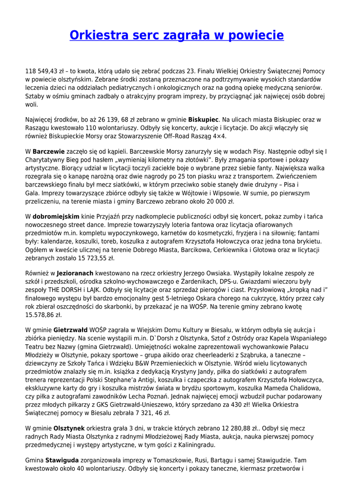 Orkiestra serc zagrała w powiecie 118 549,43 zł – to kwota, którą udało się zebrać podczas 23. Finału Wielkiej Orkiestry Świątecznej Pomocy w powiecie olsztyńskim. Zebrane środki zostaną przeznaczone na podtrzymywanie wysokich standardów leczenia dzieci na oddziałach pediatrycznych i onkologicznych oraz na godną opiekę medyczną seniorów. Sztaby w ośmiu gminach zadbały o atrakcyjny program imprezy, by przyciągnąć jak najwięcej osób dobrej woli. Najwięcej środków, bo aż 26 139, 68 zł zebrano w gminie Biskupiec. Na ulicach miasta Biskupiec oraz w Raszągu kwestowało 110 wolontariuszy. Odbyły się koncerty, aukcje i licytacje. Do akcji włączyły się również Biskupieckie Morsy oraz Stowarzyszenie Off–Road Rasząg 4×4. W Barczewie zaczęło się od kąpieli. Barczewskie Morsy zanurzyły się w wodach Pisy. Następnie odbył się I Charytatywny Bieg pod hasłem „wymieniaj kilometry na złotówki”. Były zmagania sportowe i pokazy artystyczne. Biorący udział w licytacji toczyli zaciekłe boje o wybrane przez siebie fanty. Największa walka rozegrała się o kanapę narożną oraz dwie nagrody po 25 ton piasku wraz z transportem. Zwieńczeniem barczewskiego finału był mecz siatkówki, w którym przeciwko sobie stanęły dwie drużyny – Pisa i Gala. Imprezy towarzyszące zbiórce odbyły się także w Wójtowie i Wipsowie. W sumie, po pierwszym przeliczeniu, na terenie miasta i gminy Barczewo zebrano około 20 000 zł. W dobromiejskim kinie Przyjaźń przy nadkomplecie publiczności odbył się koncert, pokaz zumby i tańca nowoczesnego street dance. Imprezie towarzyszyły loteria fantowa oraz licytacja ofiarowanych przedmiotów m.in. kompletu wypoczynkowego, karnetów do kosmetyczki, fryzjera i na siłownię; fantami były: kalendarze, koszulki, toreb, koszulka z autografem Krzysztofa Hołowczyca oraz jedna tona brykietu. Ogółem w kweście ulicznej na terenie Dobrego Miasta, Barcikowa, Cerkiewnika i Głotowa oraz w licytacji zebranych zostało 15 723,55 zł. Również w Jezioranach kwestowano na rzecz orkiestry Jerzego Owsiaka. Wystąpiły lokalne zespoły ze szkół i przedszkoli, ośrodka szkolno-wychowawczego e Żardenikach, DPS-u. Gwiazdami wieczoru były zespoły THE DORSH i LAJK. Odbyły się licytacje oraz sprzedaż pierogów i ciast. Przysłowiową „kropką nad i” finałowego występu był bardzo emocjonalny gest 5-letniego Oskara chorego na cukrzycę, który przez cały rok zbierał oszczędności do skarbonki, by przekazać je na WOŚP. Na terenie gminy zebrano kwotę 15.578,86 zł. W gminie Gietrzwałd WOŚP zagrała w Wiejskim Domu Kultury w Biesalu, w którym odbyła się aukcja i zbiórka pieniędzy. Na scenie wystąpili m.in. D`Dorsh z Olsztynka, Sztof z Ostródy oraz Kapela Wspaniałego Teatru bez Nazwy (gmina Gietrzwałd). Umiejętności wokalne zaprezentowali wychowankowie Pałacu Młodzieży w Olsztynie, pokazy sportowe – grupa aikido oraz cheerleaderki z Sząbruka, a taneczne – dziewczyny ze Szkoły Tańca i Wdzięku B&W Przemienieckich w Olsztynie. Wśród wielu licytowanych przedmiotów znalazły się m.in. książka z dedykacją Krystyny Jandy, piłka do siatkówki z autografem trenera reprezentacji Polski Stephane’a Antigi, koszulka i czapeczka z autografem Krzysztofa Hołowczyca, ekskluzywne karty do gry i koszulka mistrzów świata w brydżu sportowym, koszulka Mameda Chalidowa, czy piłka z autografami zawodników Lecha Poznań. Jednak najwięcej emocji wzbudził puchar podarowany przez młodych piłkarzy z GKS Gietrzwałd-Unieszewo, który sprzedano za 430 zł! Wielka Orkiestra Świątecznej pomocy w Biesalu zebrała 7 321, 46 zł. W gminie Olsztynek orkiestra grała 3 dni, w trakcie których zebrano 12 280,88 zł.. Odbył się mecz radnych Rady Miasta Olsztynka z radnymi Młodzieżowej Rady Miasta, aukcja, nauka pierwszej pomocy przedmedycznej i występy artystyczne, w tym gości z Kaliningradu. Gmina Stawiguda zorganizowała imprezy w Tomaszkowie, Rusi, Bartągu i samej Stawigudzie. Tam kwestowało około 40 wolontariuszy. Odbyły się koncerty i pokazy taneczne, kiermasz przetworów i wypieków domowych. Ciekawym pomysłem była licytacja spotkania przy kawie i ciasteczkach w gabinecie Ireny Derdoń, wójta gminy i Bogusławy Chodorskiej, dyrektor gimnazjum. Strażacy z OSP na aukcję wystawili przejazd wozem strażackim w mundurze, w dodatku na miejscu dowódcy. W sumie zebrano 16 691 zł. Dywity włączyły się do świątecznego grania pod hasłem „Pozytywnie zakręceni”. Nie zabrakło tradycyjnie już organizowanej orkiestrowej kawiarenki z domowymi wypiekami. Podczas koncertu kolęd Zespołu Wokalnego CANTEMUS, występu przedszkolaków, grupy teatralnej z Frączek, pokazów tanecznych i przejażdżek quadami zebrano 4 814 zł. WOŚP w Biesalu: www.youtube.com/watch?v=-W6utbyasp4 A tak było w pozostałych gminach: Drukuj