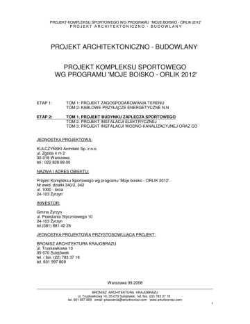 PROJEKT KOMPLEKSU SPORTOWEGO WG PROGRAMU 'MOJE BOISKO - ORLIK 2012' PROJEKT ARCHITEKTONICZNO - BUDOW LANY PROJEKT ARCHITEKTONICZNO - BUDOWLANY PROJEKT KOMPLEKSU SPORTOWEGO WG PROGRAMU 'MOJE BOISKO - ORLIK 2012' ETAP 1: TOM 1: PROJEKT ZAGOSPODAROWANIA TERENU TOM 2: KABLOWE PRZYŁĄCZE ENERGETYCZNE N.N ETAP 2: TOM 1. PROJEKT BUDYNKU ZAPLECZA SPORTOWEGO TOM 2. PROJEKT INSTALACJI ELEKTRYCZNEJ TOM 3. PROJEKT INSTALACJI WODNO-KANALIZACYJNEJ ORAZ CO JEDNOSTKA PROJEKTOWA: KULCZYŃSKI Architekt Sp. z o.o. ul. Zgoda 4 m 2 00-018 Warszawa tel.: 022 828 88 00 NAZWA I ADRES OBIEKTU: Projekt Kompleksu Sportowego wg programu 'Moje boisko - ORLIK 2012'. Nr ewid. działki 340/2, 342 ul. 1000 - lecia 24-103 Żyrzyn INWESTOR: Gmina Żyrzyn ul. Powstania Styczniowego 10 24-103 Żyrzyn tel.(081) 881 42 26 JEDNOSTKA PROJEKTOWA PRZYSTOSOWUJĄCA PROJEKT: BRONISZ ARCHITEKTURA KRAJOBRAZU ul. Truskawkowa 10 05-070 Sulejówek tel. / fax. (22) 783 37 16 tel. 601 997 809 Warszawa 09.2008 BRONISZ ARCHITEKTURA KRAJOBRAZU ul. Truskawkowa 10, 05-070 Sulejówek, tel./fax. (22) 783 37 16 tel. 601 997 809 email: [email protected] www.arturbronisz.com 1 PROJEKT KOMPLEKSU SPORTOWEGO WG PROGRAMU 'MOJE BOISKO - ORLIK 2012' PROJEKT ARCHITEKTONICZNO - BUDOW LANY AUTORZY: Nr Branża Projektant Nr uprawnień 1 Architektura Sprawdzający mgr inż. Łukasz Górzyński MA/040/05 2 Architektura mgr inż. Ewa Żebrowska ST-358/88 3 Architektura inż. Artur Bronisz 4 Architektura mgr inż. Aneta Jarocka OGR. 7123/2008 5 Architektura mgr inż. Anna Wróbel OGR. 6910/2007 Podpis OGR.W-INŻ. 69/2001 BRONISZ ARCHITEKTURA KRAJOBRAZU ul. Truskawkowa 10, 05-070 Sulejówek, tel./fax. (22) 783 37 16 tel. 601 997 809 email: [email protected] www.arturbronisz.com 2 PROJEKT KOMPLEKSU SPORTOWEGO WG PROGRAMU 'MOJE BOISKO - ORLIK 2012' PROJEKT ARCHITEKTONICZNO - BUDOW LANY 1. LOKALIZACJA TERENU OBJĘTEGO OPRACOWANIEM Teren zlokalizowany jest w miejscowości Żyrzyn w województwie lubelskim przy ul. 1000 – lecia przy Szkole Podstawowej. Projekt zawiera zagospodarowanie terenu przeznaczonego pod zabudowę boiskiem gminnym. SPIS ZAWARTOŚCI OPRACOWANIA L.P. Część opisowa projektu architektoniczno - budowlanego 1. 7. 8. 9. Przeznaczenie i program użytkowy obiektu i jego charakterystyczne parametry techniczne dane liczbowe Forma architektoniczna i funkcja obiektu budowlanego, sposób jego dostosowania do krajobrazu i otaczającej zabudowy oraz sposób spełnienia wymagań, o których mowa w art. 5 ust. 1 ustawy prawo budowlane Układ konstrukcyjny obiektu i rozwiązania materiałowe Dostępność dla osób niepełnosprawnych Rozwiązania budowlane i techniczno – instalacyjne Charakterystyka energetyczna obiektu oraz jego wpływa na środowisko Warunki ochrony przeciwpożarowej Uwagi Zestawienie elementów Nr rysunku Część graficzna 2. 3. 4. 5. 6. ZYRZ:PAB:00 ZYRZ:PAB:01 ZYRZ:PAB:02 ZYRZ:PAB:03 ZYRZ:PAB:04 ZYRZ:PAB:05 ZYRZ:PAB:06 ZYRZ:PAB:07 ZYRZ:PAB:08 ZYRZ:PAB:09 ZYRZ:PAB:10 MODUŁOWY SYSTEM ZAPLECZA BOISK SPORTOWYCH ZAGOSPODAROWANIE TERENU MODUŁOWY SYSTEM ZAPLECZA BOISK SPORTOWYCH POSADOWIENIE PODWALIN NA STUDNIACH MODUŁOWY SYSTEM ZAPLECZA BOISK SPORTOWYCH RZUT PANELI PODŁOGOWYCH MODUŁOWY SYSTEM ZAPLECZA BOISK SPORTOWYCH RZUT PRZYZIEMIA MODUŁOWY SYSTEM ZAPLECZA BOISK SPORTOWYCH RZUT PANELI STROPOWO-DACHOWYCH MODUŁOWY SYSTEM ZAPLECZA BOISK SPORTOWYCH RZUT DACHU MODUŁOWY SYSTEM ZAPLECZA BOISK SPORTOWYCH PRZEKRÓJ P1 MODUŁOWY SYSTEM ZAPLECZA BOISK SPORTOWYCH ELEWACJA E1 i E2 MODUŁOWY SYSTEM ZAPLECZA BOISK SPORTOWYCH ELEWACJA E3 i E4 MODUŁOWY SYSTEM ZAPLECZA BOISK SPORTOWYCH POCHYLNIA DLA NIEPWŁNOSPRAWNYCH – RZUT, PRZEKROJE, DETAL Katalog elementów SU1 – STUDNIA ŻELBETOWA DEKLOWANA WARSTWĄ BETONU BRONISZ ARCHITEKTURA KRAJOBRAZU ul. Truskawkowa 10, 05-070 Sulejówek, tel./fax. (22) 783 37 16 tel. 601 997 809 email: [email protected] www.arturbronisz.com Skala 1:50 1:50 1:50 1:50 1:50 1:50 1:50 1:50 1:50 1:5 1:25 1:50 3 PROJEKT KOMPLEKSU SPORTOWEGO WG PROGRAMU 'MOJE BOISKO - ORLIK 2012' PROJEKT ARCHITEKTONICZNO - BUDOW LANY ZYRZ:PAB:11 SU2– STUDNIA ŻELBETOWA WYPEŁNIONA ŻWIREM ZYRZ:PAB:12 P1 – PODWALINA ŻELBETOWA ZYRZ:PAB:13 ZYRZ:PAB:14 ZYRZ:PAB:15 ZYRZ:PAB:16 ZYRZ:PAB:17 ZYRZ:PAB:18 ZYRZ:PAB:19 ZYRZ:PAB:20 ZYRZ:PAB:21 ZYRZ:PAB:22 ZYRZ:PAB:23 ZYRZ:PAB:24 ZYRZ:PAB:25 ZYRZ:PAB:26 SP1 – PANELE PODŁOGOWE 255x520 SP2 – PANELE PODŁOGOWE 260x520 SP3 – PANELE PODŁOGOWE POD PERGOLĘ 245x485 SP4 - PANELE PODŁOGOWE POD PERGOLĘ 238x270 S1 – PIONOWE ELEMENTY KONSTRUKCYJNE 10x10cm SZ1 – ŚCIANA ZEWNĘTRZNA / PANEL 253x250x18 SZ2 – ŚCIANA ZEWNĘTRZNA / PANEL 253x250x18 SZ4 – ŚCIANA ZEWNĘTRZNA / PANEL 241x250x18 SZ1D – ŚCIANA ZEWNĘTRZNA Z DRZWIAMI SZ2D – ŚCIANA ZEWNĘTRZNA Z DRZWIAMI SW1 – ŚCIANA WEWNĘTRZNA SW2 – ŚCIANA WEWNĘTRZNA SW1D – ŚCIANA WEWNĘTRZNA Z DRZWIAMI SW4D – ŚCIANA WEWNĘTRZNA Z DRZWIAMI PO – ŚWIETLIK DACHOWY Z MOŻLIWOŚCIĄ OTWIERANIA D – SCHODEK BETONOWY RD – RURA SPUSTOWA ST1 – PANELE STROPOWO DACHOWE 255x520 ST2 – PANELE STROPOWO DACHOWE 260x520 ST3 – PANELE STROPOWO DACHOWE 265x520 ST4 – PERGOLA 245x520 KS1 – KABINA ŁAZIENKOWA Z AKRYLU KS2 – KABINA ŁAZIENKOWA Z AKRYLU KS3 – KABINA ŁAZIENKOWA Z AKRYLU KS4 – KABINA ŁAZIENKOWA Z AKRYLU DLA NIEPEŁNOSPRAWNYCH WN – WENTYLATOR NAWIEWNY WW – WENTYLATOR WYCIĄGOWY WD – WPUSTY DACHOWE ZYRZ:PAB:27 ZYRZ:PAB:28 ZYRZ:PAB:29 ZYRZ:PAB:30 ZYRZ:PAB:31 ZYRZ:PAB:32 ZYRZ:PAB:33 ZYRZ:PAB:34 ZYRZ:PAB:35 ZYRZ:PAB:36 ZYRZ:PAB:37 ZYRZ:PAB:38 ZYRZ:PAB:39 ZYRZ:PAB:40 BRONISZ ARCHITEKTURA KRAJOBRAZU ul. Truskawkowa 10, 05-070 Sulejówek, tel./fax. (22) 783 37 16 tel. 601 997 809 email: [email protected] www.arturbronisz.com 1:50 1:20 1:50 1:50 1:50 1:50 1:50 1:50 1:50 1:50 1:50 1:50 1:50 1:50 1:50 1:50 1:50 1:50 1:20 1:10 1:50 1:50 1:50 1:50 1:50 1:50 1:50 1:50 1:20 1:20 1:20 4 PROJEKT KOMPLEKSU SPORTOWEGO WG PROGRAMU 'MOJE BOISKO - ORLIK 2012' PROJEKT ARCHITEKTONICZNO - BUDOW LANY CZĘŚĆ OPISOWA PROJEKTU ARCHITEKTONICZ