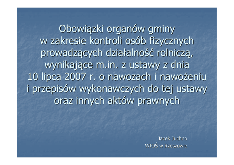 Obowiązki organów gminy w zakresie kontroli osób fizycznych prowadzących działalność rolniczą, wynikające m.in. z ustawy z dnia 10 lipca 2007 r. o nawozach i nawożeniu i przepisów wykonawczych do tej ustawy oraz innych aktów prawnych Jacek Juchno WIOŚ w Rzeszowie Uprawnienia organów gminy do kontroli osób fizycznych, w zakresie stosowania i przechowywania nawozów, w tym nawozów naturalnych Art. 32 ustawy o nawozach i nawożeniu - Inspekcja Ochrony Środowiska przeprowadza kontrolę przestrzegania przepisów dotyczących warunków stosowania i przechowywania nawozów, nawozów oznaczonych znakiem „NAWÓZ WE” oraz środków wspomagających uprawę roślin w sposób określony w przepisach o Inspekcji Ochrony Środowiska Art. 2 ust. 1 pkt 1 lit. a ustawy z dnia 20 lipca 1991 r. o Inspekcji Ochrony Środowiska - do zadań Inspekcji Ochrony Środowiska należy kontrola podmiotów korzystających ze środowiska w rozumieniu ustawy z dnia 27 kwietnia 2001 r. Prawo ochrony środowiska, w zakresie przestrzegania przepisów o ochronie środowiska Art. 3 pkt 20 lit. c - podmiotem korzystającym ze środowiska jest osoba fizyczna niebędącą przedsiębiorcą, korzystającą ze środowiska w zakresie, w jakim korzystanie ze środowiska wymaga pozwolenia Zasady dotyczące stosowania i przechowywania nawozów, w tym nawozów naturalnych, wynikające z: ustawy z dnia 10 lipca 2007 r. o nawozach i nawożeniu; rozporządzenia Ministra Rolnictwa i Rozwoju Wsi z dnia 16 kwietnia 2008 r. w sprawie szczegółowego sposobu stosowania nawozów oraz prowadzenia szkoleń z zakresu ich stosowania; rozporządzenia Ministra Rolnictwa i Gospodarki Żywnościowej z dnia 7 października 1997 r. w sprawie warunków technicznych, jakim powinny odpowiadać budowle rolnicze i ich usytuowanie; Kodeksu Dobrej Praktyki Rolniczej – dokumentu opracowanego w 2004 roku ze środków Ministerstwa Rolnictwa i Rozwoju Wsi przy współpracy z Ministerstwem Środowiska, zawierającego zbiór dobrych praktyk rolniczych, których stosowanie zapewni zrównoważony rozwój w sferze produkcji rolniczej. Przechowywanie nawozów naturalnych Art. 25 ust. 1 ustawy o nawozach i nawożeniu - gnojówkę i gnojowicę przechowuje się wyłącznie w szczelnych zbiornikach o pojemności umożliwiającej gromadzenie co najmniej 4miesięcznej produkcji tego nawozu. Zbiorniki te powinny być zbiornikami zamkniętymi, w rozumieniu przepisów […] ustawy z dnia 7 lipca 2004 r. - Prawo budowlane dotyczących warunków technicznych, jakim powinny odpowiadać budowle rolnicze i ich usytuowanie Art. 25 ust. 1 ustawy o nawozach i nawożeniu - podmioty, o których mowa w art. 18 ust. 1 (duże gospodarstwa wymagające pozwolenia zintegrowanego) , przechowują nawozy naturalne, inne niż wymienione w ust. 1, na nieprzepuszczalnych płytach, zabezpieczonych w taki sposób, aby wycieki nie przedostawały się do gruntu Przechowywanie nawozów naturalnych Zamknięte zbiorniki na płynne odchody zwierzęce powinny mieć: dno i ściany nieprzepuszczalne; szczelne przykrycie, z wyłączeniem zbiorników na płynne odchody zwierzęce lub ich części znajdujących się pod budynkiem inwentarskim, stanowiących technologiczne wyposażenie budynku inwentarskiego; wylot wentylacyjny i zamykany otwór wejściowy. Przechowywanie nawozów naturalnych Odległości zamkniętych zbiorników na płynne odchody zwierzęce, mierzone od pokryw i wylotów wentylacyjnych, powinny wynosić co najmniej: 10 m od pomieszczeń przeznaczonych na pobyt ludzi na działkach sąsiednich, jednak nie mniej niż 15 m od otworów okiennych i drzwiowych w tych pomieszczeniach; 15 m od magazynów środków spożywczych, a także od obiektów budowlanych służących przetwórstwu artykułów rolnospożywczych; 4 m od granicy działki sąsiedniej; 5 m od budynków magazynowych pasz i ziarna; 5 m od silosów na zboże i pasze; 5 m od silosów na kiszonki. Przechowywanie nawozów naturalnych Odległość płyt do składowania obornika powinna wynosić co najmniej: 25 m od pomieszczeń przeznaczonych na pobyt ludzi na działkach sąsiednich, jednak nie mniej niż 30 m od otworów okiennych i drzwiowych w tych pomieszczeniach; 50 m od budynków służących przetwórstwu artykułów rolnospożywczych i magazynów środków spożywczych; 10 m od budynków magazynowych pasz i ziarna; 4 m od granicy działki sąsiedniej; 5 m od silosów na zboże i pasze; 10 m od silosów na kiszonki. Przechowywanie nawozów naturalnych Dopuszcza się sytuowanie zamkniętych zbiorników na płynne odchody zwierzęce i płyt do składowania obornika w odległościach mniejszych lub na granicy działek, w przypadku gdy będą przylegać do tego samego rodzaju budowli rolniczych na działce sąsiedniej. Przechowywanie nawozów naturalnych Nie ogranicza się odległości zamkniętych zbiorników na płynne odchody zwierzęce oraz płyt do składowania obornika od granicy działki sąsiedniej, jeżeli działka sąsiednia jest własnością inwestora lub jest on jej użytkownikiem wieczystym Przechowywanie kiszonek Odległość silosów na kiszonki powinna wynosić co najmniej: 25 m od pomieszczeń przeznaczonych na pobyt ludzi, jednak nie mniej niż 30 m od otworów okiennych i drzwiowych w tych pomieszczeniach; 50 m od budynków służących przetwórstwu artykułów rolnospożywczych i magazynów środków spożywczych; 8 m od budynków magazynowych pasz i ziarna; 15 m od instalacji służących do otrzymywania biogazu rolniczego; 15 m od składu węgla i koksu; 5 m od granicy działki sąsiedniej. Silosy na kiszonki powinny mieć dno i ściany nieprzepuszczalne Przechowywanie nawozów naturalnych Budowle rolnicze uciążliwe dla otoczenia, w szczególności z uwagi na zapylenie, zapachy lub wydzielanie się substancji toksycznych, powinny być odizolowane od przyległych terenów pasem zieleni złożonym z roślinności średnio- i wysokopiennej Przechowywanie nawozów naturalnych Przepisów rozporządz