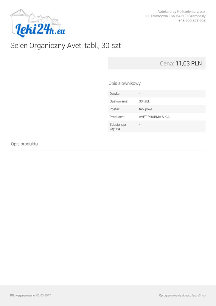 Apteka przy Kościele sp. z o.o. ul. Dworcowa 16a, 64-500 Szamotuły +48 600 823 608 Selen Organiczny Avet, tabl., 30 szt Cena: 11,03 PLN Opis słownikowy Dawka - Opakowanie 30 tabl. Postać tabl.powl. Producent AVET PHARMA S.K.A Substancja czynna - Opis produktu Plik wygenerowano: 02-03-2017 Powered by TCPDF (www.tcpdf.org) Oprogramowanie sklepu: AptusShop