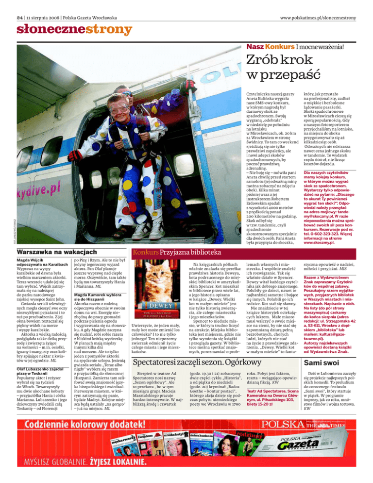 24 | 11 sierpnia 2008 | Polska Gazeta Wrocławska www.polskatimes.pl/slonecznestrony słonecznestrony Nasz Konkurs I mocnewrażenia! FOT.JANUSZWÓJTOWICZ Zrób krok w przepaść Warszawka na wakacjach Magda Wójcik odpoczywała na Karaibach Wyprawa na wyspy karaibskie od dawna była wielkim marzeniem aktorki. Teraz wreszcie udało jej się tam wybrać. Wójcik zatrzymała się na należącej do parku narodowego rajskiej wysepce Saint John. Gwiazda seriali telewizyjnych mogła cieszyć swe oczy niezwykłymi pejzażami i to tuż po przebudzeniu. Z jej okna bowiem roztaczał się piękny widok na morze i wyspy karaibskie. Aktorka z wielką radością podglądała także dziką przyrodę i zwierzęta żyjące na wolności – m.in. osiołki, iguany i mangusty oraz kolibry spijające nektar z kwiatów w jej ogrodzie. ML Olaf Lubaszenko zajadał pizzę w Toskanii Popularny aktor i reżyser wybrał się na tydzień do Włoch. Towarzyszyły mu dwie ukochane kobiety – przyjaciółka Hania i córka Marianna. Lubaszenko i jego dziewczyny zwiedzili całą Toskanię – od Florencji który, jak przystało na profesjonalistę, zadbał o miękkie i bezbolesne lądowanie pasażerki. Skoki spadochronowe w Mirosławicach cieszą się sporą popularnością. Gdy z naszym fotoreporterem przyjechaliśmy na lotnisko, na miejscu do skoku przygotowywało się aż kilkadziesiąt osób. Odważnych nie odstrasza nawet cena jednego skoku w tandemie. To wydatek rzędu 600 zł, nie licząc kosztów dojazdu. lemach własnych i miasteczka. I wspólnie znaleźć ich rozwiązanie. Tak się właśnie działo w Spencer. Dewey witał każdego czytelnika jak dobrego znajomego. Polubiły go dzieci, nawet te najbardziej samotne i bojące się innych. Polubili go ich rodzice. Kot stał się sławny. Nie znajdziecie w tej książce historyjek ociekających lukrem. Małe miasto musi walczyć o swoje miejsce na ziemi, by nie stać się zapomnianą dziurą pełną bezrobotnych, chorych ludzi, których nie stać na życie z prawdziwego zdarzenia. „Dewey. Wielki kot w małym mieście” to fanta- styczna opowieść o nadziei, miłości i przyjaźni. MIS Dla naszych czytelników mamy kolejny konkurs, w którym można wygrać skok ze spadochronem. Wystarczy tylko odpowiedzieć na pytanie: „Dlaczego to akurat Ty powinieneś wygrać ten skok?”. Odpowiedzi należy przesyłać na adres mejlowy: [email protected]. W razie niepowodzenia można spróbować swoich sił poza konkursem. Rezerwacje pod nr. tel. 0-602-323-323. Więcej informacji na stronie www.skoczmy.pl. Konkurs Przyjazna biblioteka po Pizę i Rzym. Ale to nie był jedyny tegoroczny wyjazd aktora. Pan Olaf planuje jeszcze wyprawę nad ciepłe morze. Oczywiście, tam także będą mu towarzyszyły Hania i Marianna. ML Magda Kumorek wybiera się do Hiszpanii Aktorka razem z rodziną odpoczywa obecnie w swoim domu na wsi. Energię niezbędną do pracy gromadzi podczas pielenia ogrodu i wygrzewania się na słoneczku. A gdy Magdzie zaczyna się nudzić, robi sobie razem z bliskimi krótką wycieczkę. W planach mają między innymi kilka dni nad morzem. Ale to tylko jeden z pomysłów aktorki na spędzenie urlopu. Jesienią gwiazda serialu „Teraz albo nigdy” wybiera się razem z przyjaciółką do słonecznej Hiszpanii. Zamierza tam szlifować swoją znajomość języka hiszpańskiego i zwiedzać. Pierwszym miastem, w którym zatrzymają się panie, będzie Madryt. Kolejne miejsca będą ustalały „na gorąco” – już na miejscu. ML Czytelniczka naszej gazety Aneta Kulińska wygrała nasz SMS-owy konkurs, w którym nagrodą był darmowy skok ze spadochronem. Swoją wygraną „odebrała” w niedzielę po południu na lotnisku w Mirosławicach, ok. 20 km za Wrocławiem w stronę Świdnicy. To tam co weekend zjeżdżają się nie tylko prawdziwi zapaleńcy, ale i nowi adepci skoków spadochronowych, by poczuć prawdziwą adrenalinę. – Nie boję się – mówiła pani Aneta chwilę przed startem samolotu (jej odważną minę można zobaczyć na zdjęciu obok). Kilka minut później wraz z jej instruktorem Robertem Erdowskim spadali z wysokości 4000 metrów z prędkością ponad 200 kilometrów na godzinę. Skok odbył się w tzw. tandemie, czyli spadochronie skonstruowanym specjalnie dla dwóch osób. Pani Aneta była przypięta do skoczka, Uwierzycie, że jeden mały, rudy kot może zmienić los człowieka? I to nie tylko jednego! Ten niepozorny zwierzak odmienił życie całego miasta i jego mieszkańców. Na księgarskich półkach właśnie znalazła się perełka: prawdziwa historia Deweya, kota podrzuconego do miejskiej biblioteki w amerykańskim Spencer. Kot mieszkał w bibliotece przez wiele lat, a jego historia opisana w książce „Dewey. Wielki kot w małym mieście” jest nie tylko historią zwierzęcia, ale całego miasteczka i jego mieszkańców. Spencer to nieduże miasto, w którym trudno liczyć na atrakcje. Miejska biblioteka jest miejscem, gdzie nie tylko wymienia się książki i przegląda gazety. W bibliotece można spotkać znajomych, porozmawiać o prob- Razem z Wydawnictwem Znak zapraszamy Czytelników do wspólnej zabawy. Poszukajmy razem wyjątkowych, przyjaznych bibliotek w Waszych miastach i miasteczkach. Napiszcie o nich. Na listy (do pół strony maszynopisu) czekamy do końca sierpnia (adres redakcji: ul. Strzegomska 42 a, 53-611, Wrocław z dopiskiem „biblioteka” lub mailem: [email protected]). Autorzy najciekawszych opowieści dostaną książki od Wydawnictwa Znak. Spectatoresizaczęlisezon.Ogórkowy Sami swoi Sierpień w teatrze Ad Spectatores nosi nazwę „Sezon ogórkowy”. Ale to przekora , bo w tym miesiącu grupa Macieja Masztalskiego pracuje bardzo intensywnie. W najbliższą środę i czwartek Dziś w Lubomierzu zaczęły się projekcje najlepszych polskich komedii. To preludium do corocznego festiwalu „Sami swoi”, który startuje w piątek. W programie imprezy, jak co roku, mnóstwo filmów i wojna tortowa. KW