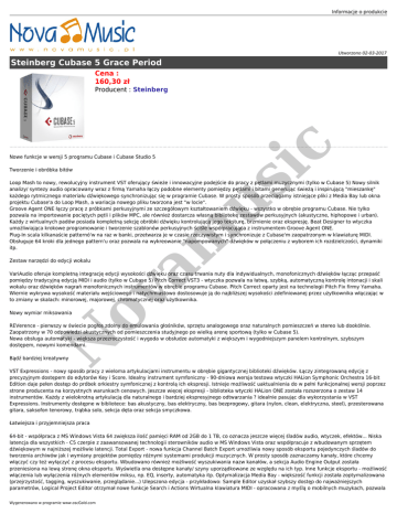 Informacje o produkcie Utworzono 02-03-2017 Steinberg Cubase 5 Grace Period Cena : 160,30 zł ic Producent : Steinberg Nowe funkcje w wersji 5 programu Cubase i Cubase Studio 5 Tworzenie i obróbka bitów Zestaw narzędzi do edycji wokalu am us Loop Mash to nowy, rewolucyjny instrument VST oferujący świeże i innowacyjne podejście do pracy z pętlami muzycznymi (tylko w Cubase 5) Nowy silnik analizy/ syntezy audio opracowany wraz z firmą Yamaha łączy podobne elementy pomiędzy pętlami i bitami generując świeżą i inspirującą "mieszankę" każdego rytmicznego materiału dźwiękowego synchronizując się w programie Cubase. W prosty sposób przeciągamy istniejące pliki z Media Bay lub okna projektu Cubase'a do Loop Mash, a wariacja nowego pliku tworzona jest "w locie". Groove Agent ONE łączy pracę z próbkami perkusyjnymi ze szczegółowym kształtowaniem dźwięku - wszystko w obrębie programu Cubase. Nie tylko pozwala na importowanie pociętych pętli i plików MPC, ale również dostarcza własną bibliotekę zestawów perkusyjnych (akustyczne, hiphopowe i urban). Każdy z wirtualnych padów posiada kompletną sekcję obróbki dźwięku kontrolującą jego teksturę, brzmienie oraz ekspresję. Beat Designer to wtyczka umożliwiająca krokowe programowanie i tworzenie szablonów perkusyjnych ściśle współpracująca z instrumentem Groove Agent ONE. Plug-In scala kilkanaście patternó'w na raz w banki, przetwarza je w czasie rzeczywistym i synchronizuje z Cubase'm zaopatrzonym w klawiaturę MIDI. Obsługuje 64 kroki dla jednego pattern'u oraz pozwala na wykreowanie "napompowanych" dźwięków w połączeniu z wyborem ich rozdzielczości, dynamiki itp. ov VariAudio oferuje kompletną integrację edycji wysokości dźwięku oraz czasu trwania nuty dla indywidualnych, monofonicznych dźwięków łącząc przepaść pomiędzy tradycyjną edycją MIDI i audio (tylko w Cubase 5) Pitch Correct VST3 - wtyczka pozwala na łatwą, szybką, automatyczną kontrolę intonacji i skali wokalu oraz dźwięków nagrań monofonicznych instrumentów w obrębie programu Cubase. Pitch Correct oparty jest na technologii Pitch Fix firmy Yamaha. Wiernie wykrywa wysokość materiału wejściowego i natychmiastowo dostosowuje ją do najbliższej wysokości zdefiniowanej przez użytkownika włączając w to zmiany w skalach: minorowej, majorowej, chromatycznej oraz użytkownika. Nowy wymiar miksowania N REVerence - pierwszy w świecie pogłos zdolny do emulowania głośników, sprzętu analogowego oraz naturalnych pomieszczeń w stereo lub dookólnie. Zaopatrzony w 70 odpowiedzi akustycznych od pomieszczenia studyjnego po wielką arenę sportową (tylko w Cubase 5). Nowa obsługa automatyki - większa przezroczystość i wygoda w obsłudze automatyki z większym i wygodniejszym panelem kontrolnym, szybszym dostępem, nowymi komendami. Bądź bardziej kreatywny VST Expressions - nowy sposób pracy z wieloma artykulacjami instrumentu w obrębie gigantycznej biblioteki dźwięków. Łączy zintegrowaną edycję z precyzyjnym dostępem do edytorów Key i Score. Idealny instrument symfoniczny - 90-dniowa wersja testowa wtyczki HALion Symphonic Orchestra 16-bit Edition daje pełen dostęp do próbek orkiestry symfonicznej z kontrolą ich ekspresji. Istnieje możliwość uaktualnienia do w pełni funkcjonalnej wersji poprzez strone producenta na korzystnych warunkach cenowych. Jeszcze więcej ekspresji - biblioteka wtyczki HALion ONE została rozszerzona o zestaw 14 instrumentów. Każdy z wielokrotną artykulacją dla naturalnego i bardziej ekspresyjnego odtwarzania ? idealnie pasując dla wykorzystania w VST Expressions. Instrumenty dostępne w bibliotece: bas akustyczny, bas elektryczny, bas bezprogowy, gitara (nylon, clean, elektryczna, steel), przesterowana gitara, saksofon tenorowy, trąbka solo, sekcja dęta oraz sekcja smyczkowa. Łatwiejsza i przyjemniejsza praca 64-bit - współpraca z MS Windows Vista 64 zwiększa ilość pamięci RAM od 2GB do 1 TB, co oznacza jeszcze więcej śladów audio, wtyczek, efektów... Niska latencja dla wszystkich - C5 czerpie z zaawansowanej technologii sterowników audio w MS Windows Vista oraz współpracuje z wbudowanym sprzętem dźwiękowym w najniższej możliwie latencji. Total Export - nowa funkcja Channel Batch Export umożliwia nowy sposób eksportu pojedynczych śladów do tworzenia archiwów jak i wymiany projektów pomiędzy różnymi systemami produkcji muzycznych. W prosty sposób zaznaczamy kanały, które chcemy włączyć czy też wyłączyć z procesu eksportu. Wbudowano również możliwość wyszukiwania nazw kanałów, a sekcja Audio Engine Output została przeniesiona na lewą stronę okna eksportu. Wyświetla ona dostępne kanały/ szyny uporządkowane ze względu na ich typ. Inne funkcje eksportu - możliwość włączenia lub wyłączenia różnych elementów miksu, np. EQ, inserty, automatyka itp. Optymalizacja Media Bay - większość funkcji została zoptymalizowana (przejrzystość, tagging, wyszukiwanie, przeglądanie...) Ulepszona edycja - przykładowo: Sample Editor uzyskał szybszy dostęp do najważniejszych parametrów, Logical Project Editor otrzymał nowe funkcje Search i Actions Wirtualna klawiatura MIDI - opracowana z myślą o mobilnych muzykach, pozwala Wygenerowano w programie www.oscGold.com na grę instrumentami poprzez klawiaturę komputera oraz myszkę Inne udoskonalenia i zmiany: N ov am us ic MIDI Monitor jako wtyczka MIDI - pokazuje wykonane zdarzenia MIDI, które mogą być wyeksportowane później do pliku Odświeżenie wtyczek MIDI wszystkie wtyczki MIDI otrzymały odświeżony interfejs użytkownika, dzięki któremu praca staje się łatwiejsza i przyjemniejsza. Sortowanie wtyczek VSTwtyczki VST mogą być obecnie sortowane również poprzez nazwę producenta jak i ich kategorię Unicode - pełne wsparcie dla Unicode umożliwiające wpisywanie tekstu w wielu językach świata włączając japoński, hebraj