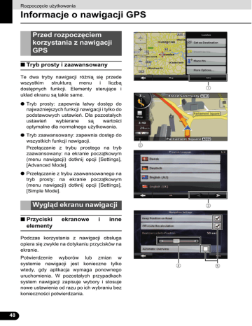 Rozpoczęcie użytkowania Informacje o nawigacji GPS Przed rozpoczęciem korzystania z nawigacji GPS ■ Tryb prosty i zaawansowany Te dwa tryby nawigacji różnią się przede wszystkim strukturą menu i liczbą dostępnych funkcji. Elementy sterujące i układ ekranu są takie same. ● Tryb prosty: zapewnia łatwy dostęp do najważniejszych funkcji nawigacji i tylko do podstawowych ustawień. Dla pozostałych ustawień wybierane są wartości optymalne dla normalnego użytkowania. ● Tryb zaawansowany: zapewnia dostęp do wszystkich funkcji nawigacji. Przełączanie z trybu prostego na tryb zaawansowany: na ekranie początkowym (menu nawigacji) dotknij opcji [Settings], [Advanced Mode]. ● Przełączanie z trybu zaawansowanego na tryb prosty: na ekranie początkowym (menu nawigacji) dotknij opcji [Settings], [Simple Mode]. Wygląd ekranu nawigacji ■ Przyciski elementy ekranowe i inne Podczas korzystania z nawigacji obsługa opiera się zwykle na dotykaniu przycisków na ekranie. Potwierdzenie wyborów lub zmian w systemie nawigacji jest konieczne tylko wtedy, gdy aplikacja wymaga ponownego uruchomienia. W pozostałych przypadkach system nawigacji zapisuje wybory i stosuje nowe ustawienia od razu po ich wybraniu bez konieczności potwierdzania. 48 48 Typ Pole wybor u Typ Przyk ład Opis Sposób korzystania Przyci a sk dotyko wy Dotknij, aby aktywować funkcję, otworzyć nowy ekran lub ustawić parametr. Wystarczy jedno dotknięcie. Ikona b Pokazuje informacje o stanie. Niektóre ikony pełnią również rolę przycisków. Wystarczy jedno dotknięcie. Lista c Jeśli do wyboru jest kilka opcji, są one wyświetlane w formie listy. Dotykając przycisków c można się przemieszczać po stronach. Suwa k d Jeśli funkcja ● Aby zmienić posiada pewną pozycję liczbę suwaka, nienazwanych przeciągnij wartości, jego wyświetlana wskaźnik. jest skala ze ● Dotknij wskaźnikiem, wskaźnika która suwaka. umożliwia Przesuń wybór wartości palec. z dostępnego zakresu. 49 Przyk ład Opis Sposób korzystania e Jeśli dostępne są tylko dwa ustawienia funkcji, pole wyboru wskazuje, czy funkcja ta jest włączona. Dotknij, aby włączyć lub wyłączyć funkcję. Wirtua f lna klawia tura Klawiatura alfabetyczna i alfanumeryczn a umożliwiająca wprowadzanie tekstu i liczb. Każdy klawisz jest przyciskiem dotykowym. 49