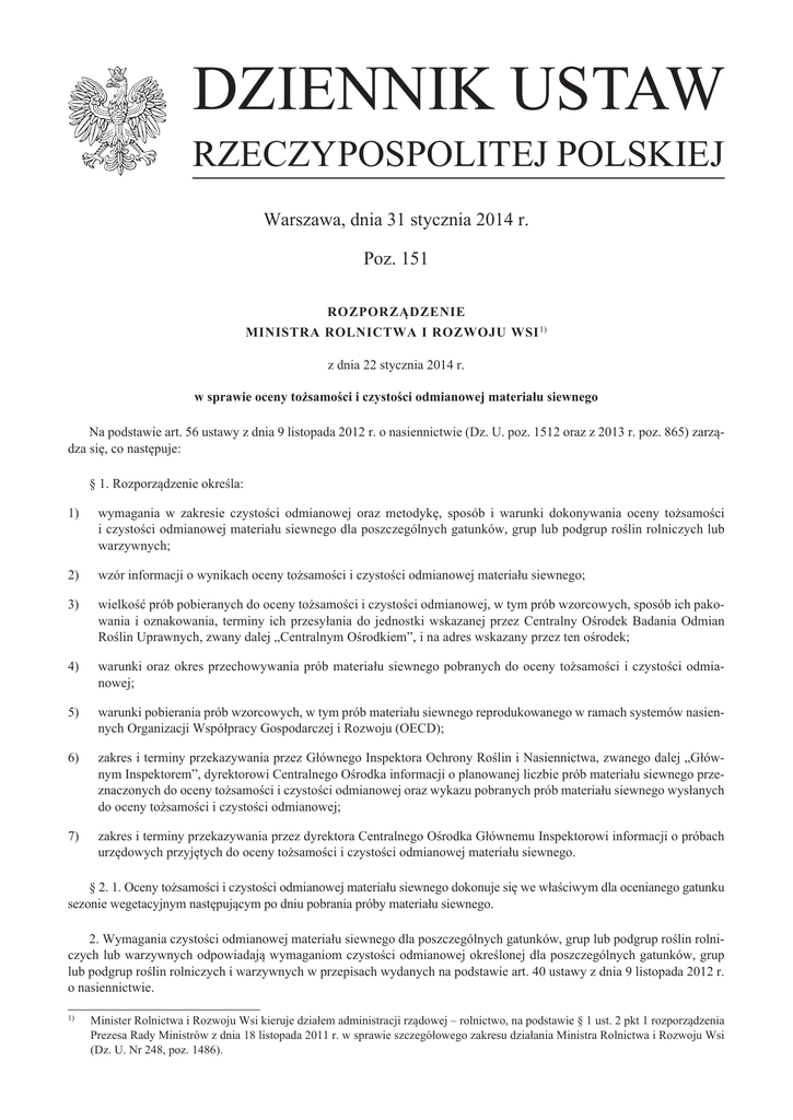 DZIENNIK USTAW RZECZYPOSPOLITEJ POLSKIEJ Warszawa, dnia 31 stycznia 2014 r. Poz. 151 Rozporządzenie Ministra Rolnictwa i Rozwoju Wsi 1) z dnia 22 stycznia 2014 r. w sprawie oceny tożsamości i czystości odmianowej materiału siewnego Na podstawie art. 56 ustawy z dnia 9 listopada 2012 r. o nasiennictwie (Dz. U. poz. 1512 oraz z 2013 r. poz. 865) zarządza się, co następuje: § 1. Rozporządzenie określa: 1)wymagania w zakresie czystości odmianowej oraz metodykę, sposób i warunki dokonywania oceny tożsamości i czystości odmianowej materiału siewnego dla poszczególnych gatunków, grup lub podgrup roślin rolniczych lub warzywnych; 2)wzór informacji o wynikach oceny tożsamości i czystości odmianowej materiału siewnego; 3)wielkość prób pobieranych do oceny tożsamości i czystości odmianowej, w tym prób wzorcowych, sposób ich pakowania i oznakowania, terminy ich przesyłania do jednostki wskazanej przez Centralny Ośrodek Badania Odmian Roślin Uprawnych, zwany dalej „Centralnym Ośrodkiem”, i na adres wskazany przez ten ośrodek; 4)warunki oraz okres przechowywania prób materiału siewnego pobranych do oceny tożsamości i czystości odmianowej; 5)warunki pobierania prób wzorcowych, w tym prób materiału siewnego reprodukowanego w ramach systemów nasiennych Organizacji Współpracy Gospodarczej i Rozwoju (OECD); 6)zakres i terminy przekazywania przez Głównego Inspektora Ochrony Roślin i Nasiennictwa, zwanego dalej „Głównym Inspektorem”, dyrektorowi Centralnego Ośrodka informacji o planowanej liczbie prób materiału siewnego przeznaczonych do oceny tożsamości i czystości odmianowej oraz wykazu pobranych prób materiału siewnego wysłanych do oceny tożsamości i czystości odmianowej; 7)zakres i terminy przekazywania przez dyrektora Centralnego Ośrodka Głównemu Inspektorowi informacji o próbach urzędowych przyjętych do oceny tożsamości i czystości odmianowej materiału siewnego. § 2. 1. Oceny tożsamości i czystości odmianowej materiału siewnego dokonuje się we właściwym dla ocenianego gatunku sezonie wegetacyjnym następującym po dniu pobrania próby materiału siewnego. 2. Wymagania czystości odmianowej materiału siewnego dla poszczególnych gatunków, grup lub podgrup roślin rolniczych lub warzywnych odpowiadają wymaganiom czystości odmianowej określonej dla poszczególnych gatunków, grup lub podgrup roślin rolniczych i warzywnych w przepisach wydanych na podstawie art. 40 ustawy z dnia 9 listopada 2012 r. o nasiennictwie. 1) Minister Rolnictwa i Rozwoju Wsi kieruje działem administracji rządowej – rolnictwo, na podstawie § 1 ust. 2 pkt 1 rozporządzenia Prezesa Rady Ministrów z dnia 18 listopada 2011 r. w sprawie szczegółowego zakresu działania Ministra Rolnictwa i Rozwoju Wsi (Dz. U. Nr 248, poz. 1486). Dziennik Ustaw –2– Poz. 151 § 3. 1. Oceny tożsamości i czystości odmianowej materiału siewnego dokonuje się przez porównanie roślin uzyskanych z próby badanej partii nasion odmiany z roślinami uzyskanymi z próby wzorcowej tej odmiany na poletku kontrolnym oraz z urzędowym opisem odmiany. 2. Oceny tożsamości i czystości odmianowej materiału siewnego dokonuje się na poletku kontrolnym na podstawie obserwacji cech określonych w metodykach badania odrębności, wyrównania i trwałości (OWT) opracowanych na podstawie metodyk Wspólnotowego Urzędu Odmian Roślin (CPVO) lub wytycznych Międzynarodowego Związku Ochrony Nowych Odmian Roślin (UPOV), a w przypadku ich braku – metodyk krajowych opracowanych przez Centralny Ośrodek. 3. Obserwacje cech prowadzi się zgodnie z metodyką badania OWT, w zakresie, w jakim była ona wykorzystana w celu sporządzenia urzędowego opisu w procesie rejestracji odmiany. § 4. 1. Wielkość poletka kontrolnego oraz jego układ powinny być zaplanowane w taki sposób, aby można było łatwo dokonywać obserwacji całego poletka we wszystkich stadiach rozwoju roślin. 2. Próbę pobraną do oceny tożsamości i czystości odmianowej materiału siewnego wysiewa się na dwóch poletkach kontrolnych. 3. Próbę wzorcową wysiewa się regularnie na każde dziesięć prób badanych partii tej samej odmiany. § 5. Oceny tożsamości i czystości odmianowej materiału siewnego poszczególnych gatunków, grup lub podgrup roślin rolniczych i warzywnych w zakresie szczegółowym dokonuje się zgodnie z metodyką oceny poletkowej określoną przez systemy nasienne OECD. § 6. Wielkość prób materiału siewnego pobieranych do oceny tożsamości i czystości odmianowej materiału siewnego dla poszczególnych gatunków roślin rolniczych i warzywnych jest określona w załączniku nr 1 do rozporządzenia. § 7. 1. Próba wzorcowa odmiany wpisanej do rejestru odmian, o którym mowa w art. 5 ustawy z dnia 9 listopada 2012 r. o nasiennictwie, zwanego dalej „krajowym rejestrem”, jest pobierana z próby wzorca odmiany przekazanej do Centralnego Ośrodka przez zachowującego odmianę w celu badania odmian przed wpisaniem do krajowego rejestru. 2. Próba wzorcowa odmiany powinna mieć wielkość wystarczającą do dokonania oceny tożsamości i czystości odmianowej w danym sezonie wegetacyjnym oraz umożliwić weryfikację próby wzorcowej w następnym sezonie wegetacyjnym i stanowić nie mniej niż dwukrotność wielkości próby określonej w załączniku nr 1 do rozporządzenia. 3. W przypadku reprodukcji zgodnie z systemami nasiennymi OECD odmian niewpisanych do krajowego rejestru lub wspólnotowego katalogu próba wzorcowa odmiany jest pobierana z partii przywiezionej do kraju i przeznaczonej do reprodukcji. § 8. 1. W celu dokonania oceny tożsamości i czystości odmianowej materiału siewnego odmian innych niż wpisane do krajowego rejestru próbę wzorcową odmiany wraz z urzędowym opisem sporządzonym przez jednostkę zajmującą się rejestracją odmian w danym państwie dostarcza się, za pośrednictwem Głównego Inspektora, do Centralnego Ośrodka. 2.