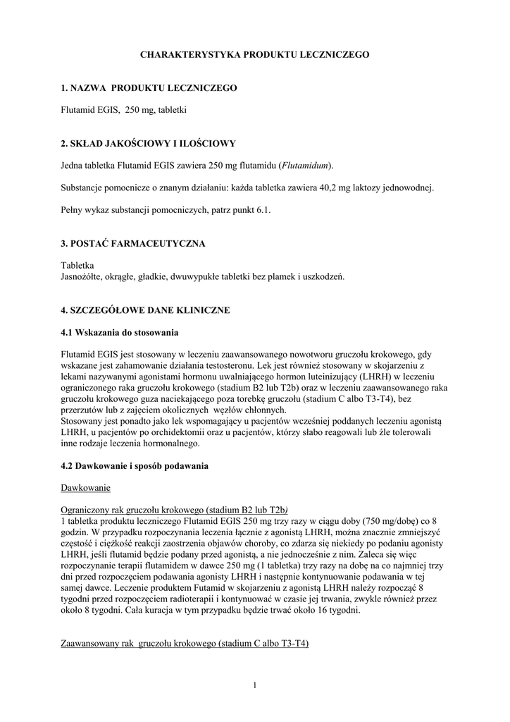 CHARAKTERYSTYKA PRODUKTU LECZNICZEGO 1. NAZWA PRODUKTU LECZNICZEGO Flutamid EGIS, 250 mg, tabletki 2. SKŁAD JAKOŚCIOWY I ILOŚCIOWY Jedna tabletka Flutamid EGIS zawiera 250 mg flutamidu (Flutamidum). Substancje pomocnicze o znanym działaniu: każda tabletka zawiera 40,2 mg laktozy jednowodnej. Pełny wykaz substancji pomocniczych, patrz punkt 6.1. 3. POSTAĆ FARMACEUTYCZNA Tabletka Jasnożółte, okrągłe, gładkie, dwuwypukłe tabletki bez plamek i uszkodzeń. 4. SZCZEGÓŁOWE DANE KLINICZNE 4.1 Wskazania do stosowania Flutamid EGIS jest stosowany w leczeniu zaawansowanego nowotworu gruczołu krokowego, gdy wskazane jest zahamowanie działania testosteronu. Lek jest również stosowany w skojarzeniu z lekami nazywanymi agonistami hormonu uwalniającego hormon luteinizujący (LHRH) w leczeniu ograniczonego raka gruczołu krokowego (stadium B2 lub T2b) oraz w leczeniu zaawansowanego raka gruczołu krokowego guza naciekającego poza torebkę gruczołu (stadium C albo T3-T4), bez przerzutów lub z zajęciem okolicznych węzłów chłonnych. Stosowany jest ponadto jako lek wspomagający u pacjentów wcześniej poddanych leczeniu agonistą LHRH, u pacjentów po orchidektomii oraz u pacjentów, którzy słabo reagowali lub źle tolerowali inne rodzaje leczenia hormonalnego. 4.2 Dawkowanie i sposób podawania Dawkowanie Ograniczony rak gruczołu krokowego (stadium B2 lub T2b) 1 tabletka produktu leczniczego Flutamid EGIS 250 mg trzy razy w ciągu doby (750 mg/dobę) co 8 godzin. W przypadku rozpoczynania leczenia łącznie z agonistą LHRH, można znacznie zmniejszyć częstość i ciężkość reakcji zaostrzenia objawów choroby, co zdarza się niekiedy po podaniu agonisty LHRH, jeśli flutamid będzie podany przed agonistą, a nie jednocześnie z nim. Zaleca się więc rozpoczynanie terapii flutamidem w dawce 250 mg (1 tabletka) trzy razy na dobę na co najmniej trzy dni przed rozpoczęciem podawania agonisty LHRH i następnie kontynuowanie podawania w tej samej dawce. Leczenie produktem Futamid w skojarzeniu z agonistą LHRH należy rozpocząć 8 tygodni przed rozpoczęciem radioterapii i kontynuować w czasie jej trwania, zwykle również przez około 8 tygodni. Cała kuracja w tym przypadku będzie trwać około 16 tygodni. Zaawansowany rak gruczołu krokowego (stadium C albo T3-T4) 1 Flutamid należy podawać łącznie z agonistą LHRH i kontynuować leczenie do uzyskania poprawy. Jeśli dochodzi do regresji guza lub stabilizacji jego rozrostu, leczenie kontynuuje się tak długo, jak długo pacjent reaguje pozytywnie na lek. Pacjenci z zaburzeniami czynności wątroby Flutamid może działać hepatotoksycznie (patrz punkt 4.4). U pacjentów z niewydolnością wątroby można zalecić długotrwałe leczenie produktem Flutamid EGIS jedynie po wnikliwej ocenie indywidualnych korzyści leczenia w porównaniu z ryzykiem wystąpienia działań niepożądanych. Nie należy stosować tego leczenia u pacjentów z 2-3-krotnie podwyższonym ponad normę poziomem aktywności aminotransferaz. Pacjenci z zaburzeniami czynności nerek Nie ma konieczności dostosowania dawkowania leku u pacjentów z upośledzoną czynnością nerek. Sposób podawania Dla wygody pacjenta, w ulotce i na opakowaniu zewnętrznym leku zamieszczono tabelę do graficznego przedstawienia sposobu jego stosowania. Daje to możliwość zaznaczenia indywidualnego dawkowania leku, jak i sprawdzenia przez pacjenta prawidłowości postępowania bezpośrednio przed przyjęciem leku. Rano Południe Wieczór Posiłek Dni 4.3 Przeciwwskazania Nadwrażliwość na substancję czynną lub na którąkolwiek substancję pomocniczą wymienioną w punkcie 6,1, 4.4 Specjalne ostrzeżenia i środki ostrożności dotyczące stosowania Rozpoczęcie leczenia flutamidem powinno się odbywać pod kontrolą specjalisty. Lek należy stosować ostrożnie u pacjentów z niewydolnością wątroby i skłonnością do zakrzepów. Hepatotoksyczność Flutamid może działać hepatotoksycznie. U pacjentów z niewydolnością wątroby można zalecić długotrwałe leczenie tym produktem jedynie po wnikliwej ocenie indywidualnych korzyści leczenia w porównaniu z ryzykiem wystąpienia działań niepożądanych. W wyniku uszkadzającego wątrobę działania flutamidu mogą wystąpić objawy takie jak: zmiany aktywności aminotransferaz, żółtaczka zastoinowa, marskość wątroby, encefalopatia wątrobowa. Objawy uszkodzenia czynności wątroby zwykle ustępują po odstawieniu leku lub po zmniejszeniu podawanej dawki flutamidu. Odnotowano jednakże przypadki postępującego uszkodzenia wątroby i zgonów związanych z ostrą niewydolnością wątrobową. Występowanie objawów uszkodzenia wątroby wymaga natychmiastowej interwencji lekarza. Przed rozpoczęciem leczenia flutamidem należy u pacjenta oznaczyć poziom aminotransferaz w surowicy. Leczenia flutamidem nie poleca się pacjentom, u których stężenie aminotransferaz jest 2-3 krotnie wyższe od górnej granicy normy. Należy okresowo badać laboratoryjnie czynność wątroby. Odpowiednie badania laboratoryjne należy wykonywać co miesiąc w ciągu pierwszych 4 miesięcy leczenia i następnie okresowo kontrolować czynność wątroby. 2 Należy również przeprowadzić odpowiednie badania laboratoryjne w razie pojawienia się pierwszych objawów świadczących o zaburzeniu czynności wątroby, takich jak: świąd, ciemny mocz, utrzymujący się brak łaknienia, żółtaczka, ból pod prawym łukiem żebrowym lub niewyjaśnione objawy grypopodobne. Należy przerwać leczenie flutamidem lub zmniejszyć dawkę w przypadku: udokumentowanego badaniami laboratoryjnymi uszkodzenia wątroby lub żółtaczki, gdy biopsja nie wykazała przerzutów do wątroby; 2-3-krotnego wzrostu aktywności aminotransferaz bez objawów klinicznych. Należy poinformować pacjentów o wymaganiu przerwania stosowania Flutamid EGIS u i zgłoszenia się po poradę medyczną natychmiast po pojawieniu się jakichkolwiek objawów 