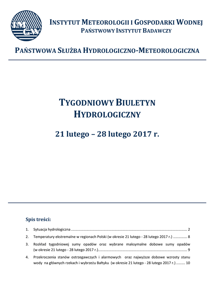 INSTYTUT METEOROLOGII I GOSPODARKI WODNEJ PAŃSTWOWY INSTYTUT BADAWCZY PAŃSTWOWA SŁUŻBA HYDROLOGICZNO-METEOROLOGICZNA TYGODNIOWY BIULETYN HYDROLOGICZNY 21 lutego – 28 lutego 2017 r. Spis treści: 1. Sytuacja hydrologiczna .................................................................................................................... 2 2. Temperatury ekstremalne w regionach Polski (w okresie 21 lutego - 28 lutego 2017 r.) .............. 8 3. Rozkład tygodniowej sumy opadów oraz wybrane maksymalne dobowe sumy opadów (w okresie 21 lutego - 28 lutego 2017 r.)......................................................................................... 9 4. Przekroczenia stanów ostrzegawczych i alarmowych oraz najwyższe dobowe wzrosty stanu wody na głównych rzekach i wybrzeżu Bałtyku (w okresie 21 lutego - 28 lutego 2017 r.) ......... 10 INSTYTUT METEOROLOGII I GOSPODARKI WODNEJ – PAŃSTWOWY INSTYTUT BADAWCZY PAŃSTWOWA SŁUŻBA HYDROLOGICZNO-METEOROLOGICZNA Tygodniowy Biuletyn Hydrologiczny 1. Sytuacja hydrologiczna Dorzecze Wisły W ciągu opisywanego okresu obserwowano wahania temperatury powietrza. W dniach 2224 II oraz 27-28 II była ona na ogół dodatnia, zarówno w dzień jak i w nocy. Najchłodniej było 25 i 26 II, temperatura powietrza była wtedy ujemna w nocy, zaś w dzień powyżej 0°C. Od 27 II nastąpiło znaczne ocieplenie. W dniach 21-23 II notowano opady deszczu (w górach także śniegu) na ogół o umiarkowanym, a punktowo silnym natężeniu. 24-25 II również obserwowano opady deszczu, ale o słabej intensywności bądź jedynie śladowe ich ilości. W dniach 26-27 II opadów atmosferycznych na ogół nie notowano. 28 II największą grubość pokrywy śnieżnej zmierzono w Tatrach (127 cm na Kasprowym Wierchu), a w Bieszczadach jej maksymalna wartość została zaobserwowana na stacji Żubracze (38 cm), w Beskidach w Rycerce Górnej (30 cm). W Górach Świętokrzyskich i na Wyżynie Lubelskiej śnieg nie jest już notowany. W zlewni Wisły od Dęblina po Tczew oraz Bugu poniżej Krzyczewa w omawianym okresie notowano wahania temperatury powietrza. W ciągu dnia obserwowano temperatury na ogół dodatnie, w nocy temperatura okresowo spadała poniżej 0˚C. W drugiej połowie tygodnia nastąpiło stopniowe ocieplenie, maksymalna temperatura powietrza sięgała miejscami do ok. 15˚C. Minimalna dobowa temperatura powietrza wahała się w przedziale od ok. -4˚C do ok. 6˚C. W ciągu całego okresu obserwowano opady atmosferyczne (w postaci deszczu, śniegu i deszczu ze śniegiem), najwyższe dobowe sumy notowano 22 II – do około 22mm. Na skutek dodatnich temperatur oraz opadów deszczu trwało dalsze intensywne topnienie lokalnie występującej głównie w zlewni górnej Narwi pokrywy śnieżnej - w pierwszym dniu okresu jej grubość sięgała 8 cm w Hajnówce i Drahlach, 22 II notowano ją na ogół już tylko lokalnie w postaci płatów. Ponowne pojawienie się pokrywy śnieżnej odnotowano 26 II (do 4cm w Suwałkach) i punktowo 25 II. Na dzień 28 II pokrywy śnieżnej nie odnotowano. Na Wiśle po Dęblin w dniach 22-24 II notowano wzrost poziomu wody, początkowo w strefie stanów średnich, a następnie w dolnej części strefy stanów wysokich. 25 II kulminacja fali opadowo-roztopowej znajdowała się już poniżej ujścia Dunajca i tam obserwowano dalsze wzrosty, zaś powyżej ujścia Dunajca stany wody spadały na granicy strefy stanów średnich i wysokich. 26 II wzrosty poziomu wody obserwowano jeszcze na Wiśle od Sandomierza do Dęblina, a 27 II już tylko na odcinku Puławy Azoty – Dęblin. Na Wiśle powyżej wspomnianych wcześniej odcinków notowane były spadki poziomu wody na granicy strefy stanów średnich i wysokich. Na początku omawianego okresu (22-23 II) na dopływach Wisły po Dęblin, obserwowano wzrost poziomu wody na ogół na granicy strefy stanów średnich i wysokich, wywołany spływem topniejącej pokrywy śnieżnej i opadami deszczu. Przekroczone zostały liczne stany ostrzegawcze i alarmowe. 24 II stany wody zaczęły opadać, z wyjątkiem zlewni Nidy, Wisłoki, Sanu, Wisłoka, Kamiennej i Wieprza. Od 25 II do końca omawianego tygodnia na dopływach Wisły po Dęblin, notowano na ogół spadek poziomu wody na granicy strefy stanów średnich i wysokich oraz w górnej części strefy stanów średnich. Lokalnie poziom wody zakłócany był pracą urządzeń hydrotechnicznych, początkowo także jeszcze występującymi zjawiskami lodowymi na rzekach. Na Osławie w Zagórzu do 24 II poziom 2 INSTYTUT METEOROLOGII I GOSPODARKI WODNEJ – PAŃSTWOWY INSTYTUT BADAWCZY PAŃSTWOWA SŁUŻBA HYDROLOGICZNO-METEOROLOGICZNA Tygodniowy Biuletyn Hydrologiczny wody utrzymywał się powyżej stanu ostrzegawczego, ze względu na ustępujący zator lodowy. Na Wiśle od profilu Dęblin do profilu Tczew obserwowano wzrosty stanu wody, związane ze spływem wody opadowo-roztopowej z górnej części zlewni. Poziom wody układał się początkowo w strefie wody średniej, lokalnie w rejonie Warszawy w strefie wody niskiej, a pod koniec okresu głównie w strefie wody wysokiej. 28 II w rejonie Wyszogrodu zanotowano przekroczenie stanu ostrzegawczego. Na dopływach Wisły od profilu Dęblin do profilu Tczew (wraz ze zlewnią Bugu) obserwowano: w pierwszej połowie omawianego okresu głównie wzrosty poziomu, spowodowane spływem wód opadowo roztopowych, w drugiej stabilizację i lokalne wahania związane z przemieszczaniem wody w zlewniach, pracą urządzeń hydrotechnicznych oraz miejscami z zaburzeniami przepływu związanymi z występującymi lokalnie zjawiskami lodowymi. Stan wody układał się w strefie wody wysokiej i średniej. Na większości dopływów Środkowej Wisły oraz w zlewni Bugu, Wkry i Drwęcy zostały przekroczone stany ostrzegawcze, a punktowo w zlewni Pilicy, Bugu i Wkry notowano przekroczenia stanów alarmowych. Na Narwi oraz na Biebrzy w ciągu całego okresu obserwowano wzrosty poziomu wody do dolnej strefy wody