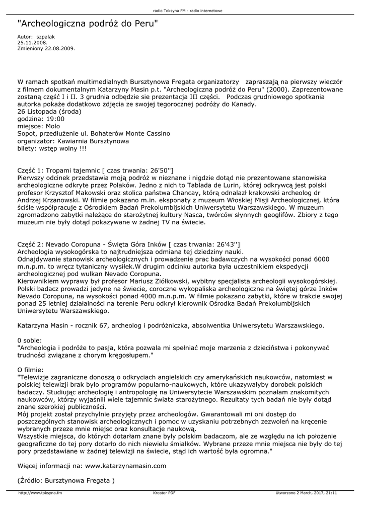 radio Toksyna FM - radio internetowe "Archeologiczna podróż do Peru" Autor: szpalak 25.11.2008. Zmieniony 22.08.2009. W ramach spotkań multimedialnych Bursztynowa Fregata organizatorzy zapraszają na pierwszy wieczór z filmem dokumentalnym Katarzyny Masin p.t. "Archeologiczna podróż do Peru" (2000). Zaprezentowane zostaną część I i II. 3 grudnia odbędzie sie prezentacja III części. Podczas grudniowego spotkania autorka pokaże dodatkowo zdjęcia ze swojej tegorocznej podróży do Kanady. 26 Listopada (środa) godzina: 19:00 miejsce: Molo Sopot, przedłużenie ul. Bohaterów Monte Cassino organizator: Kawiarnia Bursztynowa bilety: wstęp wolny !!! Część 1: Tropami tajemnic [ czas trwania: 26'50''] Pierwszy odcinek przedstawia moją podróż w nieznane i nigdzie dotąd nie prezentowane stanowiska archeologiczne odkryte przez Polaków. Jedno z nich to Tablada de Lurin, której odkrywcą jest polski profesor Krzysztof Makowski oraz stolica państwa Chancay, którą odnalazł krakowski archeolog dr Andrzej Krzanowski. W filmie pokazano m.in. eksponaty z muzeum Włoskiej Misji Archeologicznej, która ściśle współpracuje z Ośrodkiem Badań Prekolumbijskich Uniwersytetu Warszawskiego. W muzeum zgromadzono zabytki należące do starożytnej kultury Nasca, twórców słynnych geoglifów. Zbiory z tego muzeum nie były dotąd pokazywane w żadnej TV na świecie. Część 2: Nevado Coropuna - Święta Góra Inków [ czas trwania: 26'43''] Archeologia wysokogórska to najtrudniejsza odmiana tej dziedziny nauki. Odnajdywanie stanowisk archeologicznych i prowadzenie prac badawczych na wysokości ponad 6000 m.n.p.m. to wręcz tytaniczny wysiłek.W drugim odcinku autorka była uczestnikiem ekspedycji archeologicznej pod wulkan Nevado Coropuna. Kierownikiem wyprawy był profesor Mariusz Ziółkowski, wybitny specjalista archeologii wysokogórskiej. Polski badacz prowadzi jedyne na świecie, coroczne wykopaliska archeologiczne na świętej górze Inków Nevado Coropuna, na wysokości ponad 4000 m.n.p.m. W filmie pokazano zabytki, które w trakcie swojej ponad 25 letniej działalności na terenie Peru odkrył kierownik Ośrodka Badań Prekolumbijskich Uniwersytetu Warszawskiego. Katarzyna Masin - rocznik 67, archeolog i podróżniczka, absolwentka Uniwersytetu Warszawskiego. 0 sobie: "Archeologia i podróże to pasja, która pozwala mi spełniać moje marzenia z dzieciństwa i pokonywać trudności związane z chorym kręgosłupem." O filmie: "Telewizje zagraniczne donoszą o odkryciach angielskich czy amerykańskich naukowców, natomiast w polskiej telewizji brak było programów popularno-naukowych, które ukazywałyby dorobek polskich badaczy. Studiując archeologię i antropologię na Uniwersytecie Warszawskim poznałam znakomitych naukowców, którzy wyjaśnili wiele tajemnic świata starożytnego. Rezultaty tych badań nie były dotąd znane szerokiej publiczności. Mój projekt został przychylnie przyjęty przez archeologów. Gwarantowali mi oni dostęp do poszczególnych stanowisk archeologicznych i pomoc w uzyskaniu potrzebnych zezwoleń na kręcenie wybranych przeze mnie miejsc oraz konsultacje naukową. Wszystkie miejsca, do których dotarłam znane byly polskim badaczom, ale ze względu na ich położenie geograficzne do tej pory dotarło do nich niewielu śmiałków. Wybrane przeze mnie miejsca nie były do tej pory przedstawiane w żadnej telewizji na świecie, stąd ich wartość była ogromna." Więcej informacji na: www.katarzynamasin.com (Źródło: Bursztynowa Fregata ) http://www.toksyna.fm Kreator PDF Utworzono 2 March, 2017, 21:11