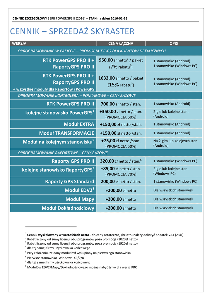 CENNIK SZCZEGÓŁOWY SERII POWERGPS II (2016) – STAN na dzień 2016-01-26 CENNIK – SPRZEDAŻ SKYRASTER WERSJA CENA ŁĄCZNA OPIS OPROGRAMOWANIE W PAKIECIE – PROMOCJA TYLKO DLA KLIENTÓW DETALICZNYCH RTK PowerGPS PRO II + 950,00 zł netto1 / pakiet (7% rabatu2) RaportyGPS PRO II 1 stanowisko (Android) 1 stanowisko (Windows PC) RTK PowerGPS PRO II + 1632,00 zł netto / pakiet RaportyGPS PRO II (15% rabatu3) 1 stanowisko (Android) 1 stanowisko (Windows PC) + wszystkie moduły dla Raportów i PowerGPS OPROGRAMOWANIE KONTROLERA – POMIAROWE – CENY BAZOWE RTK PowerGPS PRO II 700,00 zł netto / stan. kolejne stanowisko PowerGPS4 +350,00 zł netto / stan. 1 stanowisko (Android) (PROMOCJA 50%) 2-gie lub kolejne stan. (Android) Moduł EXTRA +150,00 zł netto /stan. 1 stanowisko (Android) Moduł TRANSFORMACJE +150,00 zł netto /stan. 1 stanowisko (Android) Moduł na kolejnym stanowisku5 +75,00 zł netto /stan. (PROMOCJA 50%) Na 2-gim lub kolejnych stan. (Android) OPROGRAMOWANIE RAPORTOWE – CENY BAZOWE Raporty GPS PRO II 320,00 zł netto / stan.6 1 stanowisko (Windows PC) kolejne stanowisko RaportyGPS7 +85,00 zł netto / stan. 2-gie lub kolejne stan. (Windows PC) (PROMOCJA 70%) Raporty GPS Standard 1 200,00 zł netto / stan. 1 stanowisko (Windows PC) Moduł EDV28 +200,00 zł netto Dla wszystkich stanowisk Moduł Mapy +200,00 zł netto Dla wszystkich stanowisk Moduł Dokładnościowy +200,00 zł netto Dla wszystkich stanowisk Cennik wyskalowany w wartościach netto - do ceny ostatecznej (brutto) należy doliczyć podatek VAT (23%) Rabat liczony od sumy licencji obu programów poza promocją (1020zł netto) 3 Rabat liczony od sumy licencji obu programów poza promocją (1920zł netto) 4 dla tej samej firmy użytkownika końcowego 5 Przy założeniu, że dany moduł był wykupiony na pierwszego stanowiska 6 Pierwsze stanowisko Windows XP/7/8 7 dla tej samej firmy użytkownika końcowego 8 Modułów EDV2/Mapy/Dokładnościowego można nabyć tylko dla wersji PRO 2 CENNIK SZCZEGÓŁOWY SERII POWERGPS II (2016) – STAN na dzień 2016-01-26 SPECYFIKACJA SPRZEDAŻY I DYSTRYBUCJI W zakresie sprzedaży (obejmującej zarówno przypadki sprzedaży SkyRaster oraz sprzedaży dystrybucyjnej): CENA LICENCJI OBEJMUJE 1. Udzielenie BEZTERMINOWEJ licencji, na jedno lub więcej stanowisk (zależnie od zamówienia) w postaci JAKA-JEST. 2. Pomoc w zakresie podstawowym (max. kilka roboczogodzin9), obejmującym kontakt mailowy lub telefoniczny (w zależności od potrzeb) lub rozwiązanie spraw dotyczących przepisywania licencji czy analizy sugestii i propozycji zmian. 3. Możliwość bezpłatnego przepisania licencji na nowe urządzenie (stanowisko) w przypadku uszkodzenia/zmiany na inny model sprzętu10. 4. Bezpłatny dostęp do materiałów szkoleniowych oraz informacyjnych poprzez stworzone blogi serwisowe oraz instrukcje oprogramowania (jeśli dotyczy). 5. Udostępnienie możliwości założenia i skorzystania z konta w serwisie RTK24.net dla użytkownika przez 1 rok z gwarancją bez opłat. 6. Bezpłatną aktualizację w ramach konkretnego modułu lub serii oprogramowania (w przypadku PowerGPS uprawnienia do gwarantowanej bezpłatnej aktualizacji dotyczą okresu 1 roku od zakupu) 7. Bezpłatne dostarczenie materiałów graficznych oraz możliwość bezpłatnego wykorzystania materiałów graficznych dostępnych na stronach projektów (związanych z promocją programu) – opcje skierowane głównie do Dystrybutorów. 9 CENA LICENCJI NIE OBEJMUJE 1. Gwarantowanej dostępności obsługi serwisowej – bez dodatkowego płatnego pakietu serwisowego nie jesteśmy w stanie zagwarantować odpowiedzi i zakładanej reakcji (np. wdrożenie zmiany lub poprawki) w określonym czasie. 2. Bezpłatnego dostosowania i doboru zestawów sprzętu użytkownika – jeśli użytkownik zamierza wykorzystać sprzęt spoza listy oficjalnie wspieranego sprzętu lub oczekuje większego wsparcia w zakresie zapewnienia poprawnego funkcjonowania konkretnego zestawu sprzętu (np. dobranie odpowiednich uchwytów lub akumulatorów lub działania w zakresie określonej wersji systemu operacyjnego) – sugerujemy płatny pakiet serwisowy lub zamówienie odpowiednio większej ilości licencji 3. Zapewnienia określonej częstotliwości aktualizacji – jeśli użytkownikowi zależy na częstych aktualizacjach lub zmianach dostosowanych pod użytkownika – sugerujemy płatny pakiet serwisowy. 4. Gwarancji door-to-door lub innych gwarancji, rozszerzających domyślną licencję „JAKA-JEST” – tego typu gwarancje są możliwe tylko w zakresie płatnych pakietów serwisowych. 5. Gwarancji ciągłości sprzedaży – umowy w zakresie ciągłości sprzedaży i dostarczania licencji są możliwe tylko w zakresie odpłatnych umów serwisowych. uwzględniając czas rozmów telefonicznych / czas przygotowania (analizy) i prowadzenia korespondencji mailowej w przypadku zmiany, nie częściej niż raz na pół roku w przypadku licencji OFFLINE lub raz na tydzień w przypadku licencji ONLINE (wymagającej internetu w wersji komercyjnej do autoryzacji) 10 CENNIK SZCZEGÓŁOWY SERII POWERGPS II (2016) – STAN na dzień 2016-01-26 PRIORYTETY OBSŁUGI SERWISOWEJ KLIENTÓW I DYSTRYBUTORÓW 1. Klienci oraz Dystrybutorzy, którzy posiadają aktywne płatne pakiety serwisowe. 2. Dystrybutorzy bez wykupionych płatnych pakietów serwisowych. 3. Klienci posiadający oba typy programów (PowerGPS i RaportyGPS) i większą ilość licencji, bez płatnych pakietów serwisowych. 4. Klienci posiadający pojedyncze programy z wszystkimi modułami, bez płatnych pakietów serwisowych 5. Klienci posiadający pojedyncze licencje lub pojedyncze programy bez modułów, bez płatnych pakietów serwisowych. PŁATNE PAKIETY ORAZ INNE USŁUGI SERWISOWE OKRESOWE PAKIETY LUB UMOWY SERWISOWE 1. Klient lub Dystrybutor, który potrzebuje dostosowanej do siebie (lub swoich klientów), gwarantowanej opieki serwisowej może zamówić odpłatny pakiet serwisowy, którego warunki 