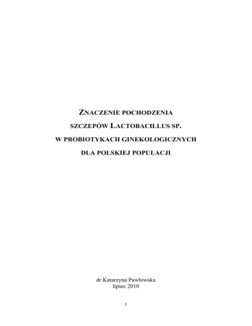 ZNACZENIE POCHODZENIA SZCZEPÓW LACTOBACILLUS SP. W PROBIOTYKACH GINEKOLOGICZNYCH DLA POLSKIEJ POPULACJI dr Katarzyna Pawłowska lipiec 2010 1 Biocenoza pochwy to złożona populacja drobnoustrojów zasiedlająca nabłonek pochwy w postaci biofilmu. Jej skład gatunkowy, struktura, jak i dynamika zmian w obrębie populacji mają podstawowe znaczenie dla utrzymania zdrowia i czynności narządów rodnych kobiety. Najistotniejszym składnikiem mikroflory pochwy są Gram-dodatnie pałeczki kwasu mlekowego Lactobacillus, zwane też pałeczkami Doderleina. Pozostają one w równowadze z innymi bakteriami (ponad 100 innych gatunków wykrytych w pochwie), z których najczęściej spotykane drobnoustroje należą do rodzajów: Staphylococcus, Corynebacterium, Prevotella, Streptococcus, Enterococcus, Peptostreptococcus, Bacteroides, Porphyromonas, Gardenella, Ureaplasma, Mycoplasma, Propionibacterium, Escherichia, Klebsiella, Mobiluncus, Veillonella, Clostridium itd. [Kasprowicz i Białecka 2008, Kotarski i in. 2008, Drews 2009]. Pałeczki Lactobacillus stanowią ochronę nabłonka pochwy przed kolonizacją bakterii chorobotwórczych. Posiadają zdolność rozkładania glikogenu do kwasu mlekowego. Ten dominujący metabolit procesu fermentacji zakwasza środowisko pochwy (pH <4,5), utrudniając tym samym namnażanie patogenów, mogących powodować zakażenia wstępujące narządu rodnego. Innym metabolitem pałeczek kwasu mlekowego są inhibitory proteaz hamujące m.in. rozwój inwazyjnych wypustek nitkowatych oraz wegetatywnych pseudostrzępek Candida albicans [Strus i in. 2005]. Część gatunków Lactobacillus produkuje nadtlenek wodoru, który uniemożliwia rozwój organizmów pozbawionych katalazy i peroksydazy. Wykazano również, bakteriostatyczne działanie in vitro produkowanych przez Lactobacillus bakteriocyn, np. laktocydyny, acidofiliny, deaminazy argininowej, biosurfaktantu i cytokin przeciwzapalnych [Peterek 1999]. Ponadto, poprzez swoją obecność w pochwie i tworzenie tam złożonych koagregatów bakteryjnych, pałeczki Doderleina blokują miejsca przylegania do komórek nabłonkowych drobnoustrojom patogennym [Kasprowicz i Białecka 2008]. Zatem, bakterie rodzaju Lactobacillus pełnią nie tylko funkcję konkurenta w kolonizacji (konkurencja o receptory na komórkach nabłonka pochwy oraz o składniki pokarmowe), ale również aktywnie redukują ilość drobnoustrojów patogennych w pochwie. Bakterie kwasu mlekowego stanowią ponad 95% mikroorganizmów obecnych w biocenozie pochwy zdrowych kobiet zamieszkujących kontynent Europy i Ameryki [Hillier i Arko 1996]. Natomiast w środowisku pochwy Afrykanek obserwuje się znacznie niższą liczebność pałeczek Doderleina w porównaniu z mieszkankami Europy (poniżej 50%) [Mason i in. 1983]. Jeszcze 30 lat temu uważano, że mikroflora pochwy zdominowana jest 2 tylko przez jeden gatunek pałeczek kwasu mlekowego: Lactobacillus acidophilus. Jednakże, rozwój nowoczesnych metod molekularnych umożliwił uporządkowanie klasyfikacji większości bakterii hodowlanych, dzięki czemu okazało się, że gatunek Lactobacillus acidophilus nie jest jednorodny i stanowi kompleks kilku innych gatunków, takich jak L. crispatus, L. amylovorus, L. gallinarum, L. acidophilus, L. gasseri, L. johnsonii [Johnson i in. 1980]. Dalsze badania innych ośrodków badawczych pozwoliły sklasyfikować również do tego kompleksu gatunki: L. amylolyticus, L. iners, L. jensenii oraz L. fermentum, L. plantarum [Schleifer i Ludwig 1995, Du Plessis i Dicks 1995, Falsen i in. 1999, Strus i in. 2005]. Rodzaj Lactobacillus posiada ponad 120 gatunków tych pałeczek, z których około 20 bytuje w dolnym odcinku dróg rodnych. Mikrobiolodzy obserwują dużą zmienność ilościową i jakościową flory pochwy [Niemiec 2009]. Już 20 lat temu Redondo-Lopez i in. [1990] postulowali, że nie ma dwóch kobiet z współistniejącymi, dwoma takimi samymi gatunkami Lactobacillus. Jednakże, analizując biocenozy pochwy kobiet zamieszkujących różne regiony kuli ziemskiej, obserwuje się, że dany region zamieszkują kobiety o podobnych ekosystemach. W Tabeli 1 zestawiono skład jakościowy biocenozy pochwy kobiet z różnych regionów świata. Autorzy polskich prac badawczych wskazują na przewagę w mikroflorze pochwy Polek takich gatunków Lactobacillus jak: L. acidophilus (35%), L. fermentum (30%), L. plantarum (30%). Natomiast pozostałe gatunki, to jest L. delbrueckii i L. rhamnosus stanowią tylko 5% całej biocenozy [Strus i Malinowska 1999, Strus 2005, Niemiec 2009], Nalewczyńska i in. [2009] wspomina również o obecności w tym środowisku małych ilości pałeczek L. casei. Przedstawione powyżej dane różnią się nieco od obrazów flory pochwy opisanych przez autorów prac zagranicznych, jednakże wynika to prawdopodobnie z faktu, że badali oni lokalne populacje, a różnice mogą być efektem innego trybu życia polskich kobiet oraz ich nawyków żywieniowych (diety) i higienicznych. Dla przykładu, ekosystem pochwy zdrowych Szwedek w 78% jest zdominowany przez jeden gatunek pałeczek kwasu mlekowego. Najczęściej występują u nich gatunki: L. crispatus, L. gasseri, L. iners oraz L. jensenii [Vasquez i in. 2002]. W Ameryce Południowej pałeczka Lactobacillus crispatus jest najczęściej również jako jedyna izolowana z mikroflory pochwy [Martinez i in. 2008]. Natomiast dużą różnorodnością charakteryzuje się ekosystem pochwy kobiet zamieszkujących Stany Zjednoczone. W skład ich prawidłowej mikroflory bakteryjnej wchodzą głównie Lactobacillus, takie jak: L. crispatus (32 %), L. jensenii (23 %), L. iners (15 %), L. gasseri (5 %), L. fermentum (0,3 %), L. oris (0,3 %), L. reuteri (0,3 %), L. ruminis (0,3 %) i L. vaginalis (0,3 %) [Antonio i in. 1999]. Po przeanalizowaniu składu 3 mikrobiologicznego pochwy azjatyckich kobiet, Garg i in. [2008] wykazali obecność kilku gatunków Lactobacillus: L. reuteri (32,5%), L. fermentum (25%) oraz L. s