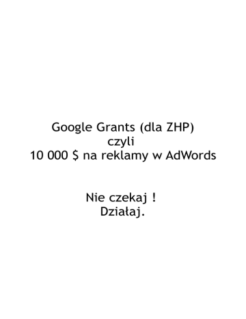 Google Grants (dla ZHP) czyli 10 000 $ na reklamy w AdWords Nie czekaj ! Działaj. Informacje o programie Uczestnicy programu Google Grants otrzymują bezpłatną reklamę w AdWords na Google.com. Tworzą własne konta AdWords i zarządzają nimi tak samo jak płacący reklamodawcy, ale dotyczą ich pewne ograniczenia: • • • • • • Mają budżet dzienny ustawiony na 330 USD, czyli ok. 10 000 USD miesięcznie. Mają limit maksymalnego kosztu kliknięcia (CPC) w wysokości 1 USD. Mogą prowadzić tylko kampanie kierowane na słowa kluczowe. Ich reklamy są wyświetlane tylko na stronie Google.com. Mogą korzystać tylko z reklam tekstowych. Reklamy są wyświetlane, dopóki organizacja aktywnie zarządza swoim kontem AdWords w programie Google Grants. • A czym jest AdWords ? Adwords to inaczej reklama w wyszukiwarce Google. Reklamy Adwords są wyświetlane u góry i po prawej stronie (a czasem na dole) wyników wyszukiwania. System ten jest oparty na modelu PPC, czyli płacimy za kliknięcia w reklamę. Największą zaleta tej formy reklamy jest to, że pojawia się ona dopiero gdy dana osoba czegoś szuka, tym sposobem reklamy docierają do osób zainteresowanych Twoją ofertą. Jest to odpowiedź na potrzebę. Reklama w wyszukiwarce po wpisaniu hasła: „jak wypełnić pit” Dlaczego dla ZHP ? Tego chyba nie trzeba wyjaśniać. Zbliża się kampania 1%. Promocja hufca (chorągwi) oraz różnego rodzaju imprez harcerskich oraz wiele więcej. Reklama strony strony ZHP po wpisaniu hasła składnica harcerska: Reklama strony strony ZHP po wpisaniu hasła zuchy: Przykładów wykorzystania reklam AdWords jest jeszcze więcej a ograniczenia to własna wyobraźnia i kryteria google grants. Google Grants dla ZHP jak to ugryźć ? Można wejść i zarejestrować się samemu jako chorągiew (brany pod uwagę jest numer KRS) poprzez stronę: http://www.google.com/intl/pl/grants/ Lub skontaktować się w Wydziałem Nowych Technologii GK ZHP z osobą odpowiedzialna za AdWords czyli Dariuszem Koryto ([email protected]), która udzieli wszystkich potrzebnych informacji lub w razie konieczności zarejestruję i stworzy dla was pierwszą kampanie reklamową, która jest wymagana do aktywacji konta. Posiadanie konta AdWords nie daje skutecznych efektów bez odpowiedniej wiedzy i szkoleniu. W przypadku zainteresowania szkoleniem z prowadzenia kampanii reklamowych AdWords dla większej grupy chętnych jest możliwości przeprowadzenie warsztatów w GK ZHP lub webinarium w internecie. Freshmail.pl to usługa pozwalająca na tworzenie profesjonalnych newsletterów w prosty i wygodny sposób. Teraz dostępna dla chorągwi bez żadnych opłat !! Freshmail to e-usługa polegająca na zapewnieniu kompleksowej obsługi działań e-mail marketingowych. System jest w pełni dostępny poprzez przeglądarkę internetową. Szyfrowane połączenie SSL oraz inne zabezpieczenia gwarantują pełne bezpieczeństwo gromadzonych danych i spełniają restrykcyjne wymagania Generalnego Inspektora Ochrony Danych Osobowych. Freshmail posiada wiele przydatnych funkcjonalności, które pozwalają w profesjonalny sposób zarządzać komunikacją e-mail marketingową. Aby przygotować kampanię do wysyłki wystarczy stworzyć treść – wgrać swój szablon, ściągnąć gotowy z sieci, wykorzystać któryś z biblioteki FreshMail lub po prostu skorzystać z prostego edytora. Następnie należy określić temat wiadomości, nadawcę i kilka innych parametrów, a na końcu – wskazać do kogo i kiedy ma wyjść dana kampania. Ponadto, FreshMail pozwala na wykorzystanie narzędzi zwiększających efektywność kampanii. Daje możliwość personalizacji (w tym odmiany imion), kontroli nad grafiką i rozbudowanego targetowania. Pozwala na przeprowadzenie próbnych kampanii, testów A/B i screentestów, zawiera moduł antyspamowy i wspiera działania w Social Media. Serwis nie pobiera żadnych opłat abonamentowych, użytkownik płaci tylko za wysłane kampanie. Narzędzie idealne do tworzenie newsletterów i wysyłaniu mailingu. Więcej info o systemie na stronie: http://freshmail.pl W przypadku pytań lub konta dla chorągwi kont z osobą odpowiedzlną: Dariusz Koryto – [email protected]