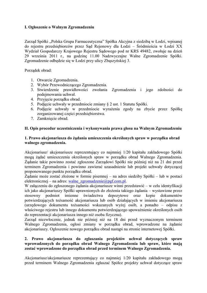 I. Ogłoszenie o Walnym Zgromadzeniu Zarząd Spółki „Polska Grupa Farmaceutyczna” Spółka Akcyjna z siedzibą w Łodzi, wpisanej do rejestru przedsiębiorców przez Sąd Rejonowy dla Łodzi – Śródmieścia w Łodzi XX Wydział Gospodarczy Krajowego Rejestru Sądowego pod nr KRS 49482, zwołuje na dzień 29 września 2011 r., na godzinę 11.00 Nadzwyczajne Walne Zgromadzenie Spółki. Zgromadzenie odbędzie się w Łodzi przy ulicy Zbąszyńskiej 3. Porządek obrad: 1. Otwarcie Zgromadzenia. 2. Wybór Przewodniczącego Zgromadzenia. 3. Stwierdzenie prawidłowości zwołania Zgromadzenia i jego zdolności do podejmowania uchwał. 4. Przyjęcie porządku obrad. 5. Podjęcie uchwały w przedmiocie zmiany § 2 ust. 1 Statutu Spółki. 6. Podjęcie uchwały w przedmiocie wyrażenia zgody na zbycie przez Spółkę zorganizowanej części przedsiębiorstwa. 7. Zamknięcie obrad. II. Opis procedur uczestniczenia i wykonywania prawa głosu na Walnym Zgromadzeniu 1. Prawo akcjonariusza do żądania umieszczenia określonych spraw w porządku obrad walnego zgromadzenia. Akcjonariusz/ akcjonariusze reprezentujący co najmniej 1/20 kapitału zakładowego Spółki mogą żądać umieszczenia określonych spraw w porządku obrad Walnego Zgromadzenia. Żądanie takie powinno zostać zgłoszone Zarządowi Spółki nie później niż na 21 dni przed terminem Zgromadzenia i powinno zawierać uzasadnienie lub projekt uchwały dotyczącej proponowanego punktu porządku obrad. Żądanie może zostać złożone w formie pisemnej – na adres siedziby Spółki – lub w postaci elektronicznej – na adres: [email protected]. W załączeniu do zgłoszonego żądania akcjonariusze winni przedstawić – w celu identyfikacji ich jako akcjonariuszy Spółki uprawnionych do złożenia takiego żądania – wystawione przez stosowny podmiot imienne świadectwa depozytowe oraz kopie dokumentów potwierdzających tożsamość akcjonariusza lub osób działających w imieniu akcjonariusza (urzędowego dokumentu tożsamości wskazanych wyżej osób, a ponadto – odpisu z właściwego rejestru lub innego dokumentu potwierdzającego upoważnienie określonych osób do reprezentacji akcjonariusza innego niż osoba fizyczna). Zarząd niezwłocznie, jednak nie później niż na 18 dni przed wyznaczonym terminem Walnego Zgromadzenia, ogłosi zmiany w porządku obrad, wprowadzone na żądanie akcjonariuszy. Ogłoszenie nowego porządku obrad nastąpi na stronie internetowej Spółki. 2. Prawo akcjonariusza do zgłaszania projektów uchwał dotyczących spraw wprowadzonych do porządku obrad Walnego Zgromadzenia lub spraw, które mają zostać wprowadzone do porządku obrad przed terminem Walnego Zgromadzenia. Akcjonariusz/akcjonariusze reprezentujący co najmniej 1/20 kapitału zakładowego mogą przed terminem Walnego Zgromadzenia zgłaszać Spółce projekty uchwał dotyczące spraw wprowadzonych do porządku obrad Walnego Zgromadzenia lub spraw, które mają zostać wprowadzone do porządku obrad. Zgłoszenie może zostać złożone w formie pisemnej – na adres siedziby Spółki – lub w postaci elektronicznej – na adres: [email protected] Zgłoszenie powinno zawierać uzasadnienie lub projekt uchwały dotyczącej proponowanego punktu porządku obrad. Akcjonariusze zgłaszający projekty uchwał, winni przedstawić – w celu identyfikacji ich jako akcjonariuszy Spółki uprawnionych do dokonania takiego zgłoszenia – wystawione przez stosowny podmiot imienne świadectwo depozytowe. Ponadto do zgłoszenia powinny zostać dołączone kopie dokumentów potwierdzających tożsamość akcjonariusza lub osób działających w imieniu akcjonariusza (urzędowego dokumentu tożsamości wskazanych wyżej osób, a ponadto – odpisu z właściwego rejestru lub innego dokumentu potwierdzającego upoważnienie określonych osób do reprezentacji akcjonariusza innego niż osoba fizyczna). Spółka niezwłocznie ogłasza powyższe projekty uchwał na swojej stronie internetowej. 3. Prawo akcjonariusza do zgłaszania projektów uchwał dotyczących spraw wprowadzonych do porządku obrad podczas Walnego Zgromadzenia. Każdy z akcjonariuszy może podczas Walnego Zgromadzenia zgłaszać projekty uchwał dotyczące spraw wprowadzonych do porządku obrad. 4. Prawo akcjonariusza do ustanowienia pełnomocnika oraz sposób wykonywania przez niego prawa głosu. Akcjonariusz może uczestniczyć w Walnym Zgromadzeniu oraz wykonywać prawo głosu osobiście lub przez pełnomocnika. Pełnomocnik wykonuje wszystkie uprawnienia akcjonariusza na Walnym Zgromadzeniu, chyba, że co innego wynika z treści pełnomocnictwa. Pełnomocnik jednolicie wykonuje prawa głosu z akcji danego akcjonariusza zapisanych na jednym lub wielu rachunkach papierów wartościowych, jeśli z pełnomocnictwa wyraźnie nie wynika co innego. W przypadku, gdy akcjonariusz ustanowił więcej niż jednego pełnomocnika, przyjmuje się, że pełnomocnicy ci wykonują prawa głosu działając łącznie, chyba, że co innego wyraźnie wynika z treści pełnomocnictw. Pełnomocnictwo powinno być udzielone w formie pisemnej lub elektronicznej. W przypadku udzielenia pełnomocnictwa w postaci elektronicznej, akcjonariusz obowiązany jest zawiadomić Spółkę o tym fakcie za pośrednictwem poczty elektronicznej na adres e-mail: [email protected], po wcześniejszym dostarczeniu Spółce pisemnej informacji o adresie poczty elektronicznej, z którego udzielone zostało pełnomocnictwo. Brak takiej pisemnej informacji oraz elektronicznego zawiadomienia o udzieleniu pełnomocnictwa w postaci elektronicznej, będzie przyczyną niedopuszczenia pełnomocnika do udziału w Walnym Zgromadzeniu. W celu identyfikacji akcjonariusza udzielającego pełnomocnictwa w formie elektronicznej, do pisemnego zawiadomienia o udzieleniu pełnomocnictwa oraz zawiadomienia o jego udzieleniu, przesłanego w formie elektronicznej, należy załączyć kopie dokumentów potwierdzających tożsamość