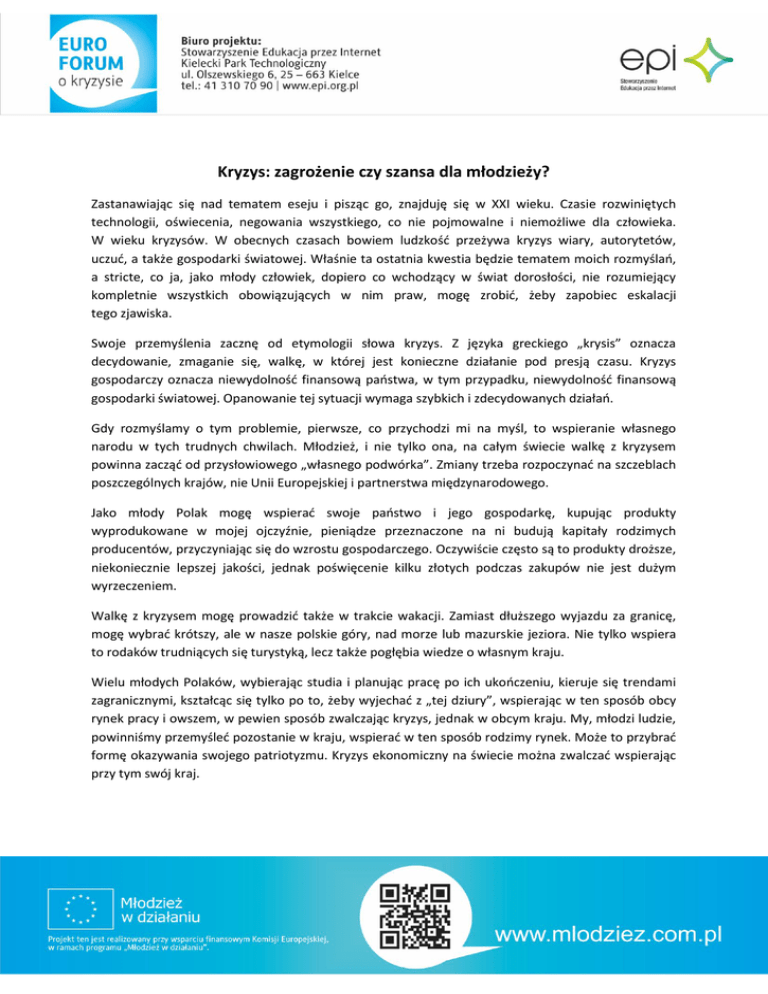 Kryzys: zagrożenie czy szansa dla młodzieży? Zastanawiając się nad tematem eseju i pisząc go, znajduję się w XXI wieku. Czasie rozwiniętych technologii, oświecenia, negowania wszystkiego, co nie pojmowalne i niemożliwe dla człowieka. W wieku kryzysów. W obecnych czasach bowiem ludzkość przeżywa kryzys wiary, autorytetów, uczuć, a także gospodarki światowej. Właśnie ta ostatnia kwestia będzie tematem moich rozmyślań, a stricte, co ja, jako młody człowiek, dopiero co wchodzący w świat dorosłości, nie rozumiejący kompletnie wszystkich obowiązujących w nim praw, mogę zrobić, żeby zapobiec eskalacji tego zjawiska. Swoje przemyślenia zacznę od etymologii słowa kryzys. Z języka greckiego „krysis” oznacza decydowanie, zmaganie się, walkę, w której jest konieczne działanie pod presją czasu. Kryzys gospodarczy oznacza niewydolność finansową państwa, w tym przypadku, niewydolność finansową gospodarki światowej. Opanowanie tej sytuacji wymaga szybkich i zdecydowanych działań. Gdy rozmyślamy o tym problemie, pierwsze, co przychodzi mi na myśl, to wspieranie własnego narodu w tych trudnych chwilach. Młodzież, i nie tylko ona, na całym świecie walkę z kryzysem powinna zacząć od przysłowiowego „własnego podwórka”. Zmiany trzeba rozpoczynać na szczeblach poszczególnych krajów, nie Unii Europejskiej i partnerstwa międzynarodowego. Jako młody Polak mogę wspierać swoje państwo i jego gospodarkę, kupując produkty wyprodukowane w mojej ojczyźnie, pieniądze przeznaczone na ni budują kapitały rodzimych producentów, przyczyniając się do wzrostu gospodarczego. Oczywiście często są to produkty droższe, niekoniecznie lepszej jakości, jednak poświęcenie kilku złotych podczas zakupów nie jest dużym wyrzeczeniem. Walkę z kryzysem mogę prowadzić także w trakcie wakacji. Zamiast dłuższego wyjazdu za granicę, mogę wybrać krótszy, ale w nasze polskie góry, nad morze lub mazurskie jeziora. Nie tylko wspiera to rodaków trudniących się turystyką, lecz także pogłębia wiedze o własnym kraju. Wielu młodych Polaków, wybierając studia i planując pracę po ich ukończeniu, kieruje się trendami zagranicznymi, kształcąc się tylko po to, żeby wyjechać z „tej dziury”, wspierając w ten sposób obcy rynek pracy i owszem, w pewien sposób zwalczając kryzys, jednak w obcym kraju. My, młodzi ludzie, powinniśmy przemyśleć pozostanie w kraju, wspierać w ten sposób rodzimy rynek. Może to przybrać formę okazywania swojego patriotyzmu. Kryzys ekonomiczny na świecie można zwalczać wspierając przy tym swój kraj. Dalej zacząłem myśleć o tym, co jest mi bliskie i dobrze znane, czyli o szkole i wiedzy, jaką z niej wynoszę. Także tutaj znalazłem inspirację do walki z kryzysem. W programie liceum znajdują się lekcje przedsiębiorczości. W swoich założeniach mają one wprowadzić uczniów do świata dorosłości, urzędów, oficjalnych pism, lecz u samych podstaw uczą oszczędności, gospodarowania kapitałem, pomnażania go. Pamiętając o tym, my, młodzi ludzie, powinniśmy wyuczyć się tej cechy jak najszybciej, gdyż nie tylko pomoże nam ona w życiu obecnym, ale i w przyszłości, a ponadto będzie zapobiegać pogłębianiu się kryzysu. Przecież główną przyczyną obecnego stanu gospodarczego są kredyty, masowo udzielane ludziom, przy pełnej świadomości tego, że nie będą oni w stanie ich spłacić. Działanie to idealnie przedstawiają słowa angielskiego ekonomisty, Johna Maynarda Keynesa: „Jeśli jesteś winien bankowi sto funtów, masz problem. Jeśli jesteś winien milion, to bank ma problem”. Oczywiście, jest w tym duża nieodpowiedzialność banków, lecz wina zawsze leży pośrodku. Należy zatem unikać sytuacji, w których musimy zaciągać nowe długi, aby spłacić stare. Następnymi zajęciami szkolnymi, które mnie zainspirowały, są lekcje historii, o których zredukowaniu w liceum niestety niedawno zdecydował rząd. Historia jest cennym źródłem informacji o zjawiskach dziejących się wokół nas, ponieważ większość z tych zjawisk miała już miejsce w przeszłości, co pozwala wyciągać z nich wnioski. Obecny kryzys gospodarczy nie jest pierwszym przypadkiem w historii świata. W przeszłości ludzkość przeżywała takie wydarzenia, jak Wielki Kryzys mający miejsce, według historyków, w latach 1929-1933. Spowodowany był między innymi I wojną światową, a także udzielaniem kredytów pod zastaw przewartościowanych akcji. Sytuacja była bardzo podobna do obecnej, a jej skutki spowodowały bankructwo wielu firm, gigantyczne zadłużenia, utratę pracy przez miliony ludzi i niestety, w rezultacie też falę samobójstw. Młodzież, jako przyszłość swoich narodów i przez to także świata, powinna pamiętać o tych wydarzeniach i nie popełniać w przyszłości tych samych błędów, ponieważ: „Historia się powtarza, ale za każdym razem więcej kosztuje” – są to słowa Halldora Laxness’a, laureata Literackiej Nagrody Nobla z 1955 r. Na szczęście sytuacja na świecie nie osiągnęła jeszcze punktu krytycznego, lecz stan gospodarczy krajów takich jak Grecja jest zapowiedzią tego, co może nastąpić, jeśli nie zostaną podjęte odpowiednie kroki, i przestrogą dla innych. Kolejnych inspiracji postanowiłem szukać przyglądając się życiu codziennemu w Polsce. Moją szczególną uwagę zwróciły liczne organizacje wspierane w dużej mierze przez młodzież, zaczynając od Wielkiej Orkiestry Świątecznej Pomocy, poprzez Polski Czerwony Krzyż, a kończąc na młodzieżówkach poszczególnych partii politycznych. Przyglądając się działaniom tych grup, nie oceniając ich słuszności, zobaczyłem ogromny potencjał zorganizowanych grup. Dzięki wspólnemu działaniu osiągają rzeczy nieosiągalne dla jednostek. Moim zdaniem skuteczną formą walki z kryzysem może być próba wpłynięcia na działania rząd