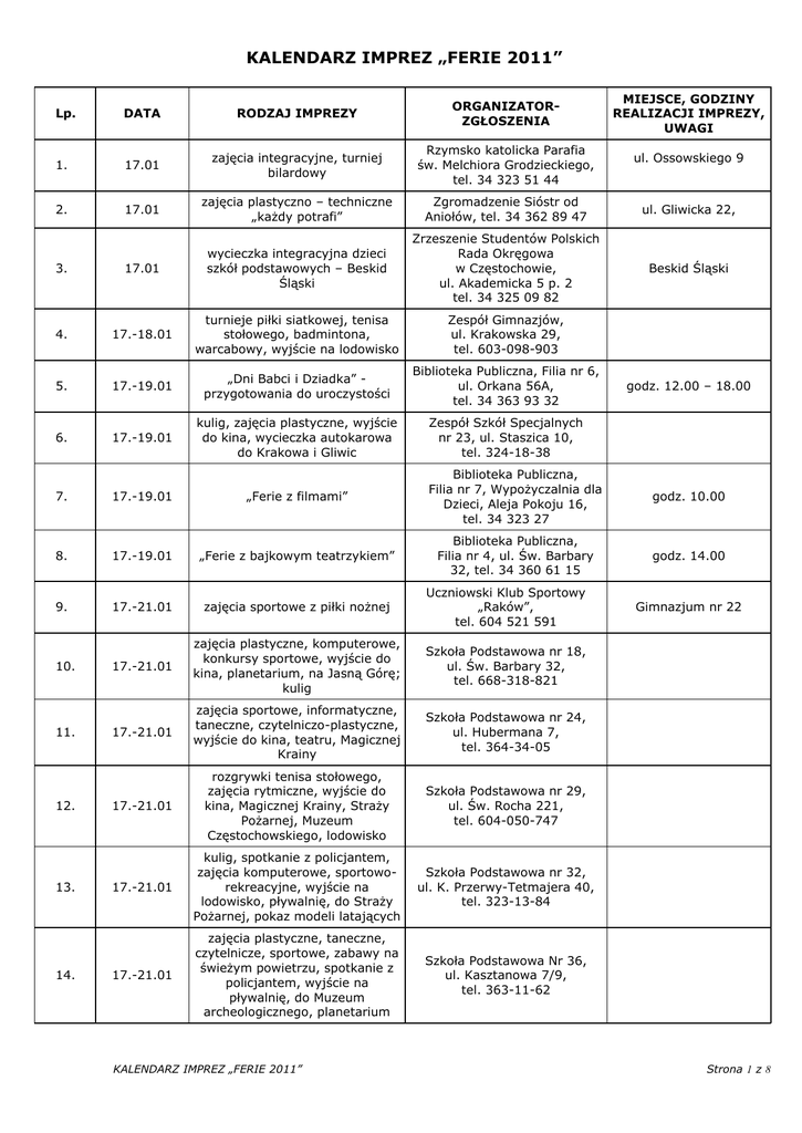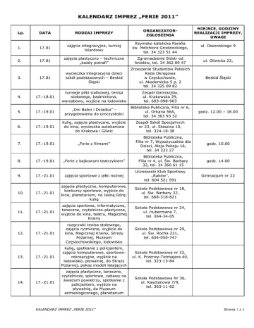KALENDARZ IMPREZ „FERIE 2011” MIEJSCE, GODZINY REALIZACJI IMPREZY, UWAGI Lp. DATA RODZAJ IMPREZY ORGANIZATORZGŁOSZENIA 1. 17.01 zajęcia integracyjne, turniej bilardowy Rzymsko katolicka Parafia św. Melchiora Grodzieckiego, tel. 34 323 51 44 2. 17.01 zajęcia plastyczno – techniczne „każdy potrafi” Zgromadzenie Sióstr od Aniołów, tel. 34 362 89 47 ul. Gliwicka 22, 3. 17.01 wycieczka integracyjna dzieci szkół podstawowych – Beskid Śląski Zrzeszenie Studentów Polskich Rada Okręgowa w Częstochowie, ul. Akademicka 5 p. 2 tel. 34 325 09 82 Beskid Śląski 4. 17.-18.01 turnieje piłki siatkowej, tenisa stołowego, badmintona, warcabowy, wyjście na lodowisko Zespół Gimnazjów, ul. Krakowska 29, tel. 603-098-903 5. 17.-19.01 „Dni Babci i Dziadka” przygotowania do uroczystości Biblioteka Publiczna, Filia nr 6, ul. Orkana 56A, tel. 34 363 93 32 6. 17.-19.01 kulig, zajęcia plastyczne, wyjście do kina, wycieczka autokarowa do Krakowa i Gliwic Zespół Szkół Specjalnych nr 23, ul. Staszica 10, tel. 324-18-38 7. 17.-19.01 „Ferie z filmami” Biblioteka Publiczna, Filia nr 7, Wypożyczalnia dla Dzieci, Aleja Pokoju 16, tel. 34 323 27 8. 17.-19.01 „Ferie z bajkowym teatrzykiem” Biblioteka Publiczna, Filia nr 4, ul. Św. Barbary 32, tel. 34 360 61 15 9. 17.-21.01 zajęcia sportowe z piłki nożnej Uczniowski Klub Sportowy „Raków”, tel. 604 521 591 17.-21.01 zajęcia plastyczne, komputerowe, konkursy sportowe, wyjście do kina, planetarium, na Jasną Górę; kulig Szkoła Podstawowa nr 18, ul. Św. Barbary 32, tel. 668-318-821 17.-21.01 zajęcia sportowe, informatyczne, taneczne, czytelniczo-plastyczne, wyjście do kina, teatru, Magicznej Krainy Szkoła Podstawowa nr 24, ul. Hubermana 7, tel. 364-34-05 17.-21.01 rozgrywki tenisa stołowego, zajęcia rytmiczne, wyjście do kina, Magicznej Krainy, Straży Pożarnej, Muzeum Częstochowskiego, lodowisko Szkoła Podstawowa nr 29, ul. Św. Rocha 221, tel. 604-050-747 17.-21.01 kulig, spotkanie z policjantem, zajęcia komputerowe, sportoworekreacyjne, wyjście na lodowisko, pływalnię, do Straży Pożarnej, pokaz modeli latających Szkoła Podstawowa nr 32, ul. K. Przerwy-Tetmajera 40, tel. 323-13-84 17.-21.01 zajęcia plastyczne, taneczne, czytelnicze, sportowe, zabawy na świeżym powietrzu, spotkanie z policjantem, wyjście na pływalnię, do Muzeum archeologicznego, planetarium Szkoła Podstawowa Nr 36, ul. Kasztanowa 7/9, tel. 363-11-62 10. 11. 12. 13. 14. KALENDARZ IMPREZ „FERIE 2011” ul. Ossowskiego 9 godz. 12.00 – 18.00 godz. 10.00 godz. 14.00 Gimnazjum nr 22 Strona 1 z 8 DATA RODZAJ IMPREZY ORGANIZATORZGŁOSZENIA 17.-21.01 gry i zabawy świetlicowe, sportowe, konkursy plastyczne, wyjście do planetarium, muzeum, kina, na pływalnię, parku Szkoła Podstawowa nr 37, ul. Wielkoborska 54, tel. 362-91-04 17.-21.01 gry i zabawy organizowane przez policję, konkurs rzeźby lodowej lub z plasteliny, wyjście na lodowisko, pływalnię, muzeum, wycieczka autokarowa do Jaskini Raj, Szkoła Podstawowa nr 38, ul. Sikorskiego 56, tel. 361-40-75 17. 17.-21.01 zajęcia rekreacyjne, plastyczne, muzyczne, wyjście na basen, lodowisko, muzeum, wycieczka krajoznawcza, spotkanie z policjantem, strażakiem, ratownikiem medycznym Szkoła Podstawowa nr 39, ul. Kopernika 79/87, tel. 324-23-70 18. 17.-21.01 kulig, wyjście na pływalnię, lodowisko, konkurs rzeźby lodowej, turniej tenisa stołowego Szkoła Podstawowa nr 46, ul. Szamotowa 8, tel. 324-73-39 19. 17.-21.01 turnieje piłki ręcznej, siatkowej, nożnej, tenisa stołowego Szkoła Podstawowa nr 50, ul. Starzyńskiego 10, tel. 362-31-66 20. 17.-21.01 turnieje tenisa stołowego, piłki nożnej, siatkowej, gry i zabawy sportowe Gimnazjum nr 18, ul. Orkana 95/109, tel. 660-447-602 17.-21.01 zajęcia kulinarne, plastyczne, wyjście do kina, na lodowisko, na Jasną gorę, do McDonald"s, do klubu fitness Specjalny Ośrodek SzkolnoWychowawczy nr 1, ul. Legionów 58, tel. 360-10-72 Lp. 15. 16. 21. 22. 23. 24. 25. 26. 17.-21.01 17.-21.01 17.-26.01 17.-28.01 17.-28.01 „Karaoke w Bibliotece” Warsztaty teatralne dla młodzieży, Warsztaty skierowane są do młodzieży w wieku 14 - 19 lat. „Łamigłówki mądrej główki” Biblioteka Publiczna, Filia Muzyczna, Aleja Niepodległości 41, tel. 34 363 39 37 Teatr im. A. Mickiewicza, ul. Kilińskiego 15, tel. 34 372 33 04 MIEJSCE, GODZINY REALIZACJI IMPREZY, UWAGI godz. 11.00 odpłatność od uczestnika: 200 zł Biblioteka Publiczna, Filia nr 8, ul. Księżycowa 2, tel. 34 361 43 27 zajęcia ogólnorozwojowe, pedagogika zabawy „klanza”, wycieczki bliższe i dalsze, zajęcia plastyczno-techniczne, muzyczne Dom Małych Dzieci im. E. Bojanowskiego, tel. 34 324 67 51 ul. Św. Kazimierza 1 łyżwiarski turniej niespodzianka Miejski Ośrodek Sportu i Rekreacji w Częstochowie, ul. Dekabrystów 43, tel. 34 372 07 83, [email protected] Ślizgawka Miejska pod C.H. M-1, godz. 12.00 KALENDARZ IMPREZ „FERIE 2011” Strona 2 z 8 Lp. 27. 28. DATA 17.-28.01 RODZAJ IMPREZY zajęcia sportowo-rekreacyjne dla grup zorganizowanych w Sali Sportowej „Częstochowianka” ORGANIZATORZGŁOSZENIA MIEJSCE, GODZINY REALIZACJI IMPREZY, UWAGI Miejski Ośrodek Sportu i Rekreacji w Częstochowie, ul. Dekabrystów 43, tel. 34 372 07 83, [email protected] Sala Sportowa „Częstochowianka”, ul. Rejtana 7c Brak ograniczeń wiekowych; podczas obowiązuje obuwie zmienne; udział w zajęciach w obecności opiekunów; organizator zapewnia sprzęt sportowy Pawilon Etnograficzny w Parku Staszica Muzeum Częstochowskie, Cena biletów: 25 zł (przy Aleja Najświętszej Maryi Panny zgłoszeniach 45, tel. 34 360 56 31 grupowych), 3 zł (indywidualnych) 17.-28.01 Karnawał na Kurpiach 29. 17.-28.01 turniej piłki nożnej, koszykówki, tenisa stołowego, konkursy z języka angielskiego i niemieckiego, warsztaty z arteterapii, wyjście do kina, na lodowisko Gimnazjum Nr 21, ul. Powstańców Warszawy 144a, tel. 366-12-75 30. 17.-28.01 wyjście do "Zygzaka", kina,