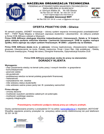 NACZELNA ORGANIZACJA TECHNICZNA FEDERACJA STOWARZYSZEŃ NAUKOWO-TECHNICZNYCH RADA MIEJSKA W GLIWICACH ul. Górnych Wałów 25, 44-100 Gliwice ISO 9001 tel./fax 032 231 59 58, tel. 032 231 33 57 e-mail:[email protected] Ośrodek Innowacji NOT ZETOM-CERT tel./fax 032 331 34 50 e-mail: [email protected] OFERTA PRAKTYKI OVB - Gliwice W ramach projektu „KIGNET Innowacje – izbowy system wsparcia innowacyjności przedsiębiorstw” NOT – FSNT Rada Miejska w Gliwicach zaprasza studentów i absolwentów do odbycia praktyki w firmie OVB Allfinanz oddział w Gliwicach. Firma OVB Allfinanz obsługuje klientów indywidualnych i biznesowych. Działa w 14 krajach, gdzie zdobyła zaufanie milionów klientów i partnerów biznesowych. OVB to szybko rosnąca spółka, która zajmuje się całym rynkiem finansowym. W 2006 r. pojawiła się na Giełdzie. Firma OVB Allfinanz działa m.in. w zakresie: Umowy lojalnościowe, Ubezpieczenie majątkowe i grupowe, Ubezpieczenie na życie, Pakiety medyczne, Drugi i trzeci filar, Ulgi podatkowe , Giełda, Fundusze inwestycyjne, Posagi dla dzieci, Dźwignie finansowe, Optymalizacja kosztów ZUS Firma OVB Allfinanz poszukuje osoby do pracy na stanowisko: DORADCY KLIENTA Wymagania: - chęć poszerzenia wiedzy na temat rynku pracy i nowych trendów w gospodarce - komunikatywność - pewność siebie - skrupulatność - podstawowa wiedza na temat polskiej gospodarki finansowej - niekaralność - wykształcenie min. średnie - mile widziany status studenta/tki - mile widziane ważne prawo jazdy kat. B i posiadany samochód Firma oferuje: - umowę zlecenie - możliwość wysokich zarobków zależnych od potencjału - możliwość szybkiego awansu - wyjazdy integracyjne Przewidujemy możliwość podjęcia dalszej pracy po odbyciu praktyki. Osoby zainteresowane prosimy o przesyłanie CV na adres: [email protected] z dopiskiem „NOT/OVB” Wszelkie zapytanie prosimy przesyłać na powyższy adres poczty elektronicznej lub pod telefonem 32 331 34 50