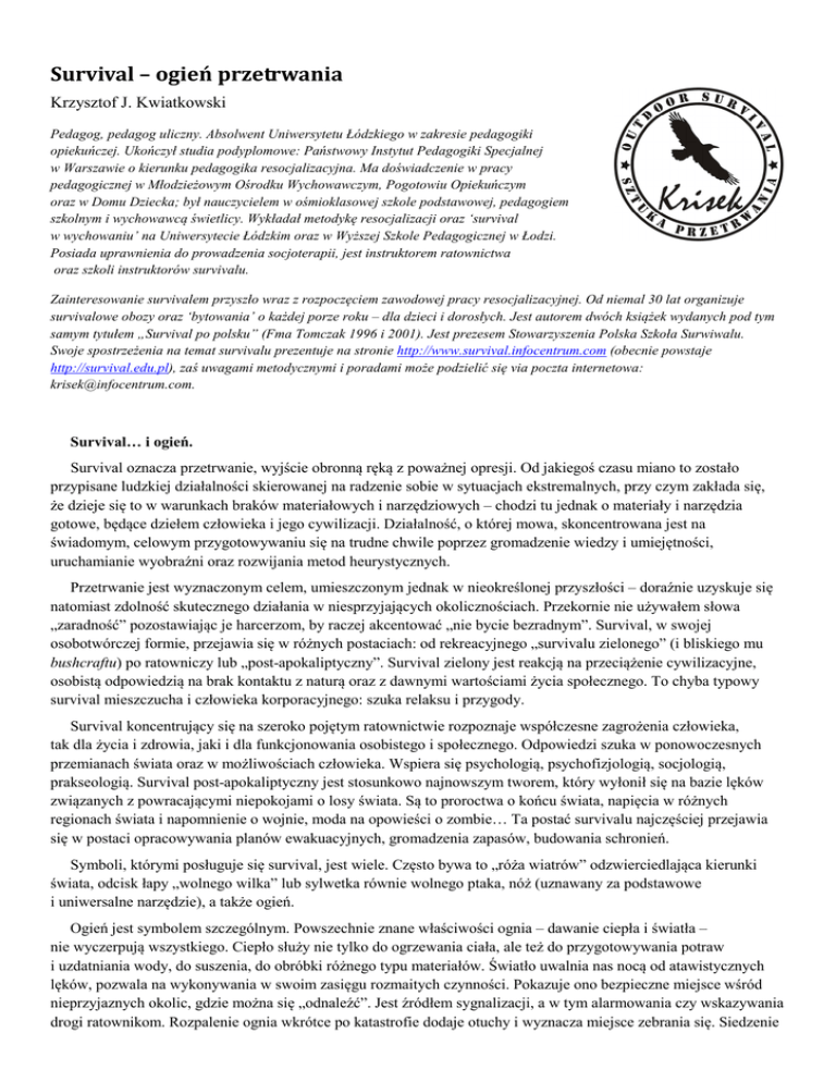 Survival – ogień przetrwania Krzysztof J. Kwiatkowski Pedagog, pedagog uliczny. Absolwent Uniwersytetu Łódzkiego w zakresie pedagogiki opiekuńczej. Ukończył studia podyplomowe: Państwowy Instytut Pedagogiki Specjalnej w Warszawie o kierunku pedagogika resocjalizacyjna. Ma doświadczenie w pracy pedagogicznej w Młodzieżowym Ośrodku Wychowawczym, Pogotowiu Opiekuńczym oraz w Domu Dziecka; był nauczycielem w ośmioklasowej szkole podstawowej, pedagogiem szkolnym i wychowawcą świetlicy. Wykładał metodykę resocjalizacji oraz ‘survival w wychowaniu’ na Uniwersytecie Łódzkim oraz w Wyższej Szkole Pedagogicznej w Łodzi. Posiada uprawnienia do prowadzenia socjoterapii, jest instruktorem ratownictwa oraz szkoli instruktorów survivalu. Zainteresowanie survivalem przyszło wraz z rozpoczęciem zawodowej pracy resocjalizacyjnej. Od niemal 30 lat organizuje survivalowe obozy oraz ‘bytowania’ o każdej porze roku – dla dzieci i dorosłych. Jest autorem dwóch książek wydanych pod tym samym tytułem „Survival po polsku” (Fma Tomczak 1996 i 2001). Jest prezesem Stowarzyszenia Polska Szkoła Surwiwalu. Swoje spostrzeżenia na temat survivalu prezentuje na stronie http://www.survival.infocentrum.com (obecnie powstaje http://survival.edu.pl), zaś uwagami metodycznymi i poradami może podzielić się via poczta internetowa: [email protected]. Survival… i ogień. Survival oznacza przetrwanie, wyjście obronną ręką z poważnej opresji. Od jakiegoś czasu miano to zostało przypisane ludzkiej działalności skierowanej na radzenie sobie w sytuacjach ekstremalnych, przy czym zakłada się, że dzieje się to w warunkach braków materiałowych i narzędziowych – chodzi tu jednak o materiały i narzędzia gotowe, będące dziełem człowieka i jego cywilizacji. Działalność, o której mowa, skoncentrowana jest na świadomym, celowym przygotowywaniu się na trudne chwile poprzez gromadzenie wiedzy i umiejętności, uruchamianie wyobraźni oraz rozwijania metod heurystycznych. Przetrwanie jest wyznaczonym celem, umieszczonym jednak w nieokreślonej przyszłości – doraźnie uzyskuje się natomiast zdolność skutecznego działania w niesprzyjających okolicznościach. Przekornie nie używałem słowa „zaradność” pozostawiając je harcerzom, by raczej akcentować „nie bycie bezradnym”. Survival, w swojej osobotwórczej formie, przejawia się w różnych postaciach: od rekreacyjnego „survivalu zielonego” (i bliskiego mu bushcraftu) po ratowniczy lub „post-apokaliptyczny”. Survival zielony jest reakcją na przeciążenie cywilizacyjne, osobistą odpowiedzią na brak kontaktu z naturą oraz z dawnymi wartościami życia społecznego. To chyba typowy survival mieszczucha i człowieka korporacyjnego: szuka relaksu i przygody. Survival koncentrujący się na szeroko pojętym ratownictwie rozpoznaje współczesne zagrożenia człowieka, tak dla życia i zdrowia, jaki i dla funkcjonowania osobistego i społecznego. Odpowiedzi szuka w ponowoczesnych przemianach świata oraz w możliwościach człowieka. Wspiera się psychologią, psychofizjologią, socjologią, prakseologią. Survival post-apokaliptyczny jest stosunkowo najnowszym tworem, który wyłonił się na bazie lęków związanych z powracającymi niepokojami o losy świata. Są to proroctwa o końcu świata, napięcia w różnych regionach świata i napomnienie o wojnie, moda na opowieści o zombie… Ta postać survivalu najczęściej przejawia się w postaci opracowywania planów ewakuacyjnych, gromadzenia zapasów, budowania schronień. Symboli, którymi posługuje się survival, jest wiele. Często bywa to „róża wiatrów” odzwierciedlająca kierunki świata, odcisk łapy „wolnego wilka” lub sylwetka równie wolnego ptaka, nóż (uznawany za podstawowe i uniwersalne narzędzie), a także ogień. Ogień jest symbolem szczególnym. Powszechnie znane właściwości ognia – dawanie ciepła i światła – nie wyczerpują wszystkiego. Ciepło służy nie tylko do ogrzewania ciała, ale też do przygotowywania potraw i uzdatniania wody, do suszenia, do obróbki różnego typu materiałów. Światło uwalnia nas nocą od atawistycznych lęków, pozwala na wykonywania w swoim zasięgu rozmaitych czynności. Pokazuje ono bezpieczne miejsce wśród nieprzyjaznych okolic, gdzie można się „odnaleźć”. Jest źródłem sygnalizacji, a w tym alarmowania czy wskazywania drogi ratownikom. Rozpalenie ognia wkrótce po katastrofie dodaje otuchy i wyznacza miejsce zebrania się. Siedzenie przy ognisku daje poczucie wspólnoty, sprzyja poważnym rozmowom, szalonym opowieściom lub rozwiązywaniu problemów. Nie bez powodów mówi się o ognisku rodzinnym czy o mirze domowego ogniska. Ogniskiem nazywano świetlice, domy dziecka i schroniska dla bezdomnych. Pojęcie „kaganka oświaty” również jest rozumiane… Ogień uważany jest przez animistów za żywą istotę. Coś w tym jest. Używamy zwrotów takich, jak „żar miłości”, „ogień duszy” lub „ogień serca”. Bo samo zjawisko życia przypomina palący się ogień. Procesy życiowe opierają się na spalaniu, a więc potrzebują materiału palnego, tlenu i temperatury. Rozpalanie ognia jest jednym z pierwszych wtajemniczeń w survivalu. Może nawet najważniejszym. Nie można ognia zadekretować – trzeba go rozpalić ludzkimi rękami. Nie da się go utrzymywać przez odwoływanie się do jego poczucia obowiązku i odpowiedzialności. Trzeba się nad nim pochylić i podawać drewniane szczapy. I robić to umiejętnie, by nie przydusić. Człowiek w survivalu Zajmowanie się survivalem może odbywać się na różnych płaszczyznach. Może to być proste wykonywanie czynności związanych z bytowaniem, zdobywaniem żywności, budowaniem schronienia czy rozpalaniem ognia. Na przeciwnym biegunie znajdować się będą złożone działania poznawcze i kształcące. Zazwyczaj – niezależnie od poziomu – towarzyszy temu samodzie