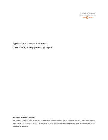 Creatio Fantastica PL ISSN: 2300-2514 nr 2 (53) 2016 Agnieszka Bukowczan-Rzeszut O umarłych, którzy podróżują szybko Recenzja naukowa książki: Bartłomiej Grzegorz Sala, W górach przeklętych. Wampiry Alp, Rudaw, Sudetów, Karpat i Bałkanów, Olszanica: BOSZ 2016, ISBN: 978-83-7576-286-0, ss. 232. Cytaty w tekście podawane będą w nawiasach za niniejszym wydaniem. Wyobrażenia upiorów, strzygoni czy wąpierzy od setek lat zajmowały wyjątkowe miejsce w kręgu demonologii słowiańskiej. Imponująca jest, jak podkreślał Jerzy Strzelczyk, zarówno wielkość, jak i żywotność motywów wampirycznych w ramach tej tradycji 1, stąd też nie można się dziwić, że pojawiła się na polskim rynku wydawniczym kolejna pozycja aspirująca do prześledzenia owych wątków. Pozycja, co warto zaznaczyć, ciekawa i wartościowa, autorstwa Bartłomieja Grzegorza Sali, zatytułowana W górach przeklętych. Wampiry Alp, Rudaw, Sudetów, Karpat i Bałkanów. Aleksander Brückner pisał, że wiara w upiory i wilkołaki „nie od Słowian wyszła, ale się od nich walnie rozeszła”, a językowy rodowód wampira wywodzi z Bałkanów2. I choć autor ten podkreśla, że lud polski nie znał wampirów, lecz strzygi, a Strzelczyk zaznacza, że na gruncie polskim pierwotna jest nazwa „wampir” (wcześniej „wąpierz” lub „wampierz”), bo „upiora” przejęto z Rusi, to sam zabobon słusznie badacze wywodzą z czasów przedchrześcijańskich. Postać wampira przeszła długą drogę: od antycznego demona, przez ludowe podania o zmarłych niepokojących na rozmaite sposoby żyjących krewnych, do udręczonego kochanka epoki romantyzmu z jej wiarą w świat nadprzyrodzony. Tą drogą starają się podążać za nim badacze, od dekad eksplorując wampiryczne manifestacje w różnych obszarach kultury. Większość współczesnych opracowań koncentruje się raczej na ujęciu z zakresu jednego obszaru badawczego – etnografii i folkloru ludowego – bądź podejmuje próbę prześledzenia chronologicznego występowania wątków w kulturze w oparciu o źródła historyczne. Na tym tle pozytywnie wyróżnia się monografia Marii Janion3. Jednak zasadniczym celem badawczym Bartłomieja Sali było poszukiwanie symbolicznych reprezentacji wampira w kulturze oraz analiza rozlicznych aspektów mitu wampirycznego. Niezwykle wyczerpujące opracowanie Petoi, z pogranicza historii, folklorystyki i religioznawstwa, 1 Jerzy Strzelczyk, Mity, podania i wierzenia dawnych Słowian, Poznań: Rebis 1998, s. 219. 2 Aleksander Brückner, Mitologja polska. Studjum porównawcze, Warszawa: Instytut Wydawniczy "Bibljoteka Polska" 1924, s. 82. 3 Maria Janion, Wampir. Biografia symboliczna, Gdańsk: Słowo/obraz/terytoria 2008. O umarłych, którzy podróżują szybko 3 nie jest z kolei poświęcone wyłącznie wampirom, lecz również wilkołakom4. Tymczasem autor omawianej książki śledzi wampiry jako etnograf, przewodnik i historyk, przy czym jego badania ograniczają się do konkretnego obszaru ich występowania, wyszczególnionego już w tytule. Janion określa mit wampira jednym „z najbardziej powszechnych i wiecznotrwałych”5 i trudno temu stwierdzeniu zaprzeczyć. Leonard Pełka i Bohdan Baranowski słusznie zaznaczają, że zjawisko wampiryzmu znajdowało szerokie odzwierciedlenie w literaturze zachodnioeuropejskiej XVIII wieku, choć, jak podkreśla ten drugi, traktowane było ono zgoła inaczej niż na obszarach słowiańskich6. Mimo że w epoce oświecenia wampir został pozornie wypędzony i zepchnięty na margines zabobonów, to wkrótce powrócił w pełnej chwale: już w początkach XIX wieku doczekał się całkowitej rehabilitacji, wprawdzie nie w wydaniu ludowym, lecz w literackiej oprawie romantyzmu. Należy zgodzić się z Janion, że współcześnie obserwowana powszechność wampirycznego mitu utrwaliła najbardziej uniwersalna ze sztuk, a mianowicie film. Do dziś powieść Brama Stokera doczekała się ponad stu siedemdziesięciu filmowych adaptacji, a postać Krwawej Hrabiny przenoszono na srebrny ekran ponad sto razy. Powstała również niemal setka seriali poświęconych wampirom, z czego około jedną trzecią stanowią animacje. Liczbę książek o tej tematyce można obecnie liczyć w dziesiątkach tysięcy, na czele z jedenastotomowym i wciąż kontynuowanym cyklem Kronik wampirów Anne Rice oraz z tetralogią Zmierzch autorstwa Stephenie Meyer. Obydwie serie powieściowe doczekały się zresztą ekranizacji. Niemniej jednak kultura popularna zna zaledwie kilka „kanonicznych” wampirów, z Drakulą, Nosferatu czy Elżbietą Batory na czele, podczas gdy inne, nieraz szczycące się równie bogatym życiorysem, zaginęły w mrokach ludowych legend. Autor recenzowanej pozycji próbuje przywrócić im należne miejsce. Maria Janion podkreśla, że opowieści wampiryczne tworzą alternatywną historię ludzkości z zupełnie odrębną wykładnią śmierci i zmartwychwstania, w której spotykają się elementy folkloru, kultury popularnej epoki wiktoriańskiej, popkultury ubiegłego stulecia i kultury wysokiej7. Sala swoją książką W górach przeklętych. Wampiry Alp, Rudaw, Erberto Petoia, Wampiry i wilkołaki. Źródła, historia, legendy od antyku do współczesności, przekł. A. Pers, Kraków: Universitas 2004. 5 Maria Janion, dz. cyt., s. 7. 6 Leonard J. Pełka, Polska demonologia ludowa, Warszawa: Iskry 1987, s. 163; Bohdan Baranowski, W kręgu upiorów i wilkołaków, Łódź: Wydawnictwo Łódzkie 1981, s. 51. 7 M. Janion, dz. cyt., s. 9. 4 4 Agnieszka Bukowczan-Rzeszut Sudetów, Karpat i Bałkanów przypomina o korzeniach wampiryzmu, które tkwią głęboko w folklorze i wierzeniach Słowian. To właśnie owe korzenie nasyciły wyobrażenia wampiryczne „bezgraniczną dzikością”8 – żeby posłużyć się określeniem Kazimierza Moszyńskiego. Sala przybliża wampira takim, jakim stworzyła go wyobraźnia ludowa, a o jakim współczesna popkultura zdaje si