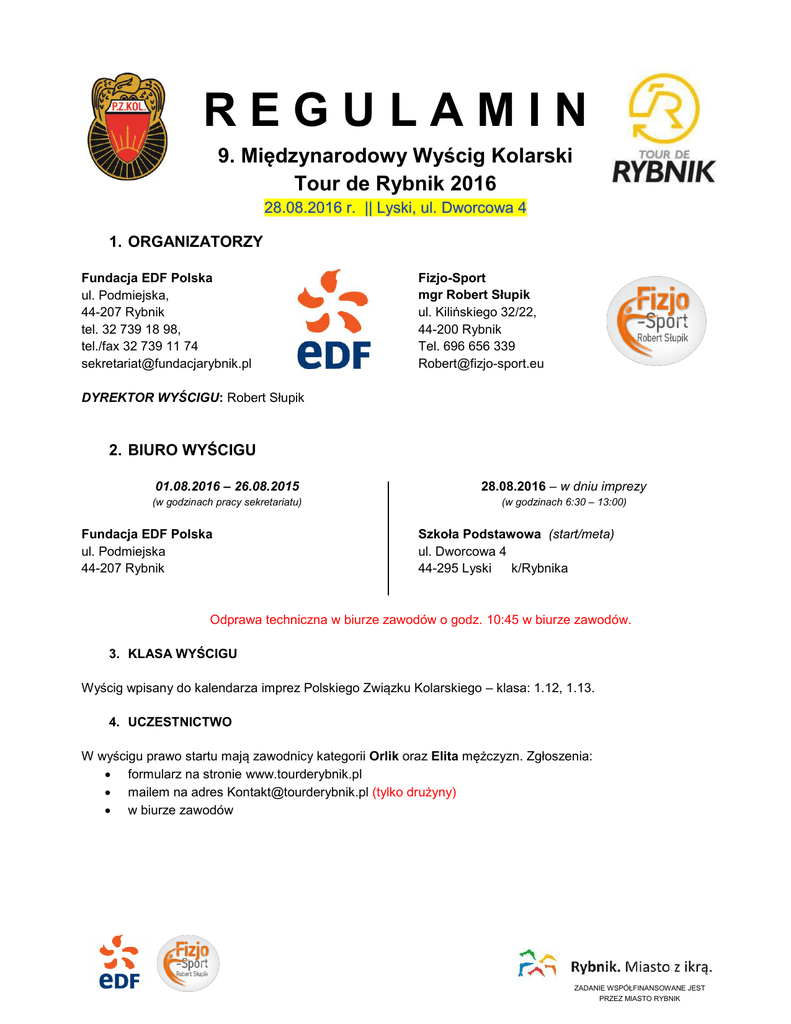 REGULAMIN 9. Międzynarodowy Wyścig Kolarski Tour de Rybnik 2016 28.08.2016 r. || Lyski, ul. Dworcowa 4 1. ORGANIZATORZY Fundacja EDF Polska ul. Podmiejska, 44-207 Rybnik tel. 32 739 18 98, tel./fax 32 739 11 74 [email protected] Fizjo-Sport mgr Robert Słupik ul. Kilińskiego 32/22, 44-200 Rybnik Tel. 696 656 339 [email protected] DYREKTOR WYŚCIGU: Robert Słupik 2. BIURO WYŚCIGU 01.08.2016 – 26.08.2015 28.08.2016 – w dniu imprezy (w godzinach pracy sekretariatu) (w godzinach 6:30 – 13:00) Fundacja EDF Polska ul. Podmiejska 44-207 Rybnik Szkoła Podstawowa (start/meta) ul. Dworcowa 4 44-295 Lyski k/Rybnika Odprawa techniczna w biurze zawodów o godz. 10:45 w biurze zawodów. 3. KLASA WYŚCIGU Wyścig wpisany do kalendarza imprez Polskiego Związku Kolarskiego – klasa: 1.12, 1.13. 4. UCZESTNICTWO W wyścigu prawo startu mają zawodnicy kategorii Orlik oraz Elita mężczyzn. Zgłoszenia: formularz na stronie www.tourderybnik.pl mailem na adres [email protected] (tylko drużyny) w biurze zawodów ZADANIE WSPÓŁFINANSOWANE JEST PRZEZ MIASTO RYBNIK ZADANIE WSPÓŁFINANSOWANE JEST PREZ MIASTO RYBNIK 5. RADIO WYŚCIGU Radio wyścigu zapewnia organizator wraz z partnerem technicznym. Radio będzie pracowało na zakodowanej częstotliwości. Partnerem technicznym jest firma RTcom 6. NEUTRALNA POMOC TECHNICZNA Wyścig zabezpieczał będzie 1 wóz neutralny MAVIC. 7. LIMIT CZASU Zgodnie z art. 2.3.039 Przepisów Sportowych limit czasu wynosi 8 % i zawodnicy poza tym limitem nie będą uwzględnieni w wynikach. W szczególnych okolicznościach limit czasu może być zwiększony przez Komisję Sędziowską w porozumieniu z organizatorem. 8. KLASYFIKACJE Klasyfikacja będzie prowadzona zgodnie z Przepisami Sportowymi PZKOL I UCI: Punktowa – lotne finisze na każdym okrążeniu (punktacja na premiach: 5, 3, 2, 1 pkt.) Orlik (U23) – wygrywa pierwszy zawodnik na linii mety Generalna (Elita + U23) – wygrywa pierwszy zawodnik na linii mety (na tzw. „kreskę”) 9. NAGRODY 1 2 3 Orlik 400 zł 300 zł 150 zł Punktowa 600 zł 400 zł 200 zł Generalna 3000 zł 2000 zł 1000 zł Podane kwoty są kwotami brutto w PLN. 4 5 6 7 8 9 10 750 zł 650 zł 550 zł 450 zł 350 zł 250 zł 150 zł Od sumy nagród powyżej 760 zł pobrana zostanie zaliczka na podatek w wysokości 10%. Nieobecność w ceremonii dekoracji będzie podstawą do niewypłacenia nagrody. Nagrody wypłacane są tylko w dniu zawodów. Pula nagród finansowych: 11 200 zł brutto 10. KONTROLA ANTYDOPINGOWA Podczas wyścigu obowiązują przepisy antydopingowe UCI i PZKol. Ewentualne badania antydopingowe przeprowadzane będą w obszarze biura zawodów (wydzielone pomieszczenie). ZADANIE WSPÓŁFINANSOWANE JEST PREZ MIASTO RYBNIK 11. CEREMONIA DEKORACJI Zgodnie z art. 1.2.112 Przepisów Sportowych do dekoracji mają obowiązek po wyścigu klasycznym zgłosić się następujący zawodnicy: Pierwszych 3 zawodników klasyfikacji Orlika (U23) Pierwszych 3 zawodników klasyfikacji punktowej Pierwszych 10 zawodników klasyfikacji Generalnej (Elita i Orlik) Zawodnicy mają obowiązek zgłosić się do dekoracji najpóźniej 20 minut po przekroczeniu linii mety. Uczestnictwo w ceremonii dekoracji jest obowiązkowe, pod karą niewypłacenia nagród. 12. KARY W zakresie kar obowiązują Przepisy Sportowe /PZKol, UCI/ 13. ZASADY ZABEZPIECZENIA Wyścig będzie odbywał się przy ruchu drogowym częściowo ograniczonym. Zastosowane będzie zabezpieczenie statyczne oraz dynamiczne. Droga będzie zamykana na czas przejazdu czołówki i zasadniczej grupy. Dopuszczalny jest ruch poprzeczny – tylko za zgodą służb mundurowych. Zawodnicy poza czołówką i zasadniczą grupą muszą poruszać się zgodnie z poleceniami służb mundurowych oraz przepisami ruchu drogowego. Uczestnicy Tour de Rybnik są objęci ubezpieczeniem NNW. 14. PROGRAM MINUTOWY 06:30 09:00 09:15 09:30 09:40 10:45 Otwarcie biura zawodów Zamknięcie zapisów do wyścigów amatorskich Rozpoczęcie imprezy Start wyścigu amatorów #1 (amatorzy Orlik&Elita | 2 x 26,4 km) Start wyścigu amatorów #2 (amatorzy Masters | 2 x 26,4 km) Odprawa techniczna dyrektorów sportowych 11:30 Start wyścigu głównego 14:15 (PZKol Orlik&Elita | 4 x 26,4 km) Dekoracja wszystkich zwycięzców (ok. 10 min po zakończeniu wyścigu) ZADANIE WSPÓŁFINANSOWANE JEST PREZ MIASTO RYBNIK 15. PLAN TRASY Dystans: 4 x 26,4 km = 105,6 km ZADANIE WSPÓŁFINANSOWANE JEST PREZ MIASTO RYBNIK 16. SKŁAD KOMISJI SĘDZIOWSKIEJ Sędzia główny: Bogdan Loedl Sędziowie: Andrzej Drabek, Kamil Kwieciński oraz wyznaczeni przez Śląski Związek Kolarski 17. ZASADY FINANSOWANIA Opłaty startowe zgodnie z przepisami PZKol. Elita – 16 zł Orlik – 12 zł numer konta Tour de Rybnik 2016 77 1560 0013 2353 6765 9000 0006 Getin Noble Bank SA TYTUŁ: TOUR DE RYBNIK 2016, NAZWISKO, IMIĘ, KATEGORIA, DATA URODZENIA 18. WYKAZ SZPITALI NA TRASIE Samodzielny Publiczny Zakład Opieki Zdrowotnej Wojewódzki Szpital Specjalistyczny NR 3 w Rybniku ul. Energetyków 46, 44-200 Rybnik tel.(032) 42-91-000 ,fax.(032) 42-28-272 Regulamin zatwierdzony przez Komisję ds. Regulaminów Polskiego Związku Kolarskiego Pruszków, dn. 01.08.2016 r.